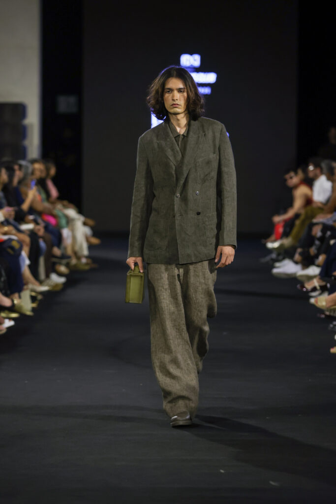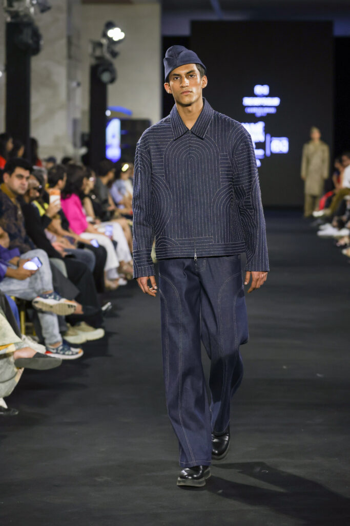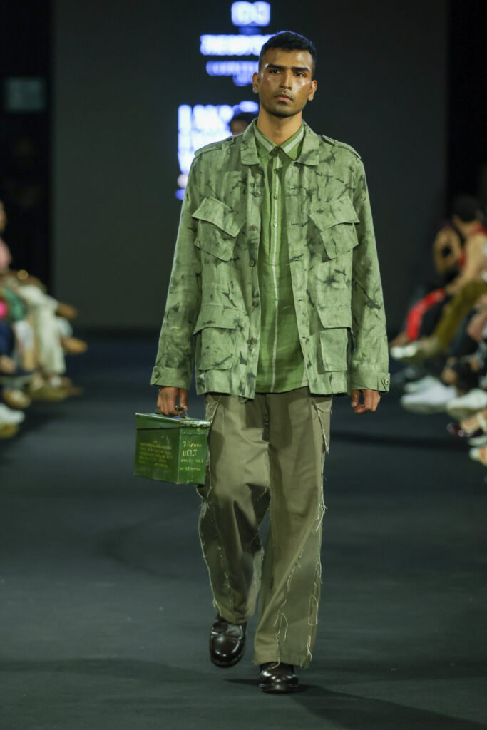 Channelling the theme, “absence is presence” through Centograph, how stone texture fades over time, chips off, decays, displayed in linen, along with cold pigment dyeing. His bag designed like the India Gate is fully functional and usable, resembling the arches, used as a recurring motif through camouflage to crochet. Sometimes as a geometrical element that is hand embroidered, or patchworked.
