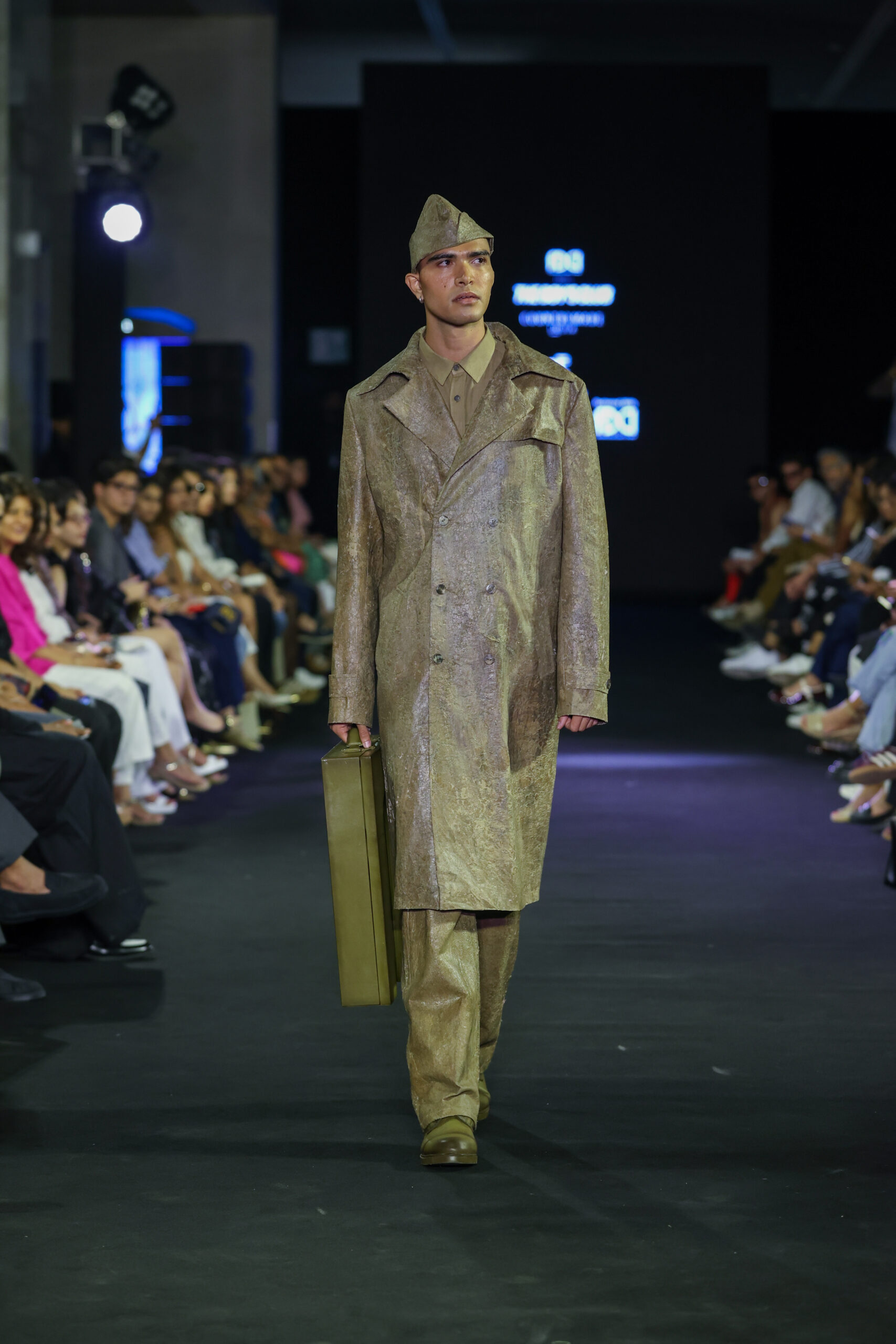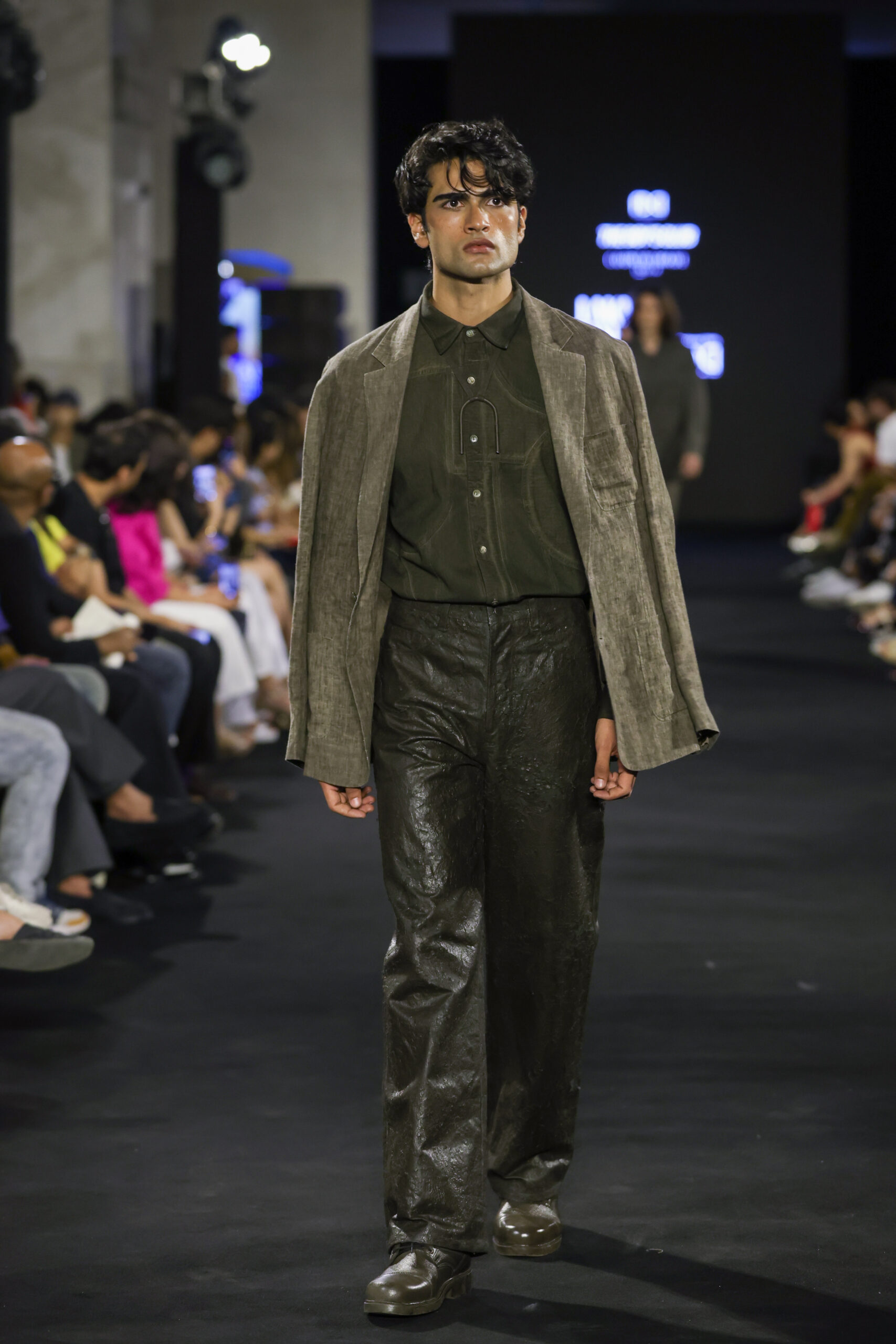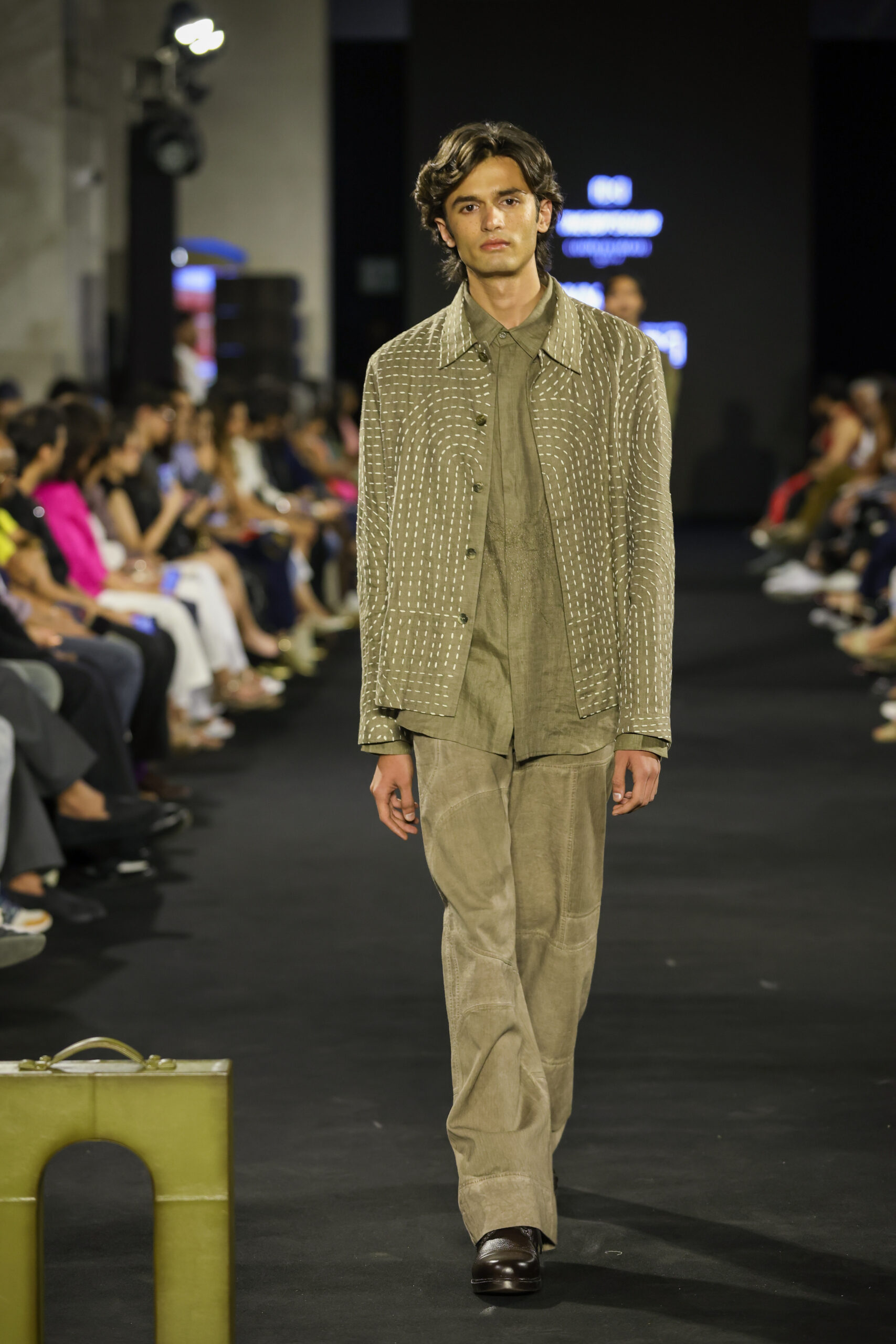 Channelling the theme, “absence is presence” through Centograph, how stone texture fades over time, chips off, decays, displayed in linen, along with cold pigment dyeing. His bag designed like the India Gate is fully functional and usable, resembling the arches, used as a recurring motif through camouflage to crochet. Sometimes as a geometrical element that is hand embroidered, or patchworked.