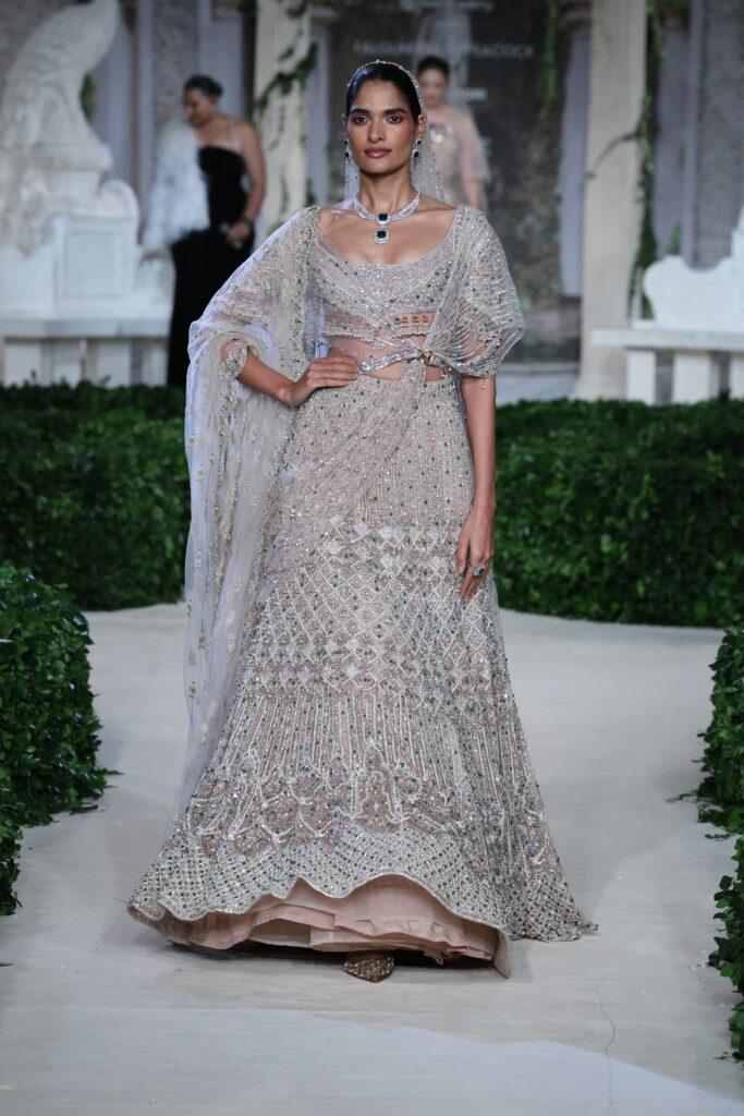 Live music always has its advantages—and fashion show veteran singer Vasundhara Vee with a booming voice took charge (she has done shows with Ashish Soni, Ravi Bajaj, FDCI, Sabyasachi). Vee crooned jazz as La Vie En Rose (Edith Piaf), Dream a little dream of me (Doris Day), At Last (Etta James), A Thousand Years (Christina Perri), and L-O-V-E (Nat King Cole) made sure the hints of woven saris got a fleeting representation in an otherwise tornado of embellishments.
