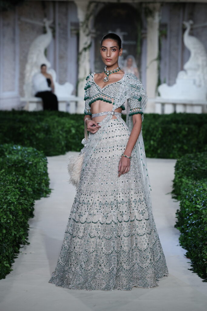 FSP had men with diamond danglers, capes in ink blue were larger-than-life; women flaunting faux feather boas, an avalanche of sequins, it was as if everything was crystallised. They skilfully combined their two loves– sequinned women perched on two stone peacocks, zardosi feathers languidly sprawling on lehengas, if you switch off the lights you can see an FSP outfit from afar.