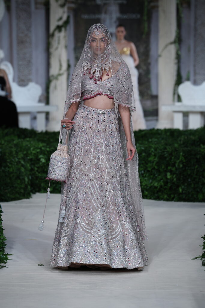 It makes us believe too much shine is never enough, in this invasion of an army of glitter were delicate pearl trimmed veils.The favourite undoubtedly was Archana Akhil Kumar in high waisted boyfriend jeans worn with a fully sequinned tunic and white pussy bow blouse which will soon become everyone’s go it-multiplicity of use. In FSP style, the glowing brooch clinched the tunic as models wore multiple mogra braids, the smell wafting through the Taj Palace Hall.