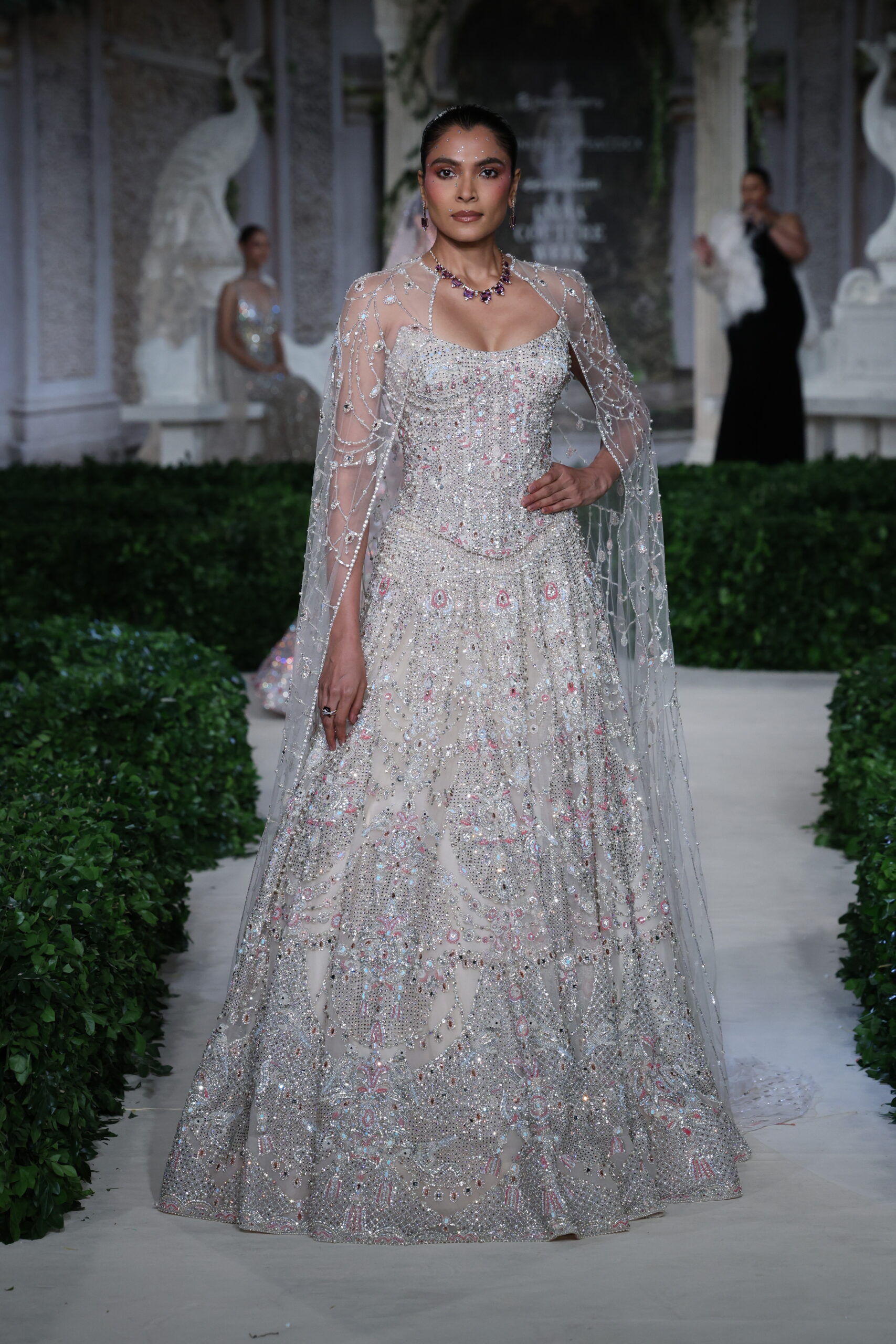 FSP had men with diamond danglers, capes in ink blue were larger-than-life; women flaunting faux feather boas, an avalanche of sequins, it was as if everything was crystallised. They skilfully combined their two loves– sequinned women perched on two stone peacocks, zardosi feathers languidly sprawling on lehengas, if you switch off the lights you can see an FSP outfit from afar.
