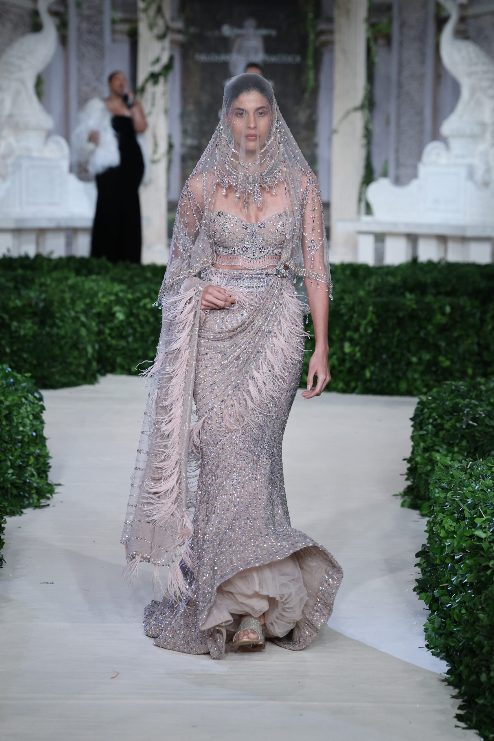 Live music always has its advantages—and fashion show veteran singer Vasundhara Vee with a booming voice took charge (she has done shows with Ashish Soni, Ravi Bajaj, FDCI, Sabyasachi). Vee crooned jazz as La Vie En Rose (Edith Piaf), Dream a little dream of me (Doris Day), At Last (Etta James), A Thousand Years (Christina Perri), and L-O-V-E (Nat King Cole) made sure the hints of woven saris got a fleeting representation in an otherwise tornado of embellishments.