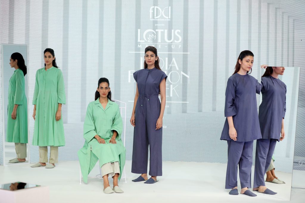 In continuation of this theme, Dhi, by Ankita and Anjana Bhargav hoped to show the need for simplicity, where bottle greens met ash greys in a very Zen-like line. White seems to be the colour of choice and small details are making a big impression this season, like the tiny embroidered flower carelessly placed on the sleeve of a dress. It is goodbye to any frills or embellishment for the duo, who has used the bunched up technique at the back of jackets to give fluid structure. The mood was tone-on-tone, and the folded and pleated pants as well as button down dresses whispered austerity. Asymmetry, interesting stitching details, mirrored what the word is moving to —- a deeper connection with oneself.