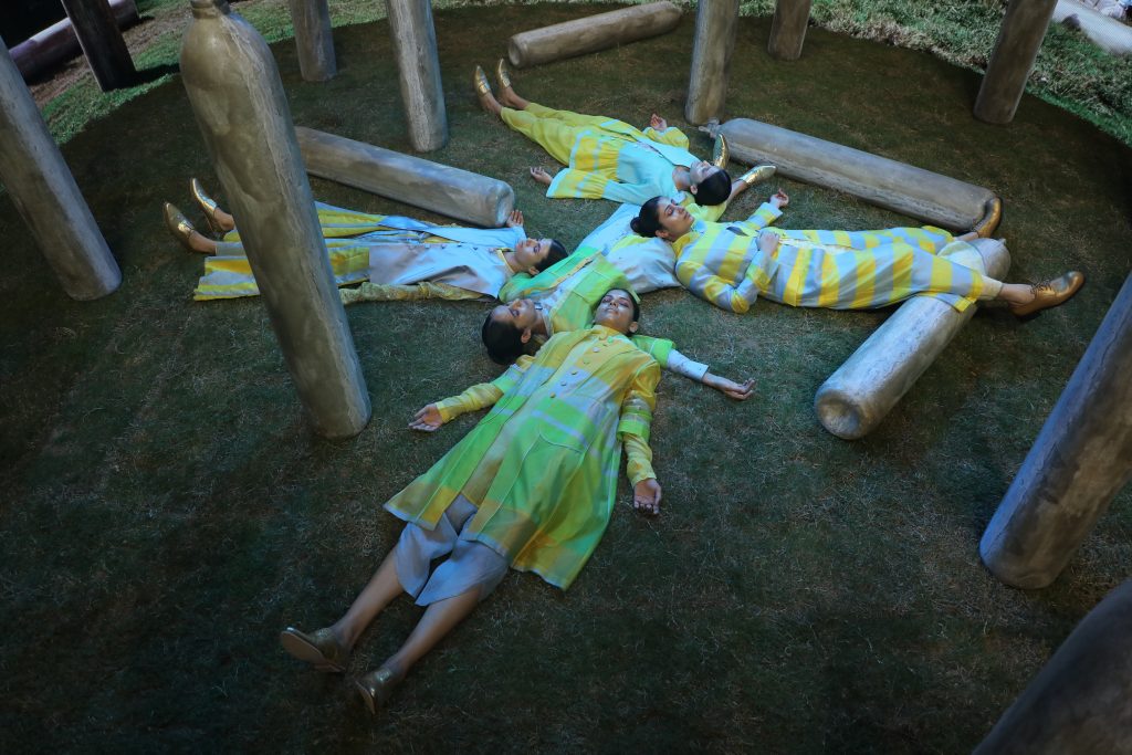 Rajesh is a man of very few words, and those utterances are often after much persuasion, he is a believer in the philosophy, “let the clothes do the talking”. But this time, he announced the desire of humankind to not chase the finish line, but celebrate the present in its entirety. As his natural-dyed, buttery smooth jackets which came emblazoned with polka dots, translucent dhoti pants, inventive layering, and his pyjama style trousers with tie ups, worn by barefoot models showcased his interesting pattern cutting techniques, not on a glitzy runway, but to the tunes of birds chirping in the background. It reminded us all, that nature is the real master. The equaliser!