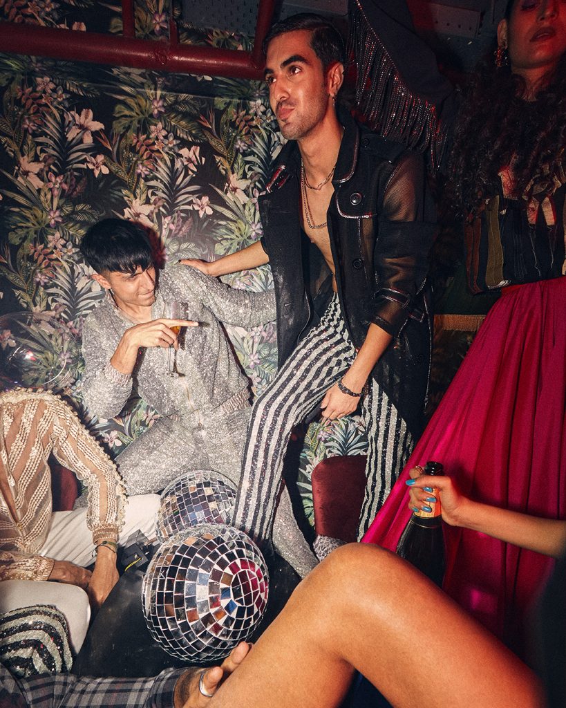 This year, what emerged as a beloved silhouette is the long jacket fastened with a belt, when Prreeti Jaiin Nainutia included it in her repository she gave it a trippy and zippy avatar with linear surface texturing.  Beads and tassels, a 70s staple, was revived and in this mix velvet pant suits in olive green with placement embroideries added, to channel a kind of Rod Stewart spirit. Glittering bodycon dresses with metal and thread work let the light in on a black canvas.