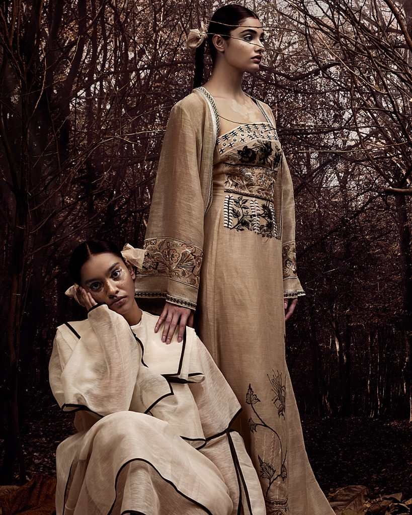 Thus, Samant Chauhan let the freckles, dried leaves and an ebony and ivory palette as well as the Frida Kahlo-esque braids rule. Small touches made a big difference in the embroidered Victorian pleated collars and ruffled dresses.  Beautifully embroidered capes, full skirts with a refreshing no make-up look brought in child-like innocence. As we dress now for our own pleasure, fashion is losing that gilt-edged swagger and is embracing resilience.