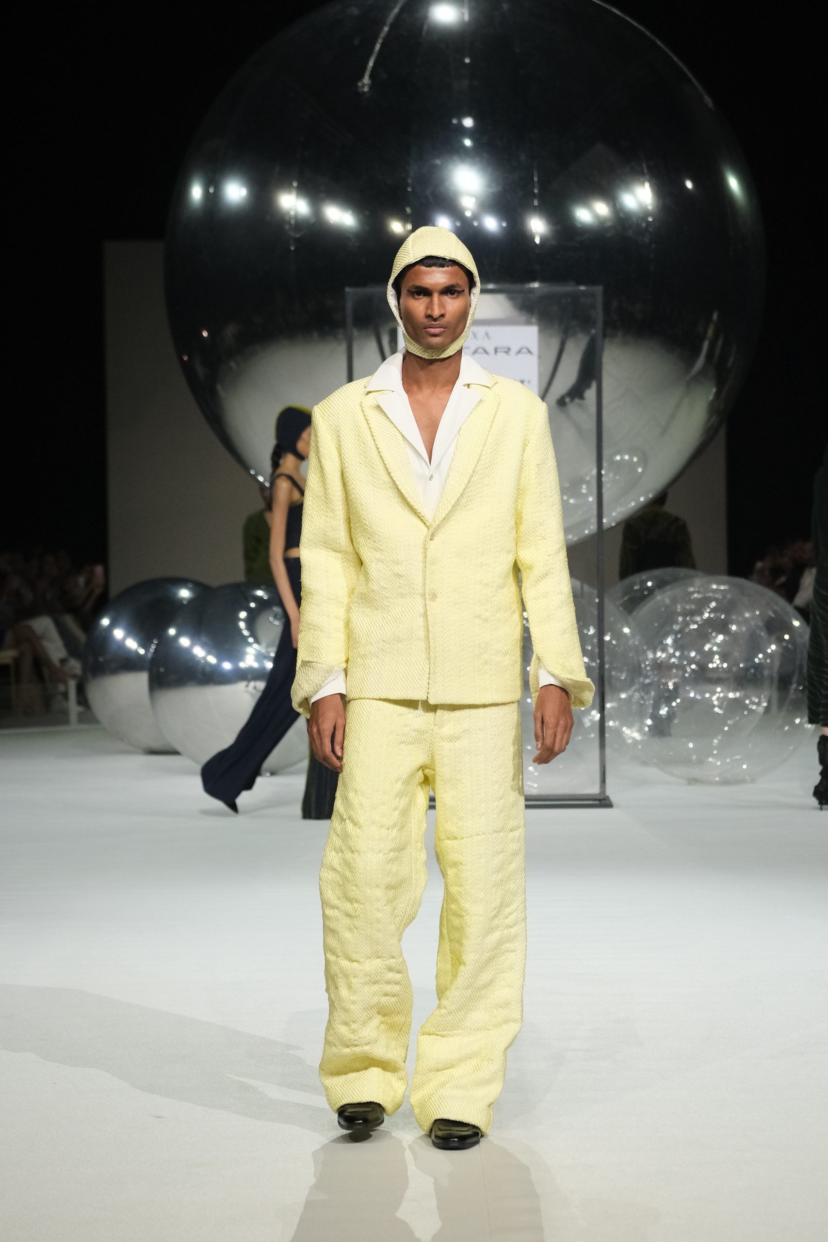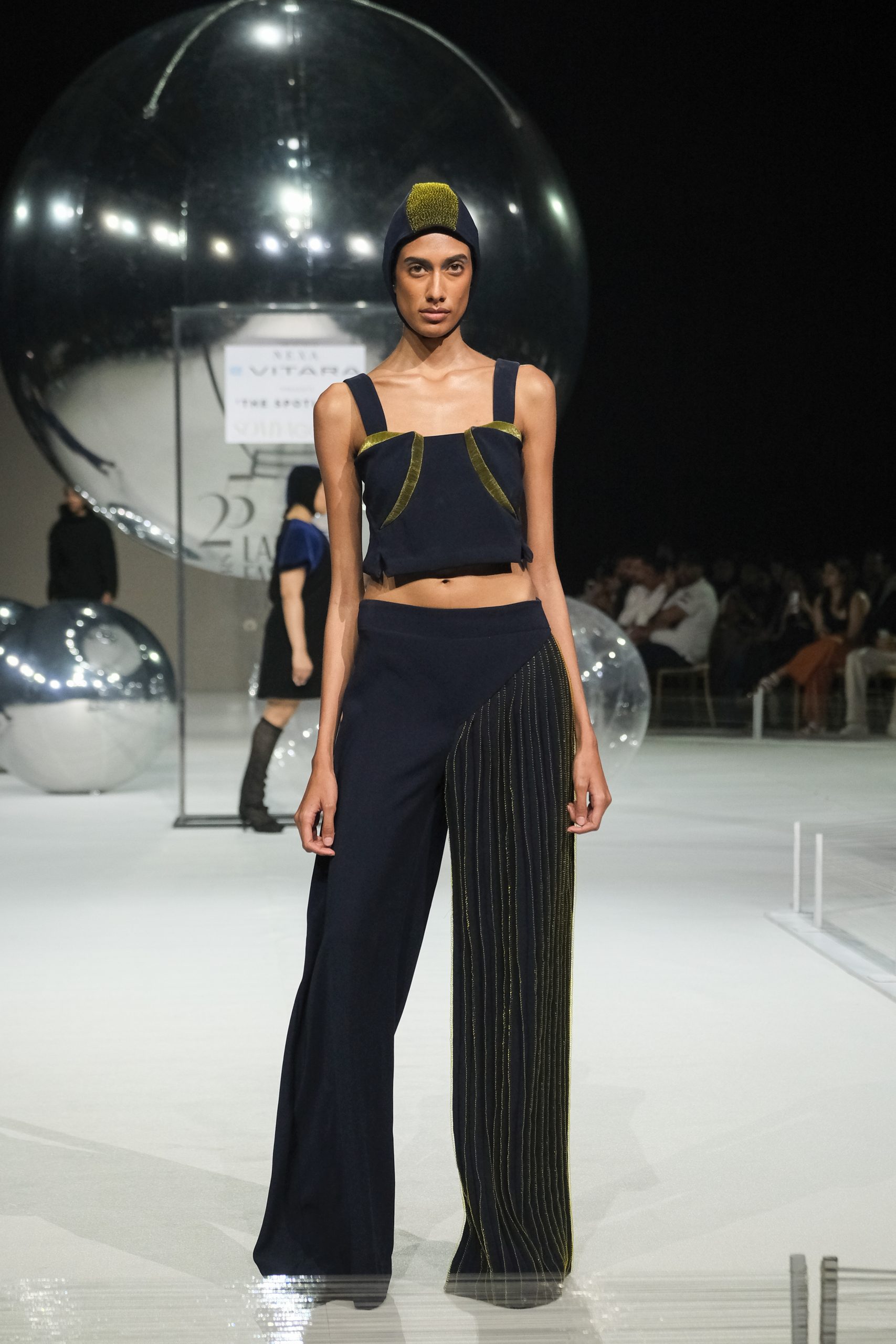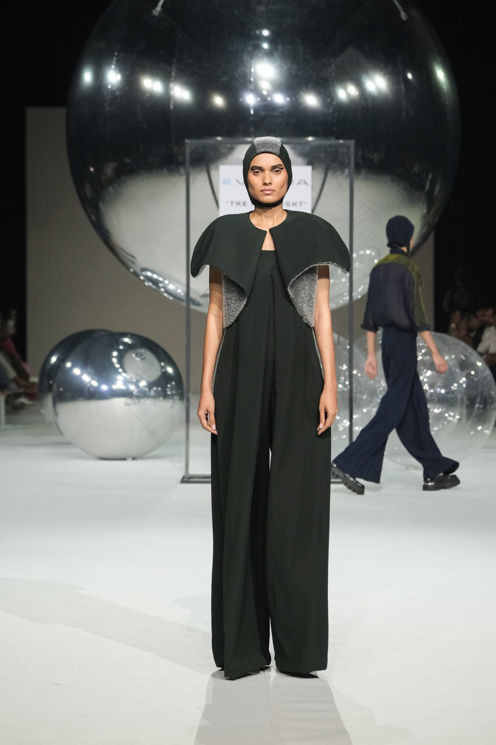 “I understood the business aspects from my father—production to marketing, how he used to communicate with clients, maintain a relationship, he taught me well,” she smiles adding, her first show was in GenNext 2022 at LFW. Her USP remains repurposed transparent cords, made from surplus leftover fabrics, crafting new textures, as she stuck to classics—charcoals, electric blues, ombré and mori greens giving each look a Star Trek look, a kind of “transport me back to the mothership” with the set resembling a futuristic stage. She experiments with PVC, metallic wires, horse hair sheets, jute, and cotton cords, using also hemp, bamboo, Bemberg, and crystals sometimes for a constructed jacket.