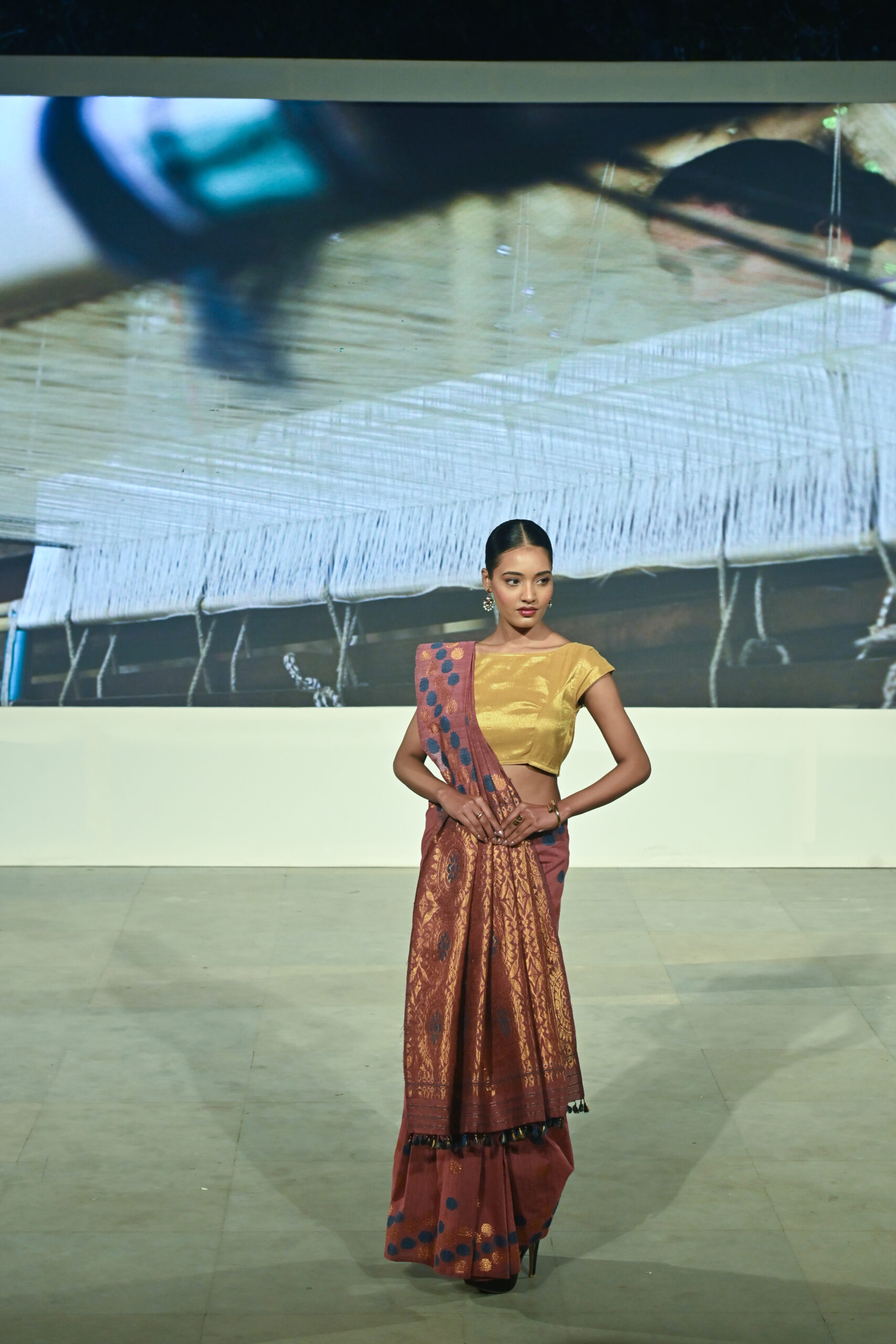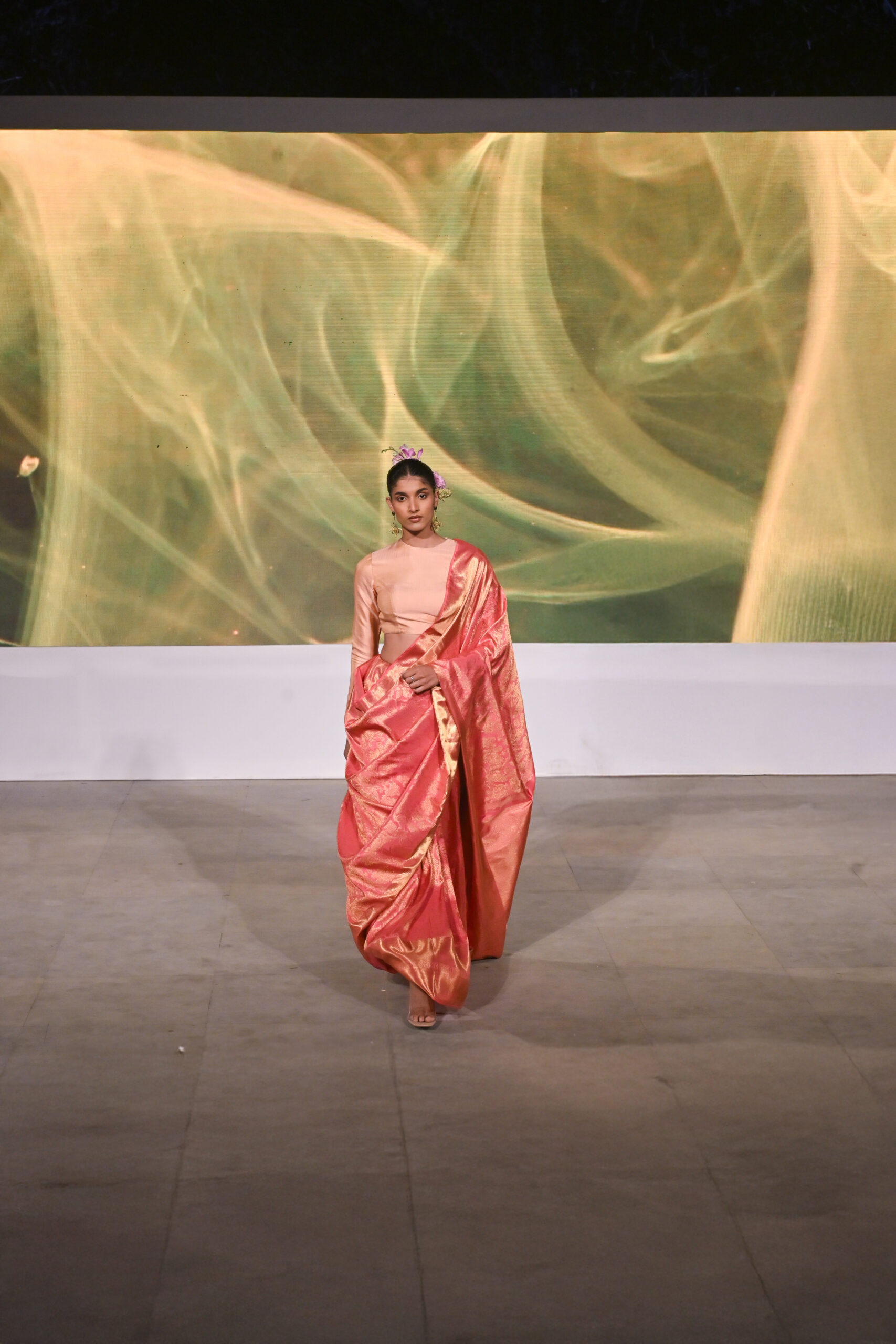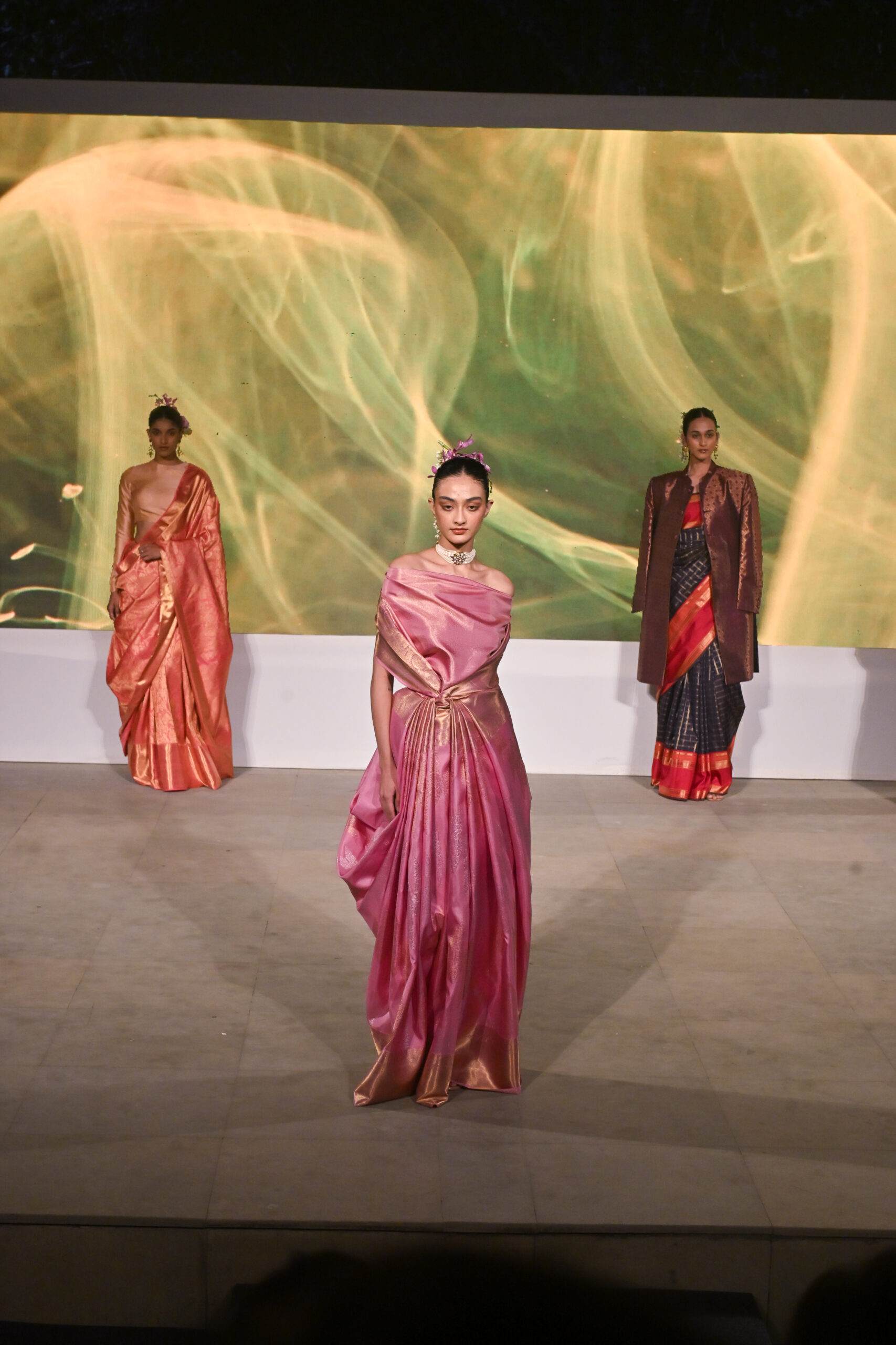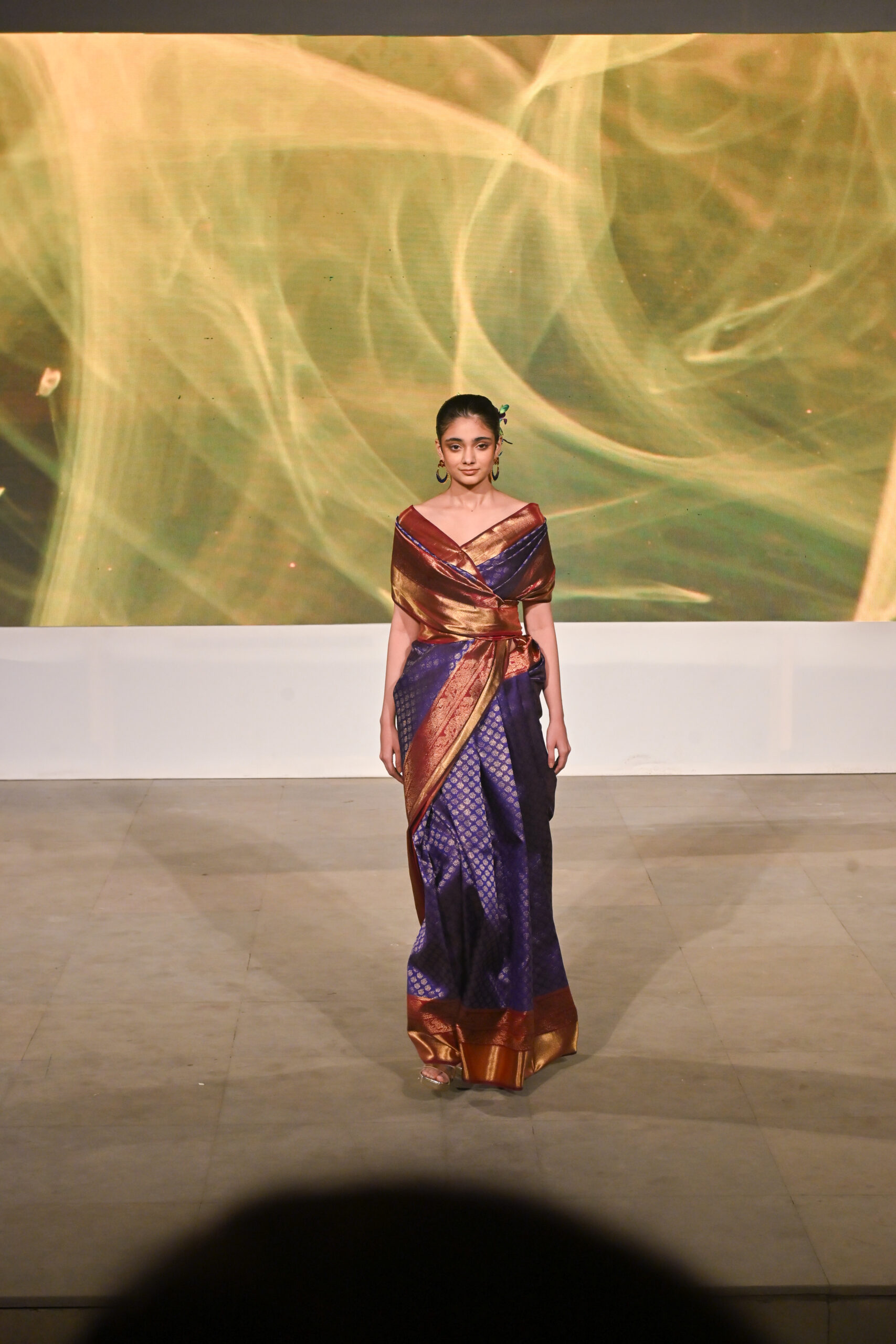 Adding to the immersive experience, the presentation was interspersed with classical dance and singing performances, seamlessly weaving together movement, music, and textiles, andreinforcing the cultural context of the saree as both attire and art form.