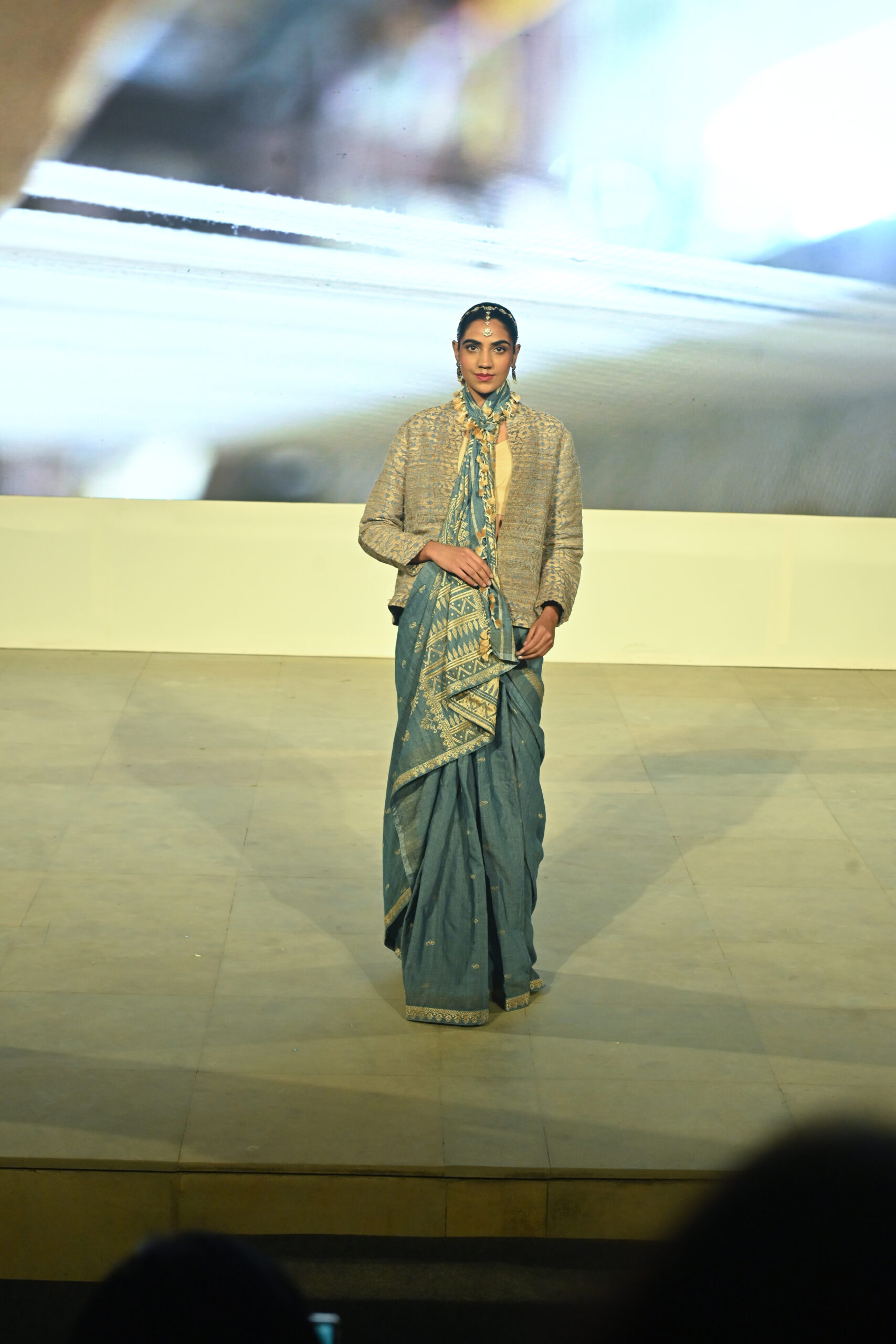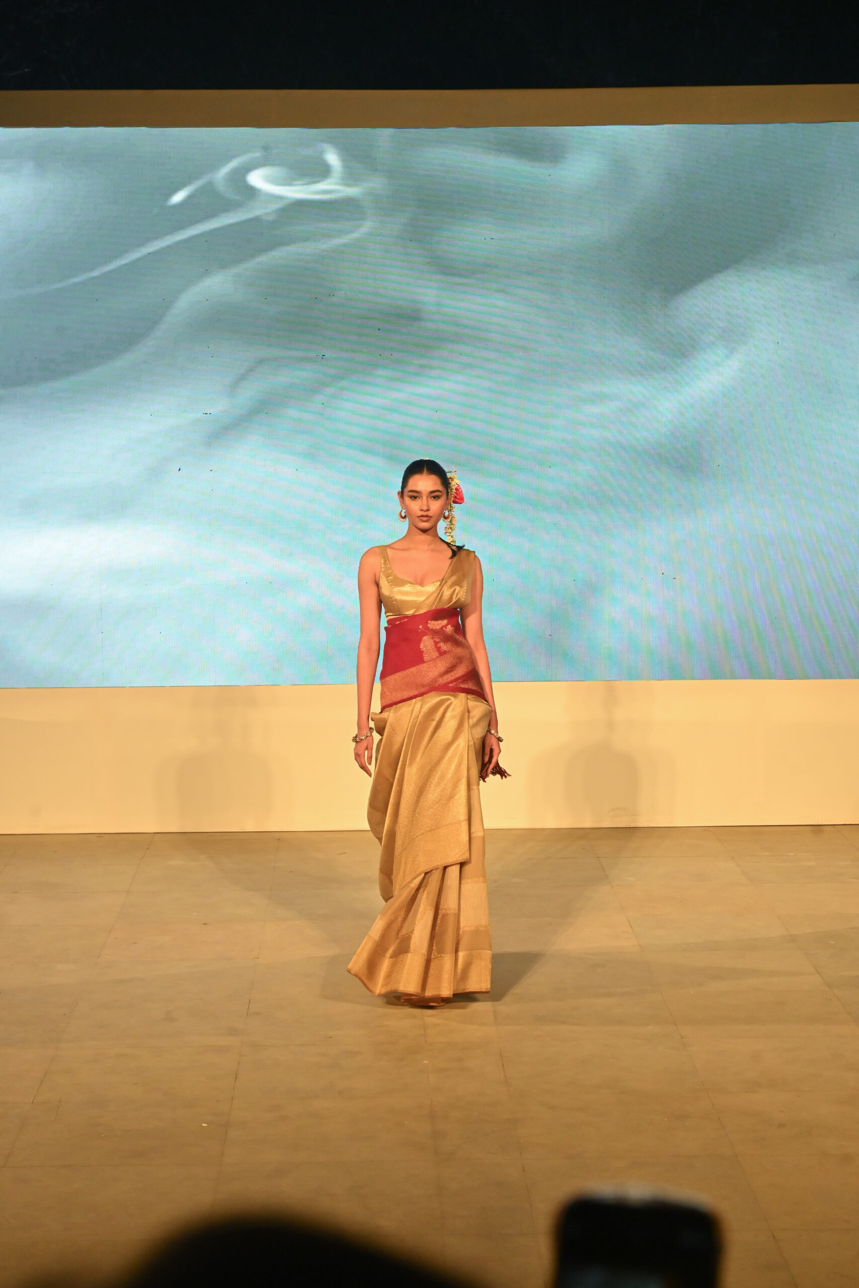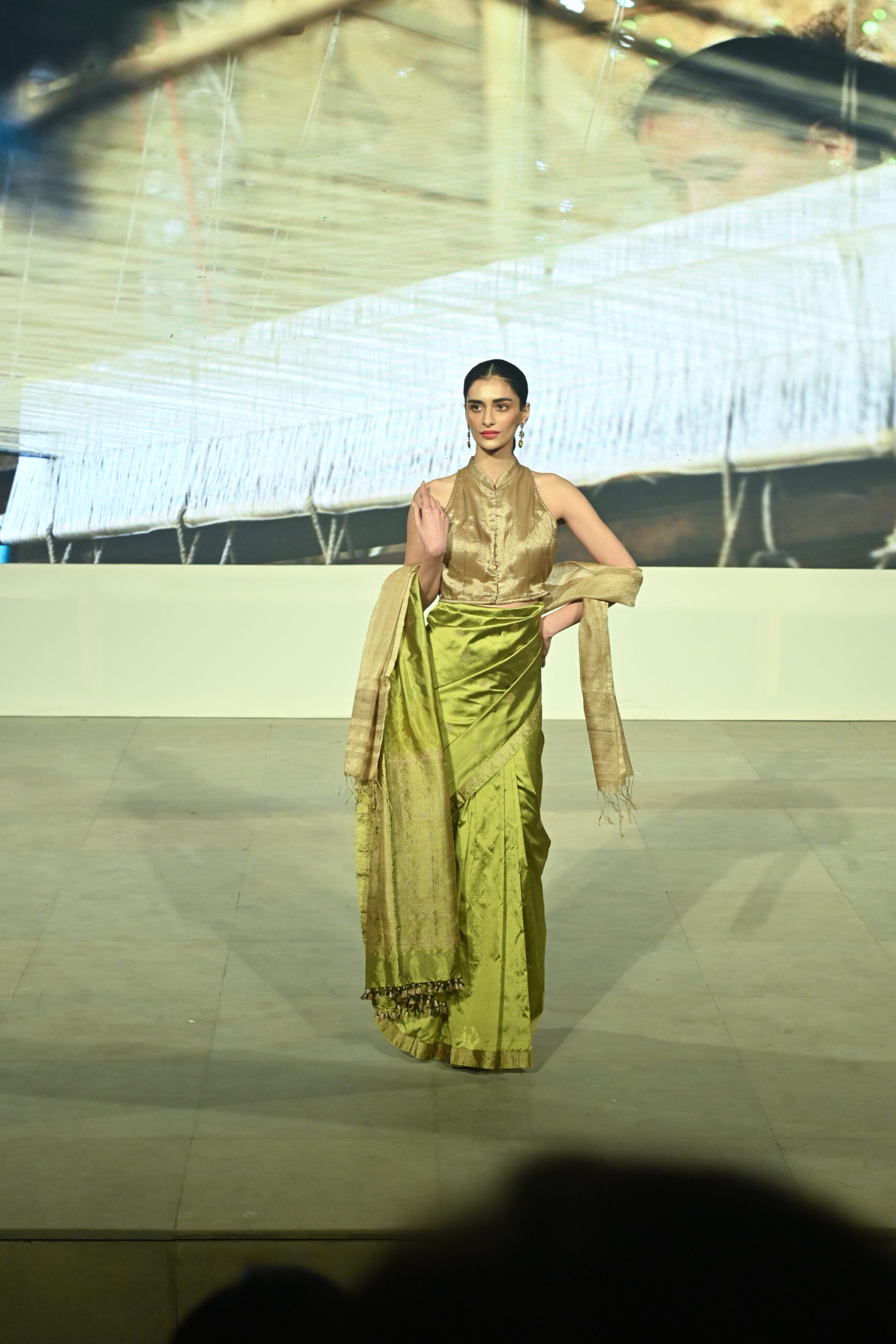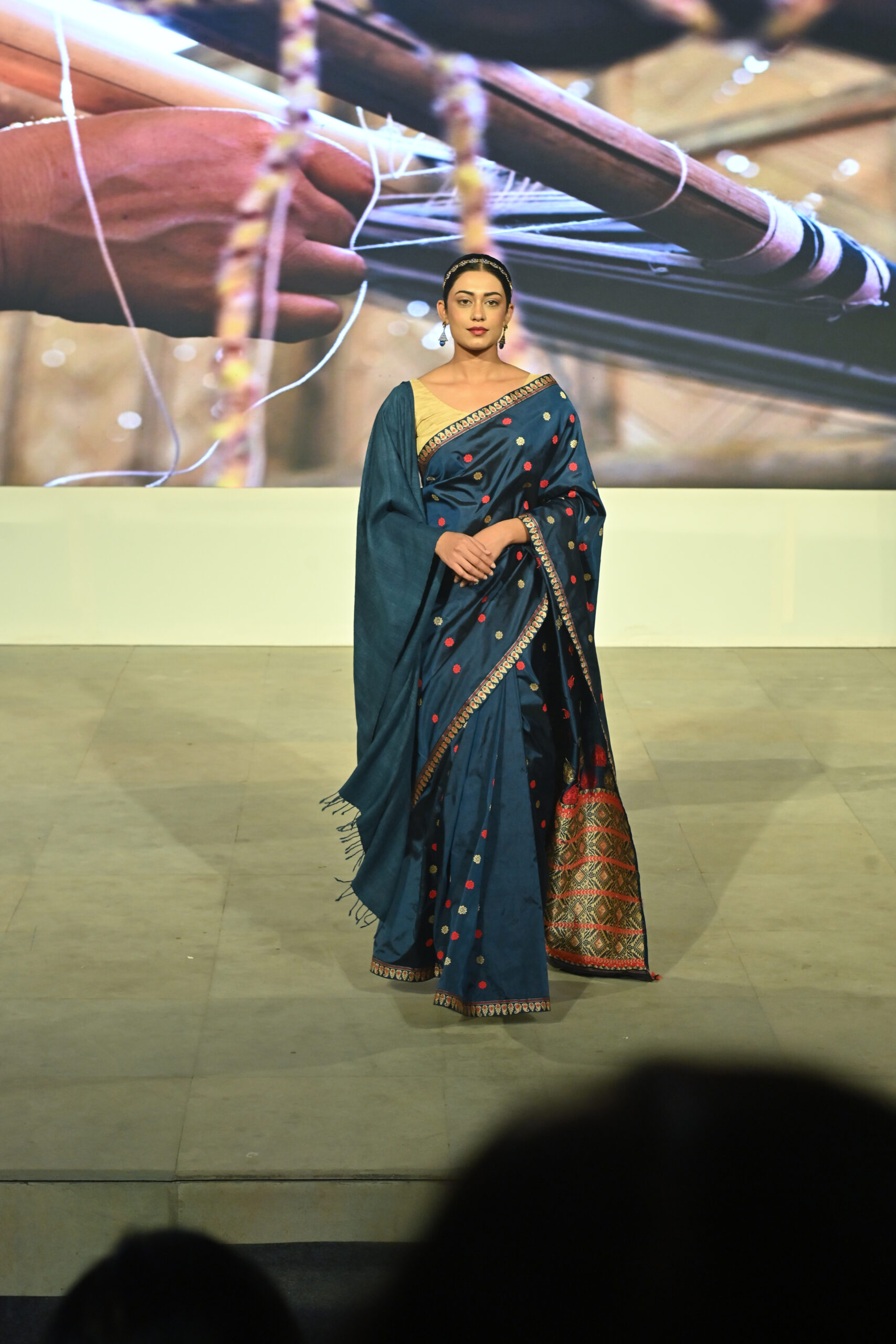 Adding to the immersive experience, the presentation was interspersed with classical dance and singing performances, seamlessly weaving together movement, music, and textiles, andreinforcing the cultural context of the saree as both attire and art form.