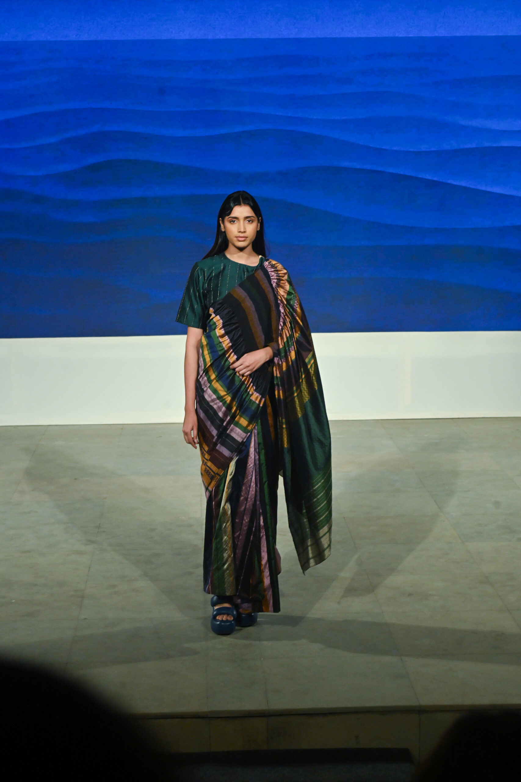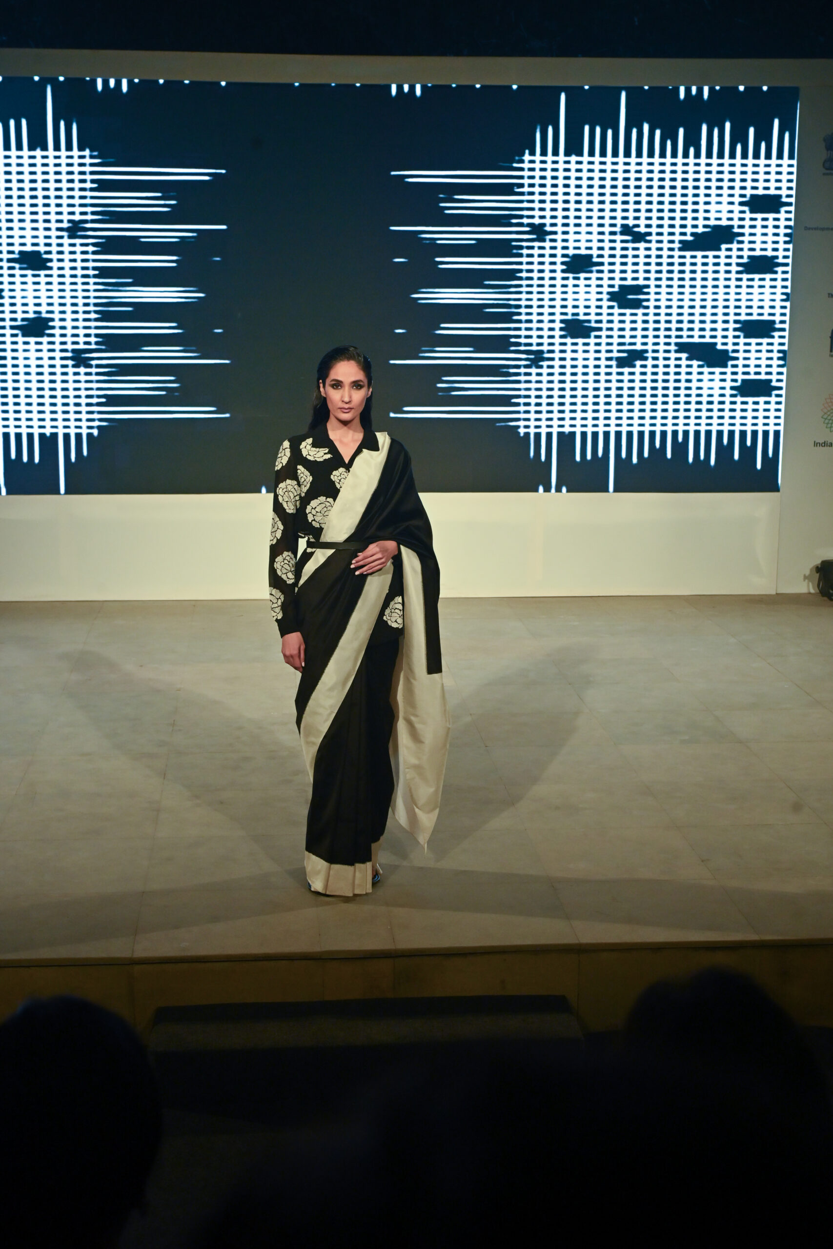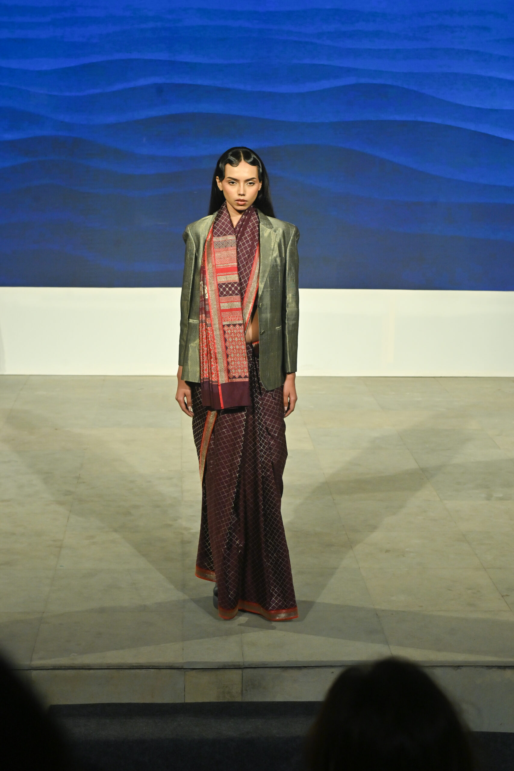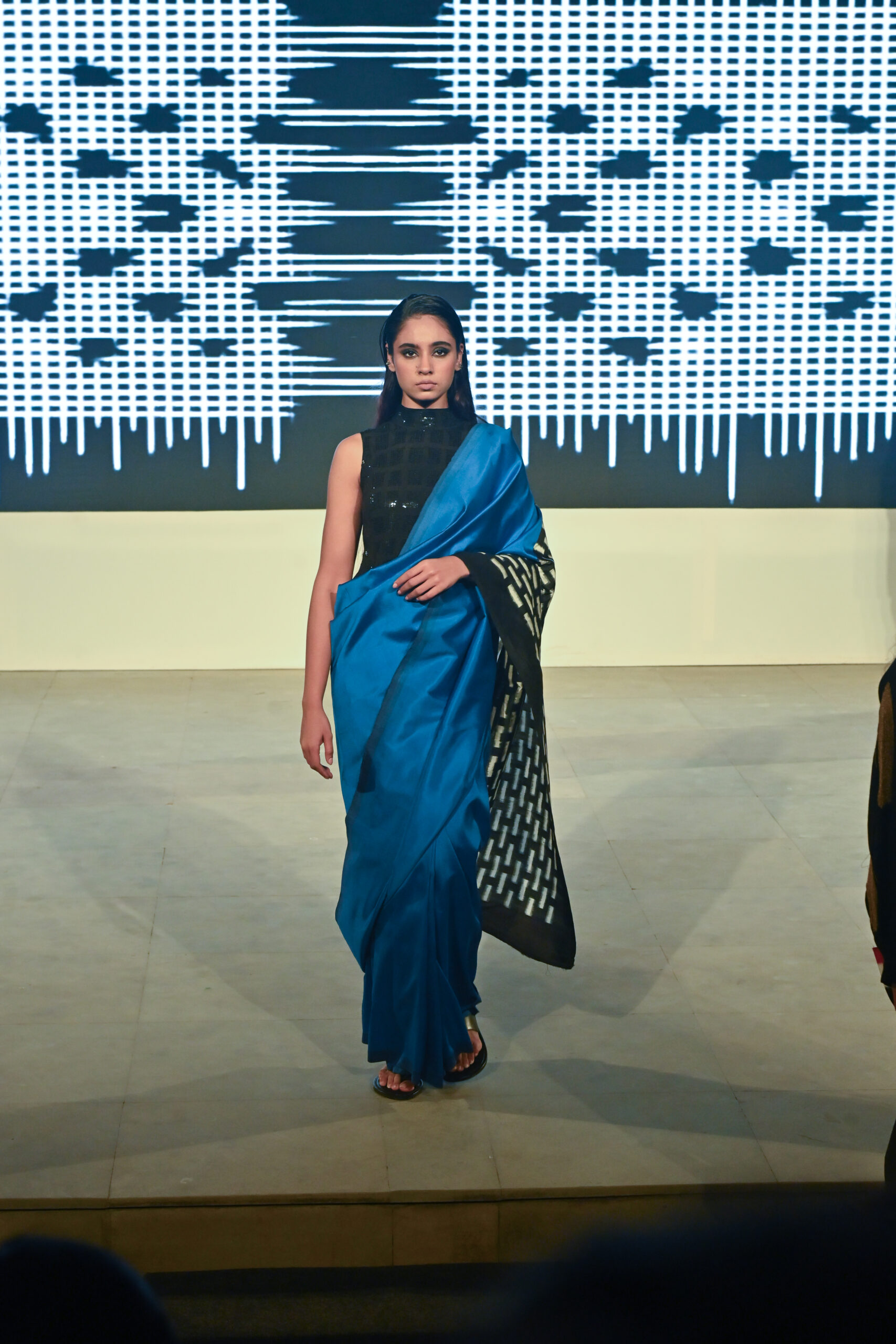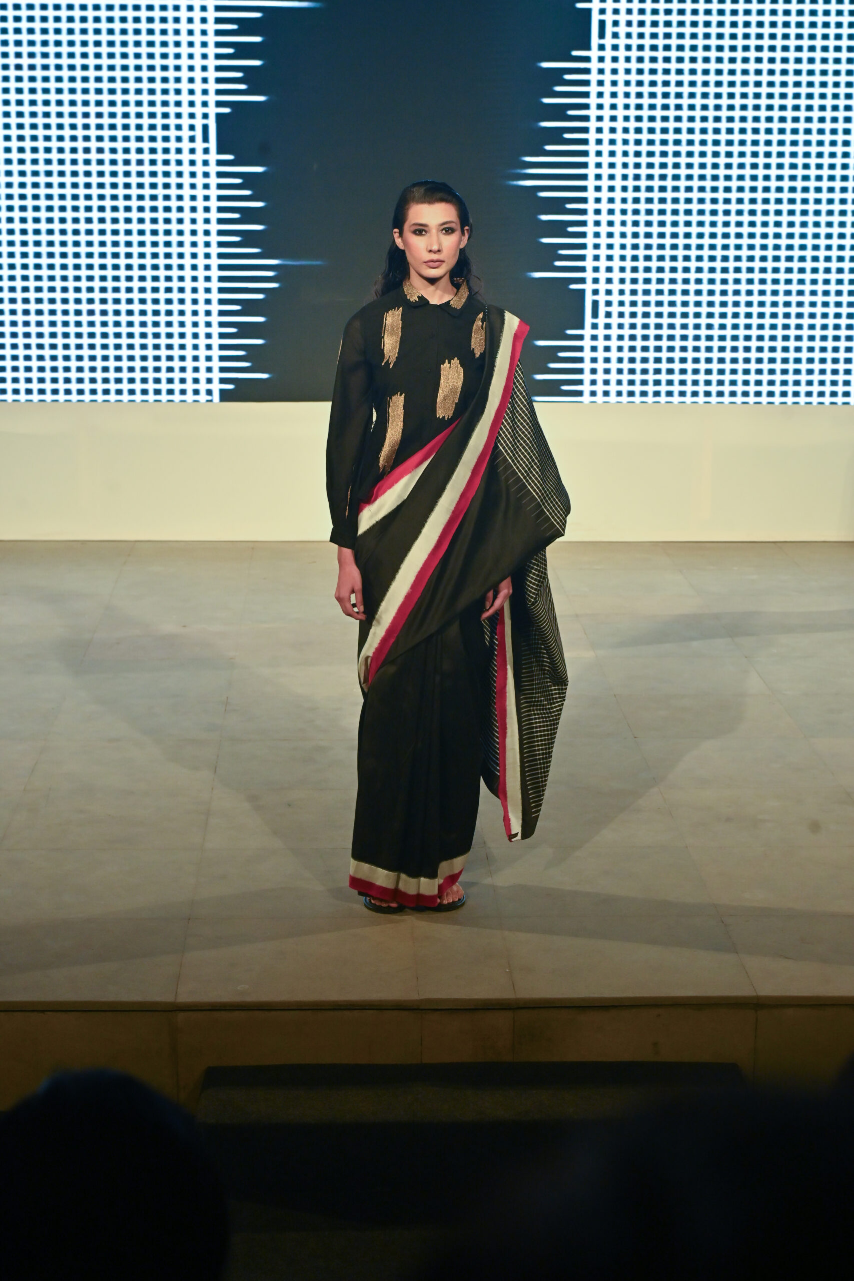 Adding to the immersive experience, the presentation was interspersed with classical dance and singing performances, seamlessly weaving together movement, music, and textiles, andreinforcing the cultural context of the saree as both attire and art form.