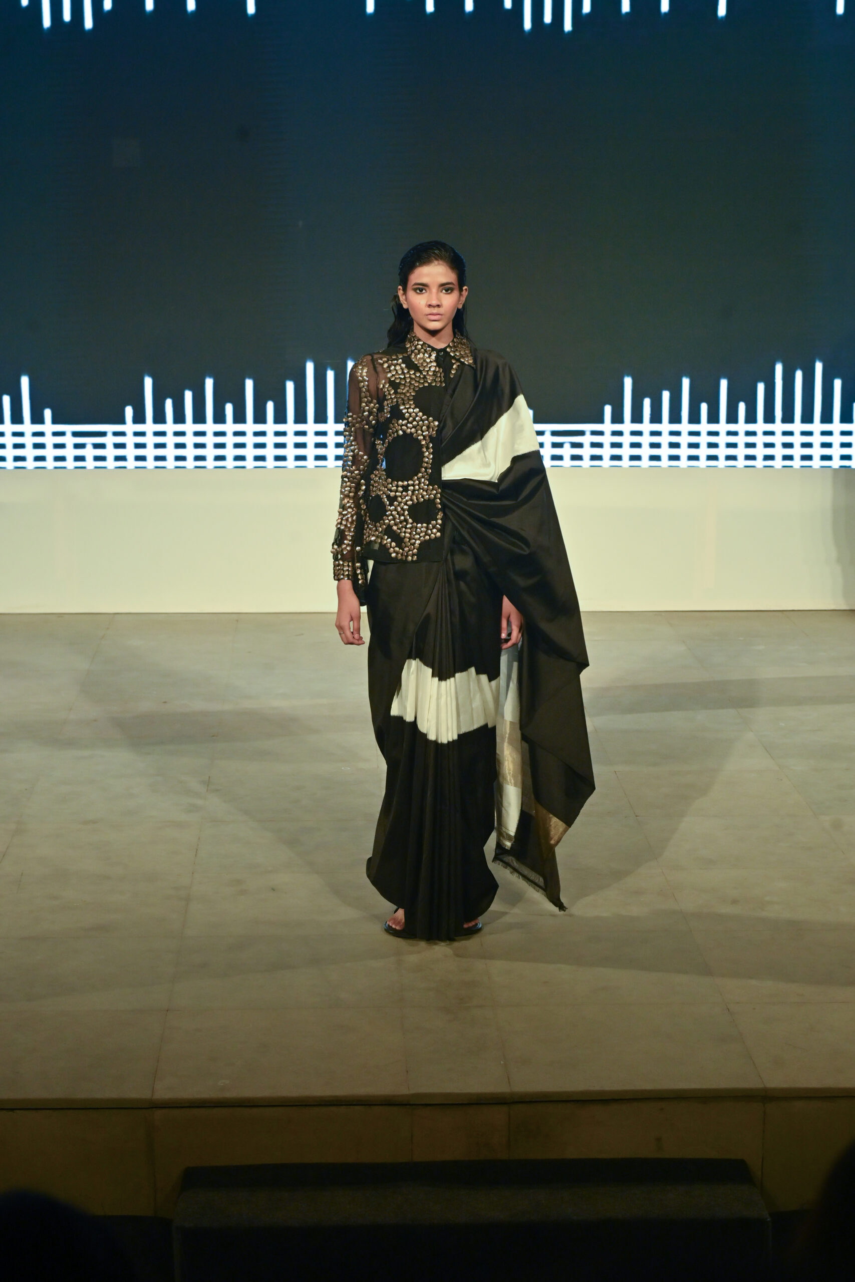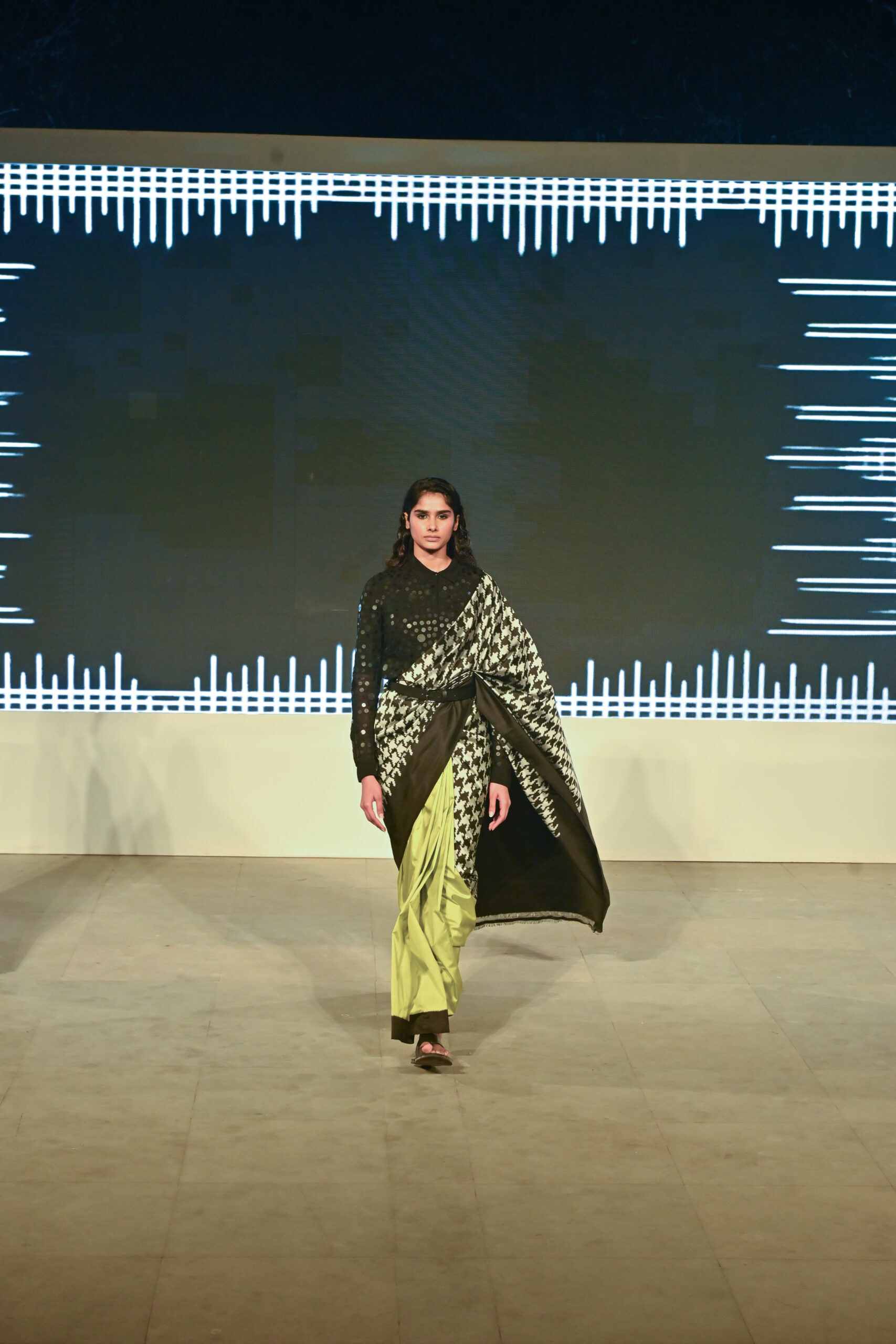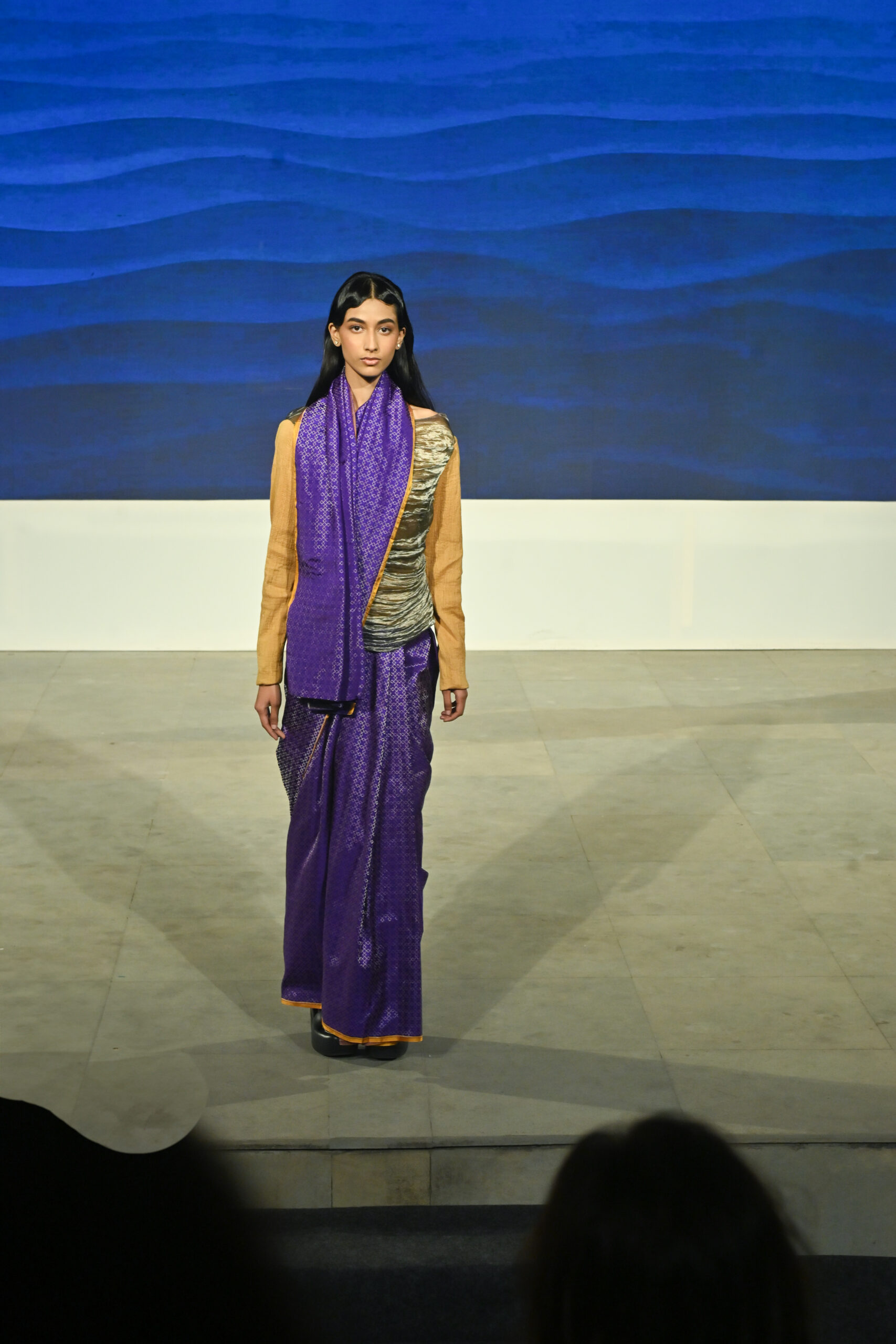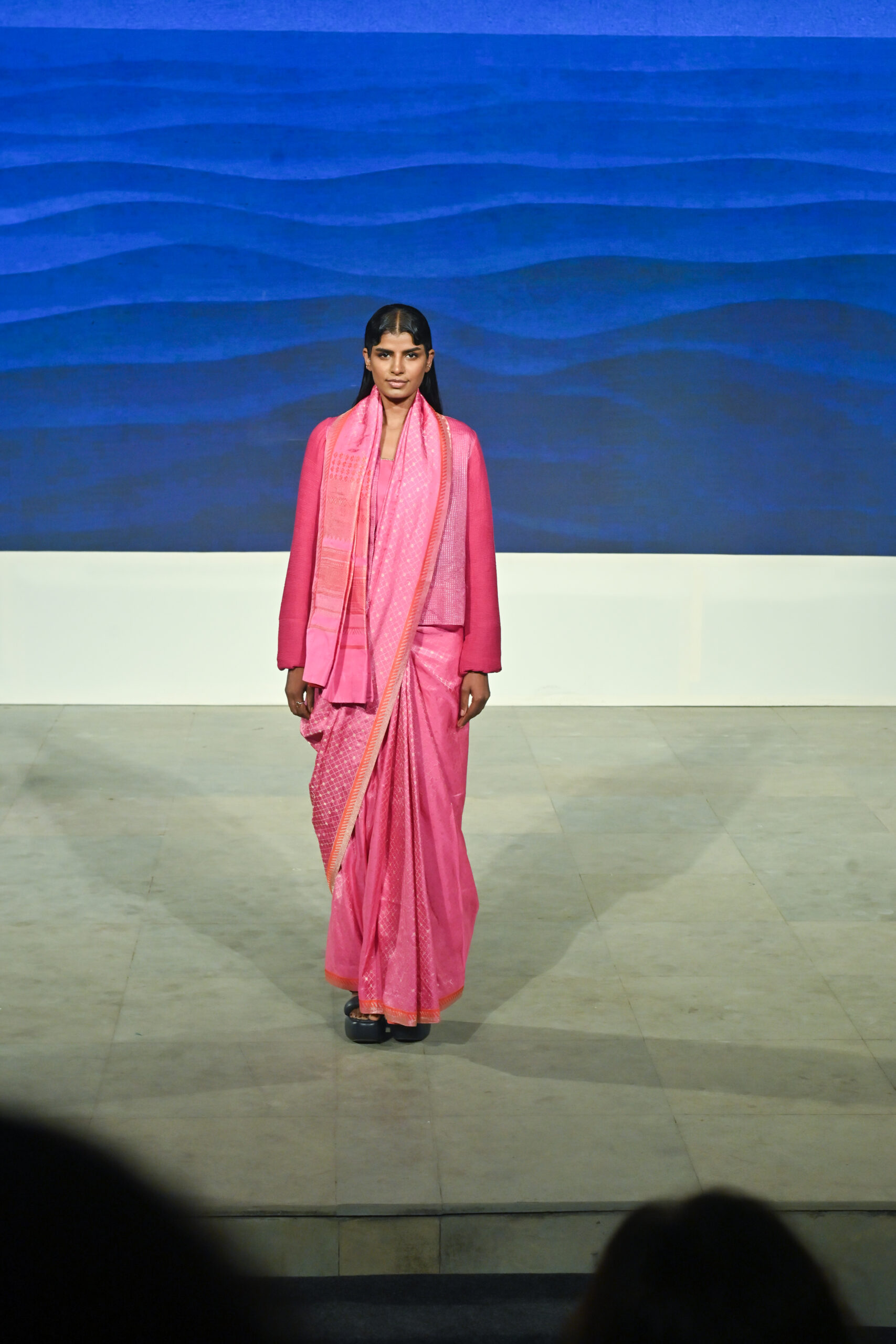 Adding to the immersive experience, the presentation was interspersed with classical dance and singing performances, seamlessly weaving together movement, music, and textiles, andreinforcing the cultural context of the saree as both attire and art form.