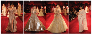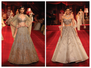 In bridal couture, Dolly elevated metallics, but the ubiquitous reds and pinks made an appearance too, and interestingly, the new approach is introducing lehengas soaked gold and silver, laden with zardozi, Swarovski, even though on the shelf they come with double/triple dupattas, Dolly decided it would take away from the show, thus removed them.