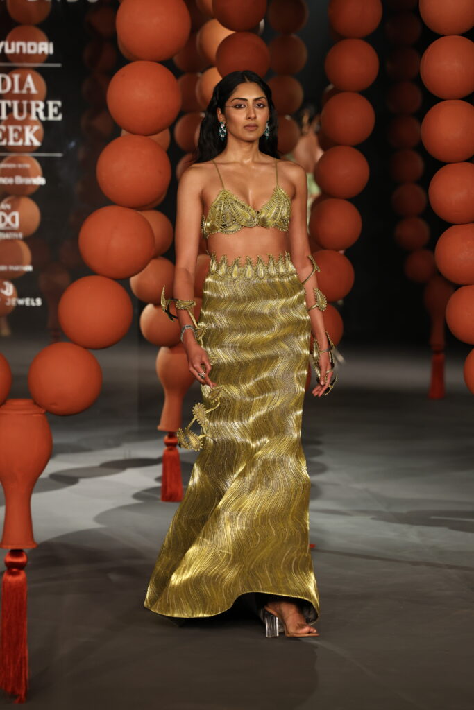 Her inspiration this year has been Banjara tribes and their vivacious jewellery, Dadu has done Patola in the past, this year she has fallen in love with Bandhani, the knots, used as an embellishment rather than in whole. “For me fashion is art, so the skirt that we made with metal and steel interlinked inspired by tribal jewellery, a chainmail structure, took one month to make after several failures, just one piece,” she smiles.