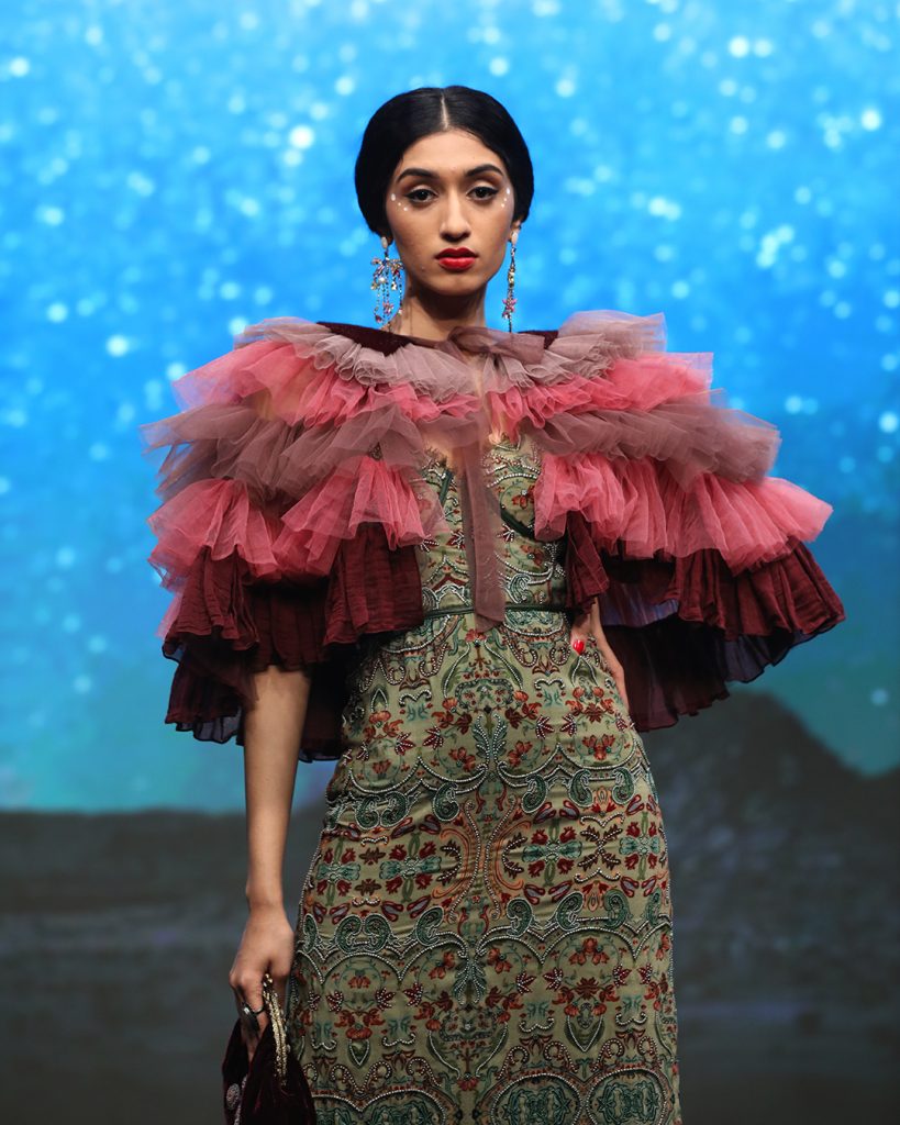 If this season you are thinking boho, Nidhi Yasha has the answer, she played with tassels in her ode to Sevillana or gypsy dress as lace intermingled with transparency and floral prints for a relaxed mood. The big, bold, roomy sleeve, tiered capes, flute sleeves and flamenco dancer roses neatly tucked in buns met leather corsets reminding you of a Western set in the 50s with Clint Eastwood waiting to emerge with his outback hat complete with a bullet hole in place. Embroidered shimmering waists rubbed shoulders with high waists, as roomy pants complete with ruffles transported you to a time gone by.