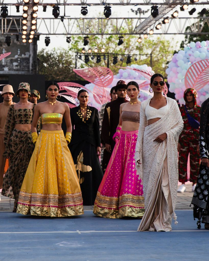 Day four at the FDCI X LFW saw Outryt by Ajio which offered trendy wardrobe essentials at a reasonable price whether it is denims or jute totes. While, the rajah of shine Suneet Varma welcomed the new season of hope, prayer and his extravagant lehengas with sequinned bodices. Hints of mirror work, baby pink lehengas brushed with net and lace as draped cholies, embroidered full skirts in crimson and of course plunging necklines, made their way. Suneet hasnt let the post-pandemic despair keep him away from adding a glimmer of light in his offerings, unapologetically telling us that the human race hasnt lost its will to celebrate the magic called life!