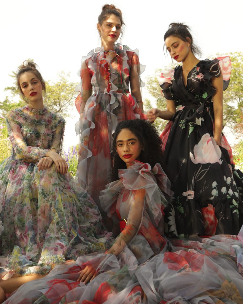 They say white is always right and when you mix it up with florals it makes for an effective summer staple. Sisters Gauri and Nainika made sure we had both in lighter renditions with their swirls and ruffles in place. The bold red lips were in sync with the exaggerated flowers along with chunky belts for cinched waists.