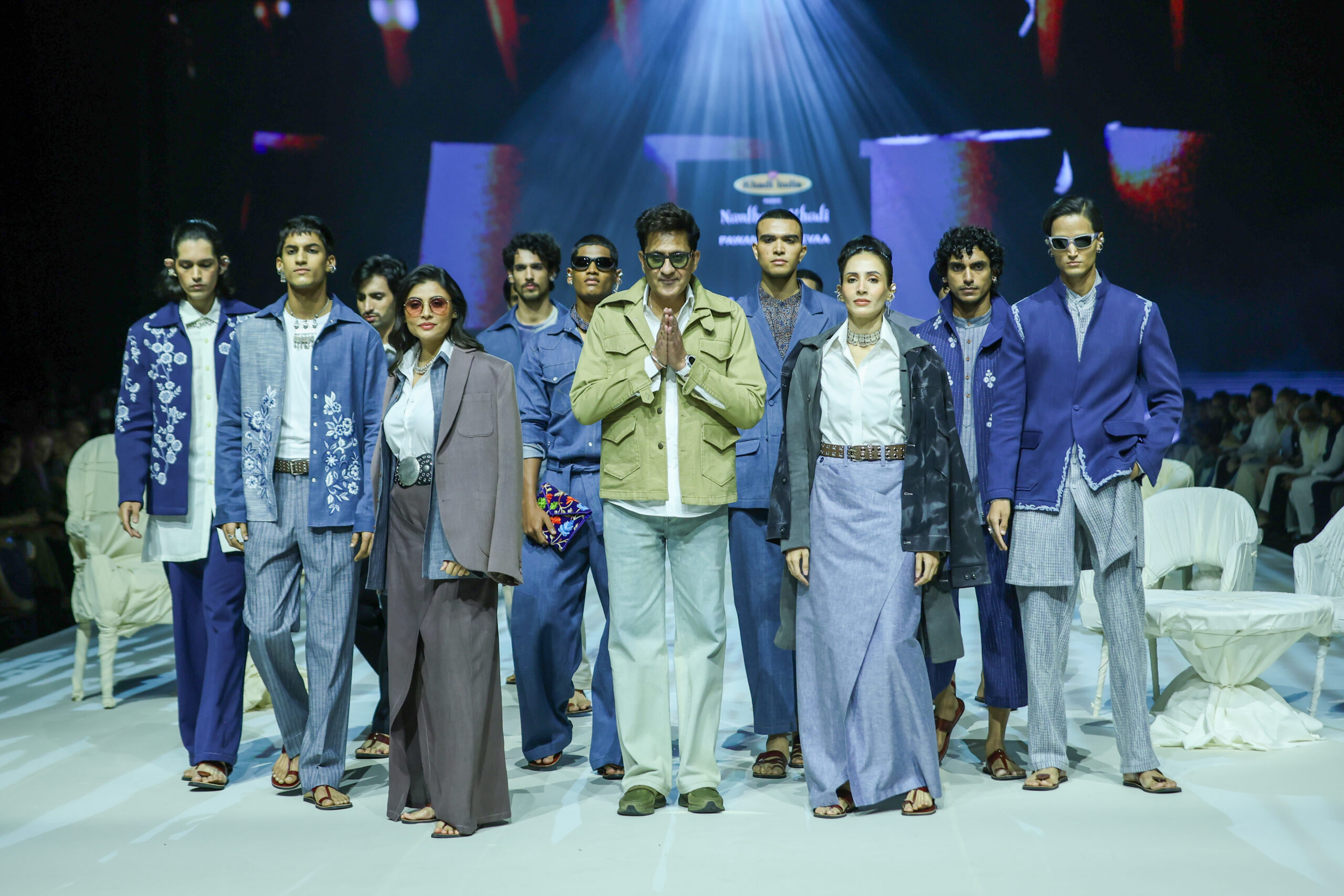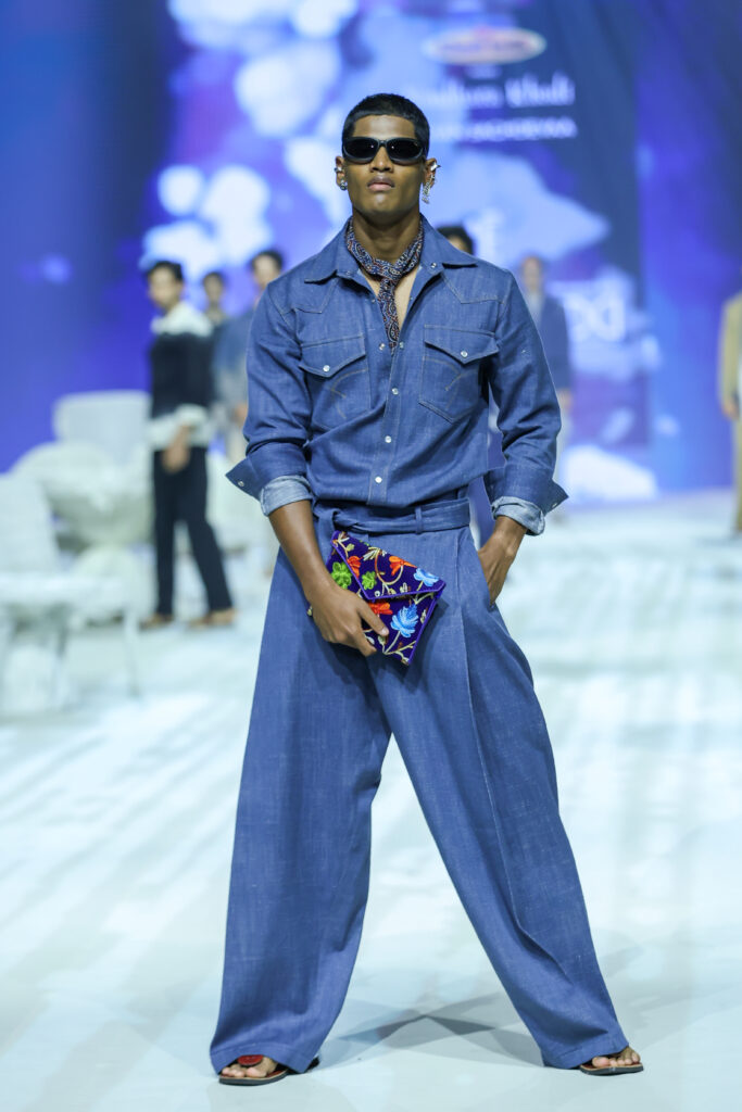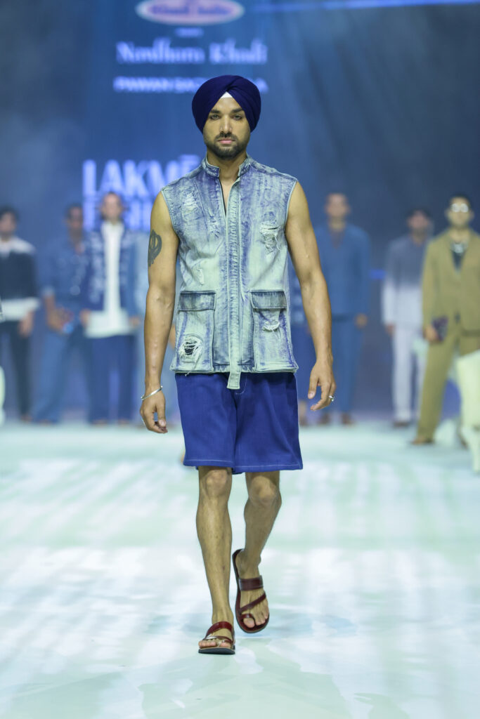 This year for the FDCI NavDhara khadi show, he discovered a loom in Naraina, that crafts khadi denim, the width is 40 metres, (60 metres minimum), not rough, rather smooth as butter, though expensive. His vocabulary is streetwear, relaxed oversized, he decided not to dye the denim, but play with washes-enzyme to sand wash to stone in innovative cuts and finishes.