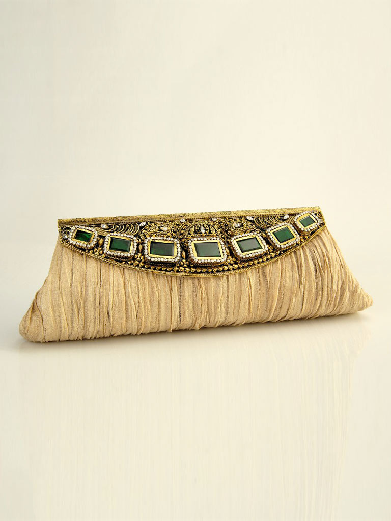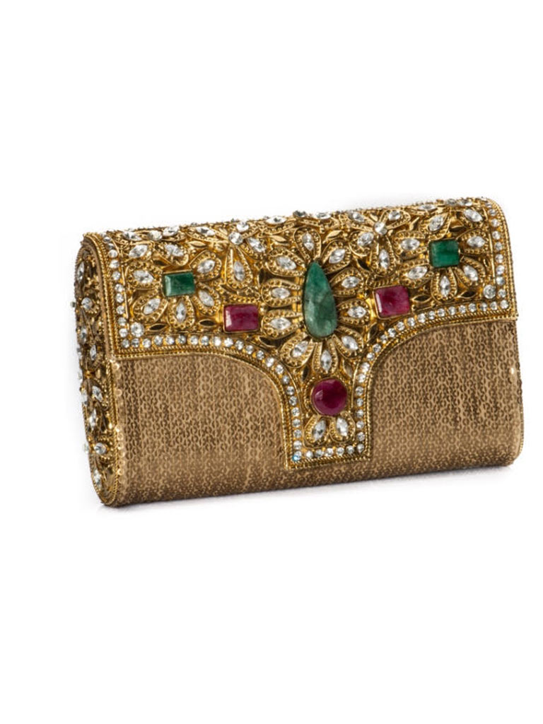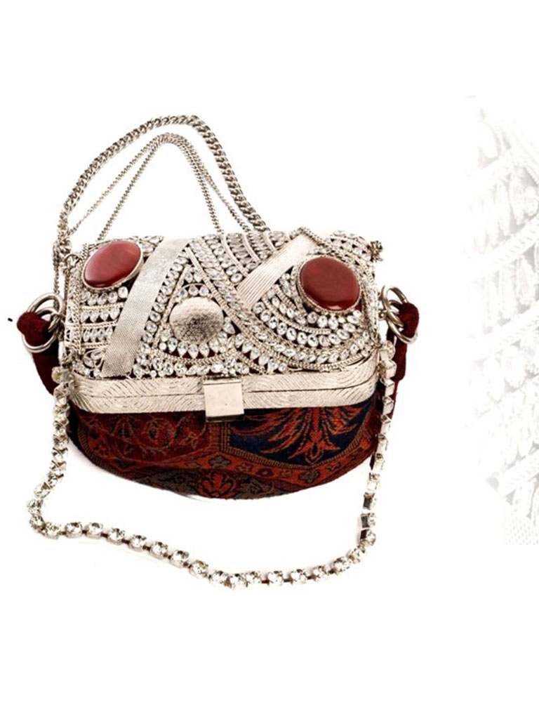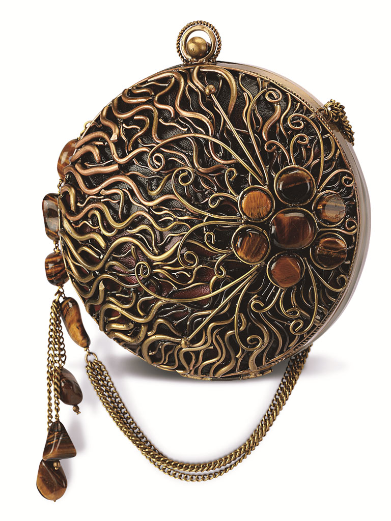A Meera Mahadevia Luxury Handbag is a distinctive blend of brass and copper embellished with wood carvings, marble inlays, silver engravings, semi-precious stones, antique frames, and spiritual emblems manufactured in a versatile metal workshop. Each handbag is detailed to a fine precision using the most artistic manufacturing tool of all time: the human hand.