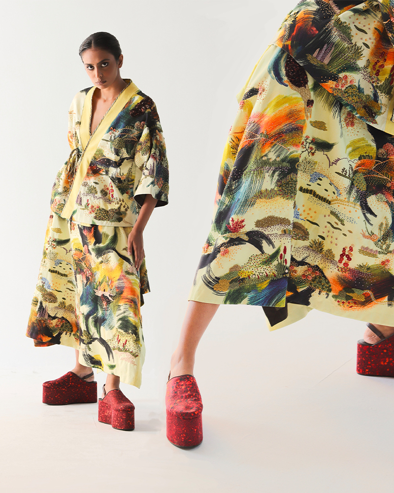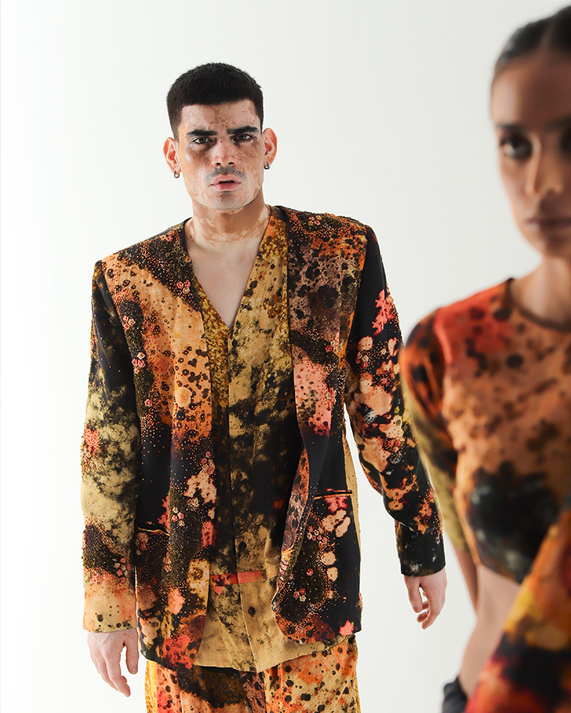 “I would say, just like our skin with its wrinkles and freckles tells a story, I see patterns in everything, each one a reflection of beauty and individuality. I blend these observations with my surreal vision. I have a weird mind, and capture how I perceive them in my head— in my world where life is full of color, textures, and patterns, each uniquely beautiful,” says Ankur Verma. The designs at TIL mirror this philosophy, with drapes that resemble a second skin, adorned with intricate artwork and prints that elevate the garments to a form of wearable art.