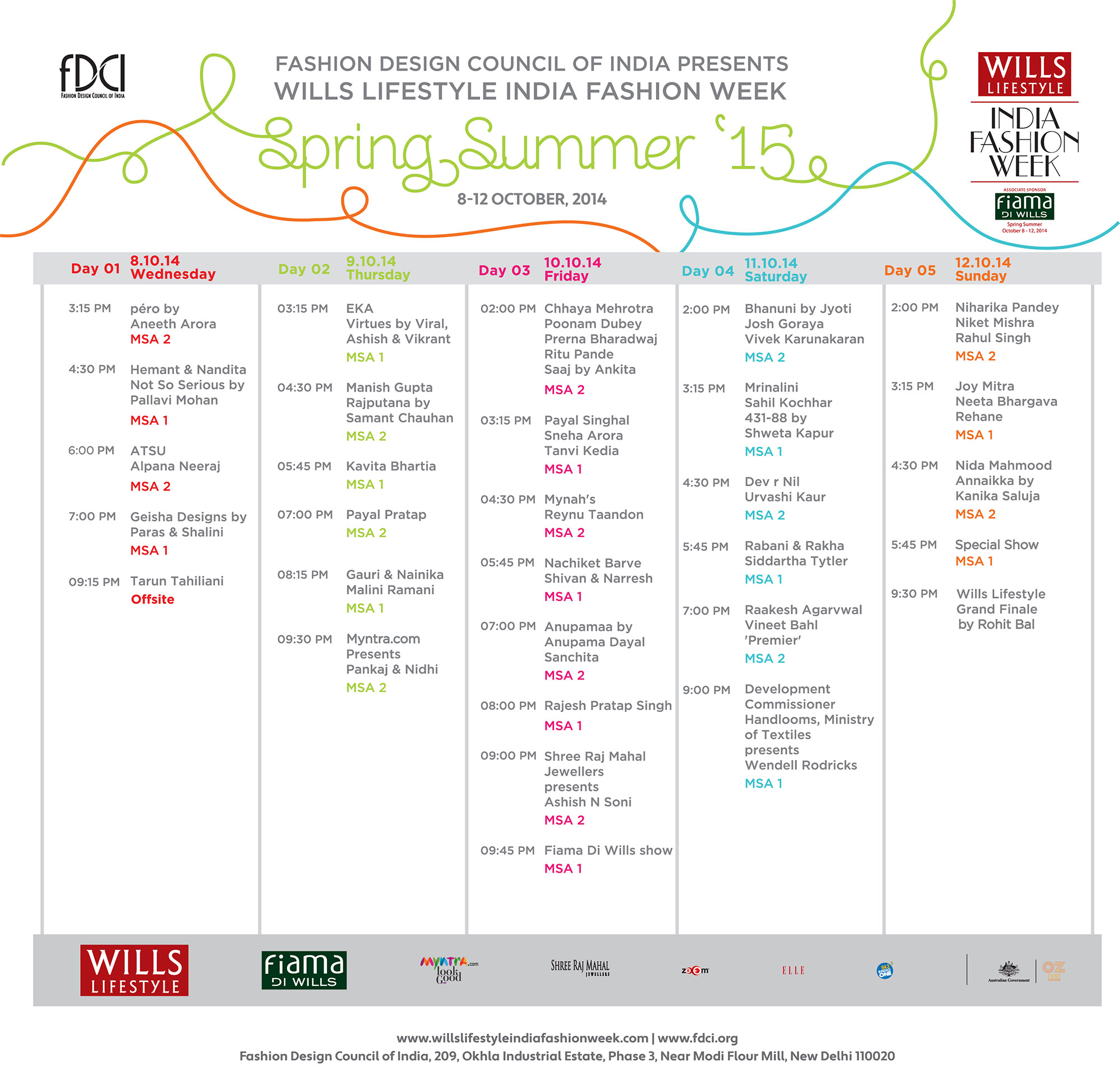 New Delhi, September 24, 2014: The Fashion Design Council of India (FDCI), the apex fashion body in India, today announced the Show schedule and list of runway and stall designers for the upcoming Wills Lifestyle India Fashion Week Spring-Summer 2015.