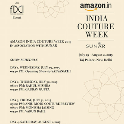 New Delhi,22 July, 2014: The Amazon India Couture Week 2015 in association with Sunar, is set to showcase India’s finest design talents through 11 stunning shows. The five-day fashion event takes place from July 29- August 02, 2015, at the Taj Palace Hotel, New Delhi.