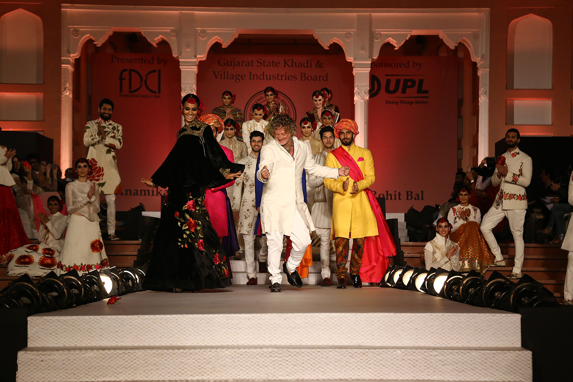 Rohit Bal rejoicing on the ramp with the models wearing his khadi collection.