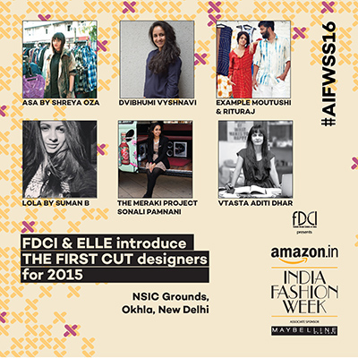 Amazon India Fashion Week Spring Summer 2016 will also witness a remarkable collaboration as Elle and FDCI launch ‘First Cut’, a new initiative for emerging designers that recognises India’s most promising fashion talent. The First Cut 2015 designers are:
