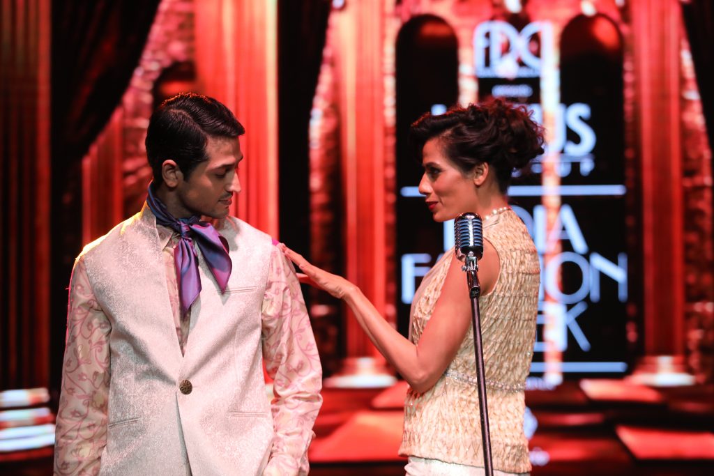 It was a day of interesting wonders! What happens when after a long lull, the proud owner of a six pack opens a show, in a shiny jacket, rather carelessly slung over his broad shoulders? Well, for starters, it must have made millions of us smile, and second it made sure that shimmer is no longer a preserve of women. Siddartha Tytlers love for all things shimmering came through his Ss21 line, with his new-age lehengas, minus the usual zardosi, but with a new-age metallic patina.