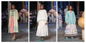 Rina, as a designer derives joy from contemporarising the kurta for Uniqlo and taking the simple cotton from Narayanpet and tailoring roomy trousers and long jackets exuding universal appeal. “Whenever I design a line, I imagine a character,” she says, adding the digital format wasn’t exciting enough for her to do a show. Though what prompted her to carry on, despite the despair that surrounded the world was her clients who told her, the Eka label gave them comfort in tough times, instilling confidence.  “There has to be a purpose in what we do, clothes are a huge part of what we feel inside, on days you feel desolate, they inspire you to carry on,” she admits.