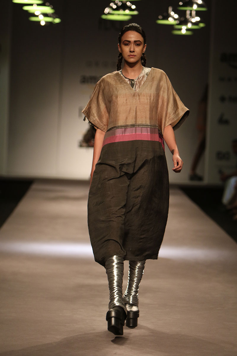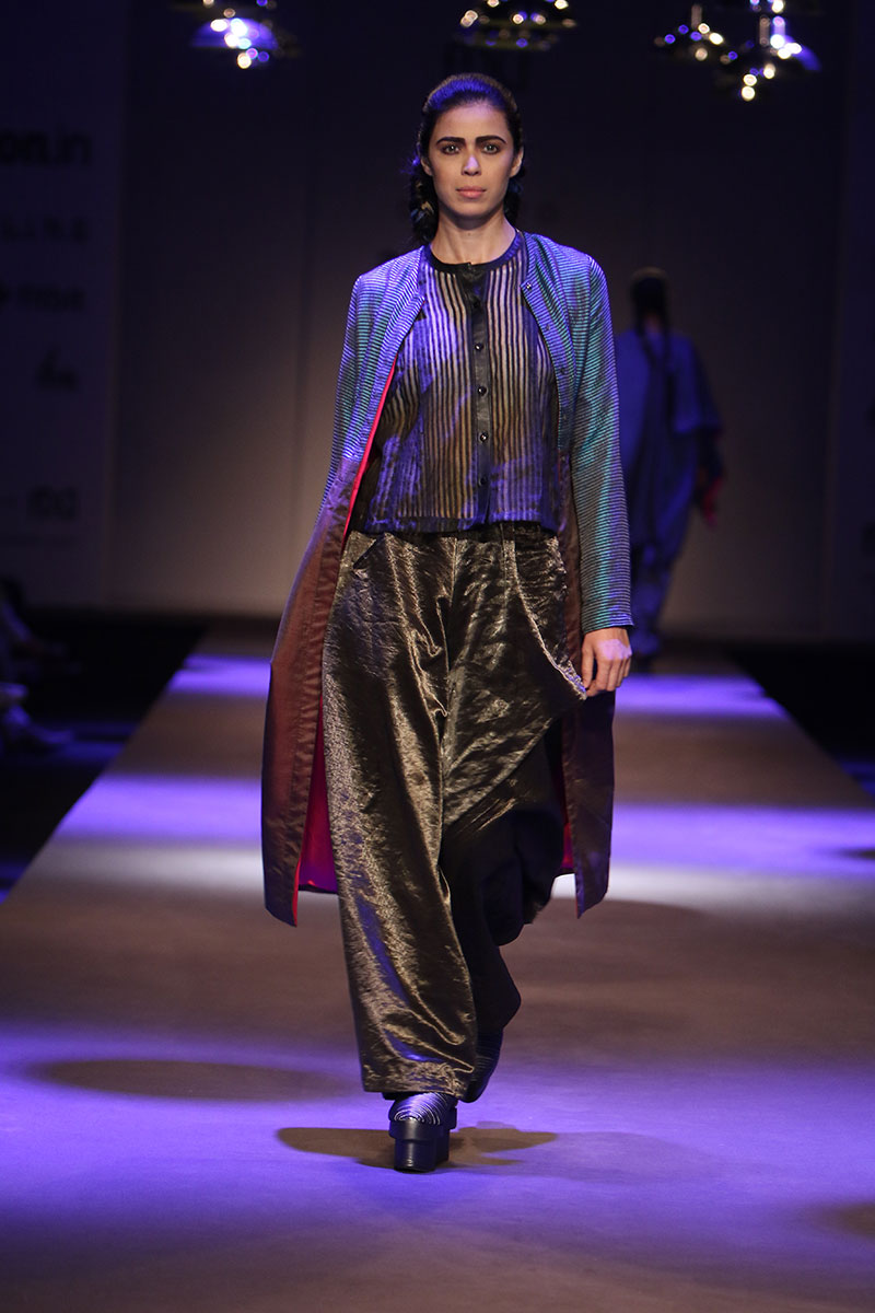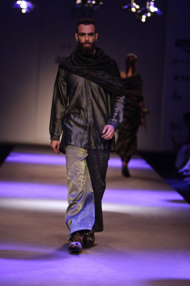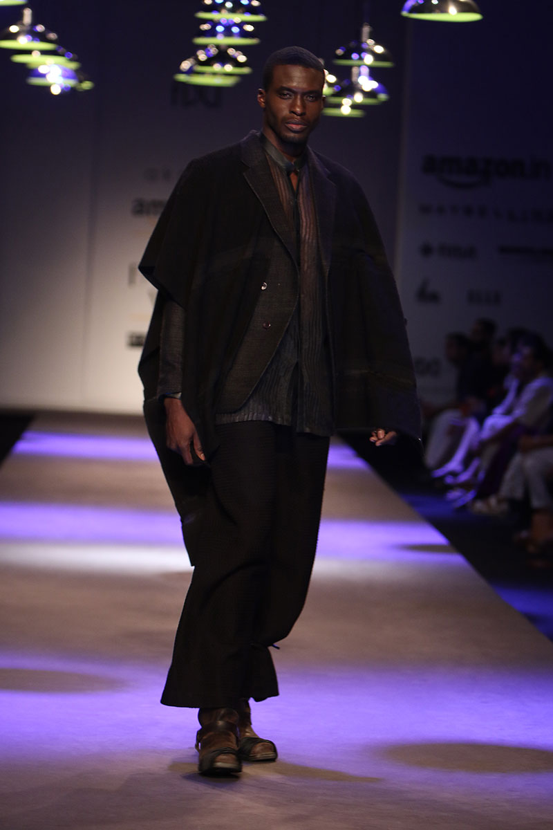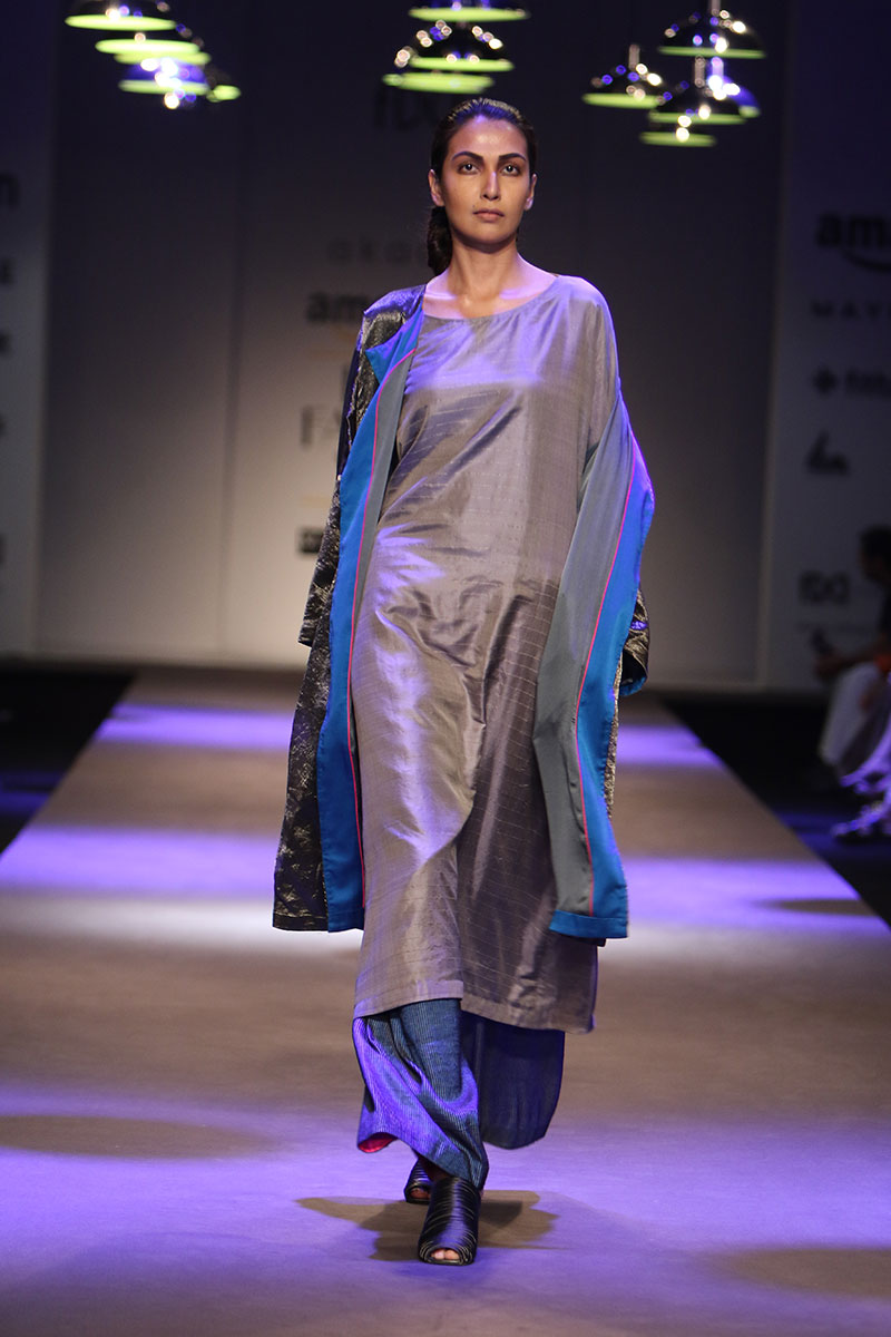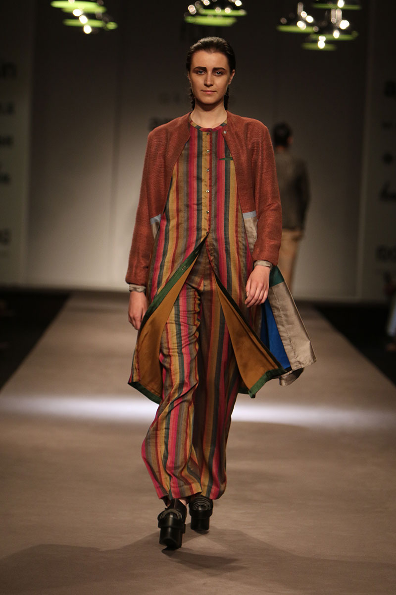 Autumn Winter 2016 uses american photgrapher Trey Ratcliffs works as reference point. Handwoven entirely at akaaro studios in Delhi the collection uses fine Merino Wools, Double cloth wool with stainlees steel fabrics, gauze merino with silks and banarasi engineered silks. The collection focuses on the idea of duality through colour, shapes and material.