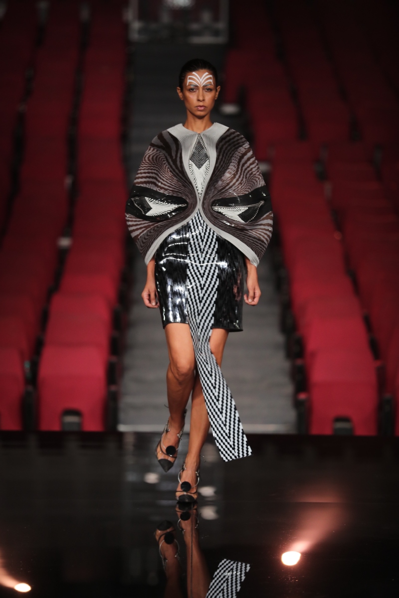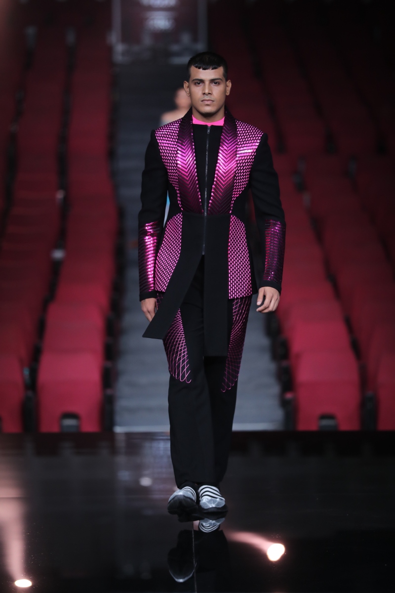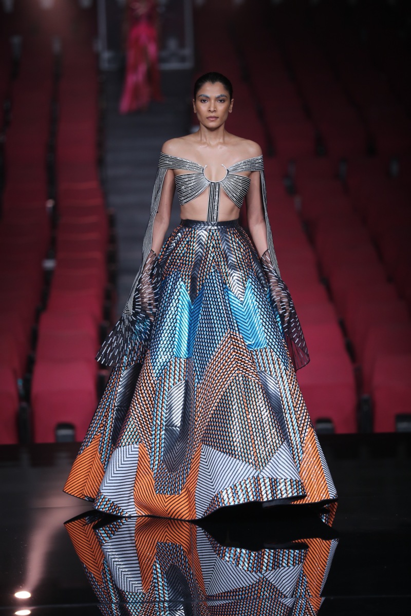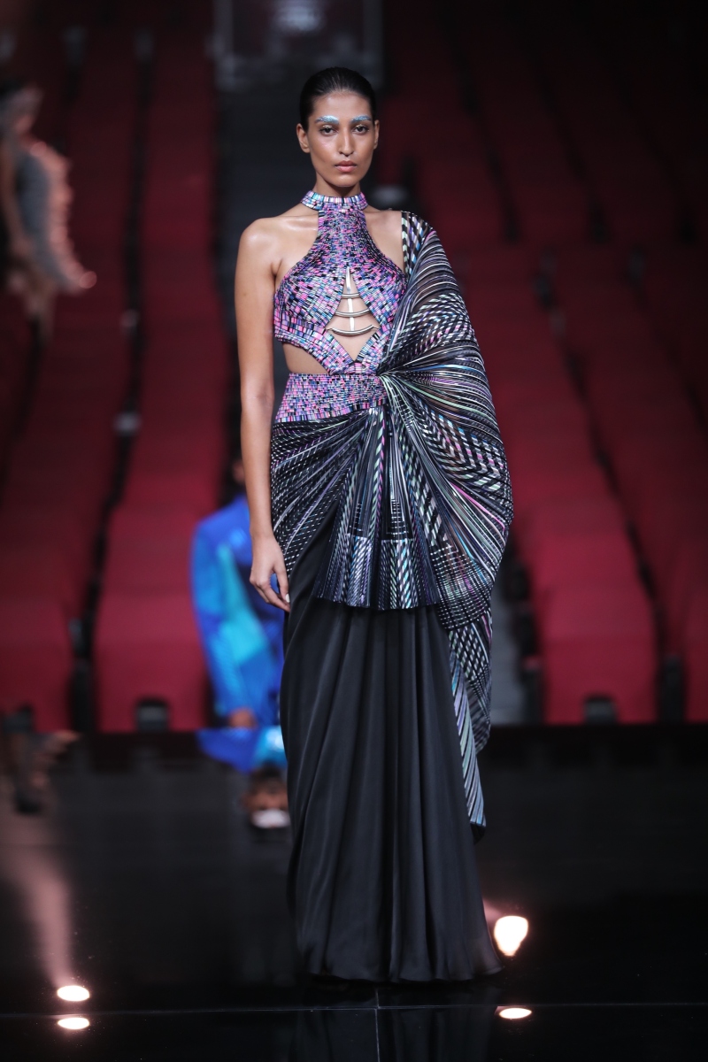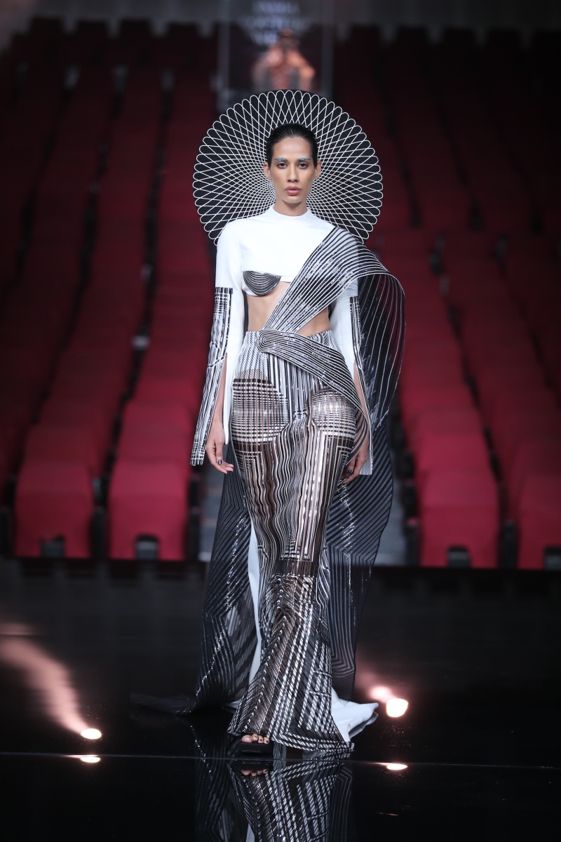 The showcasing collection is a refreshing bookend to our part-miraculous, part-fantastical journey of a decade. But a constant thread of morphing forms and blurring the inescapable folds of time runs through it all. It is also a kaleidoscope ode to the fact that we are at an interesting bend in time where the digital space accommodates those whimsical aspects to ourselves not accessible in the physical world. Every silhouette shows that we carry the echo of the first human and hold the inception of the future – overlaid on the fine-grained realities of the present. This collection is a celebration of the fact that we are the glitch in time: warping forms, straddling realms, embracing eternity.