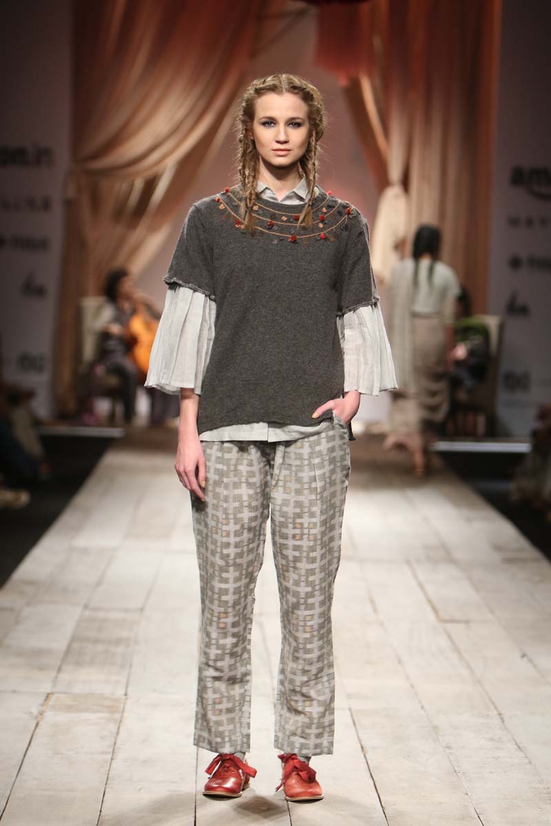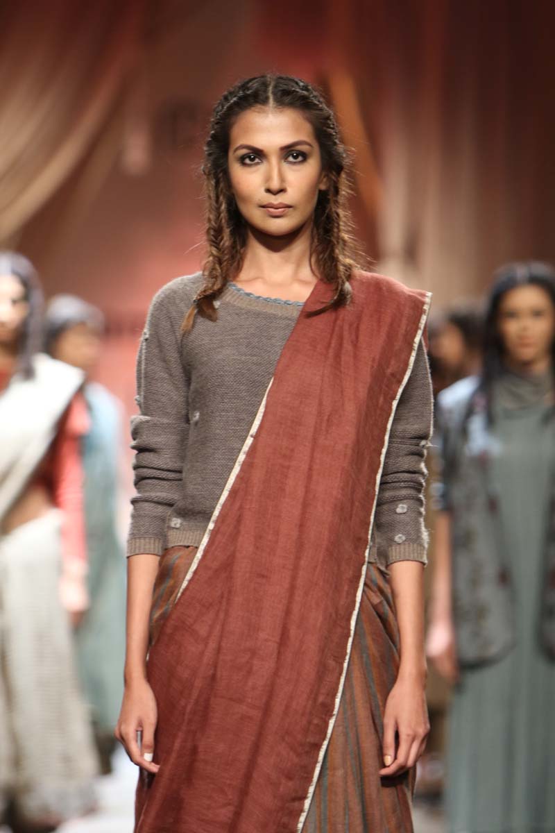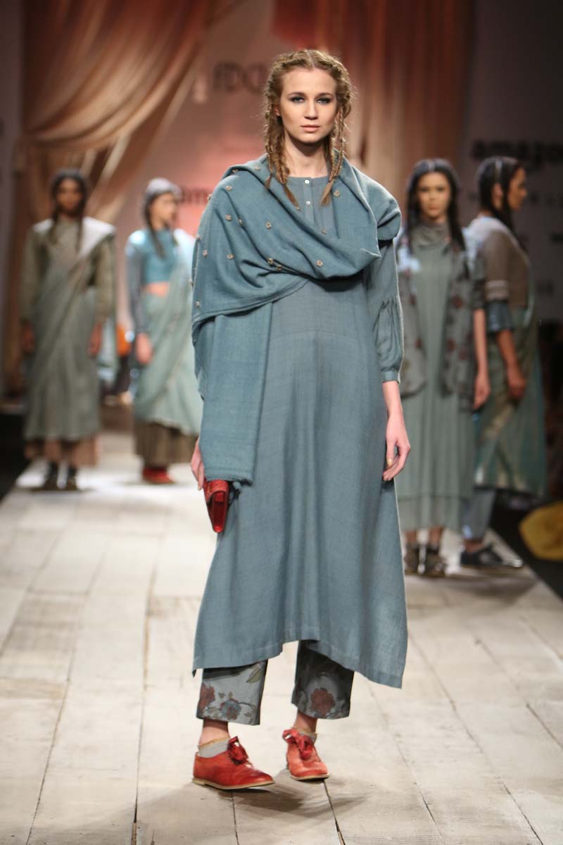 Layering and detailing are core to the collection. For the first time we are working on a collection using different blends with linen. Linen wool and linen silk have been used with pure merino wool and silk. Traditional tapestry inspired weaves, ikat and controlled folk embroideries add charm to the collection.