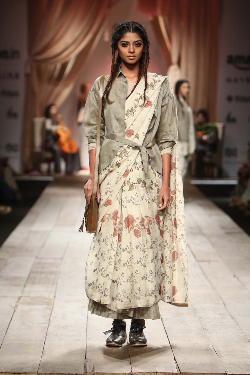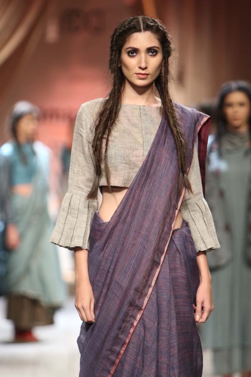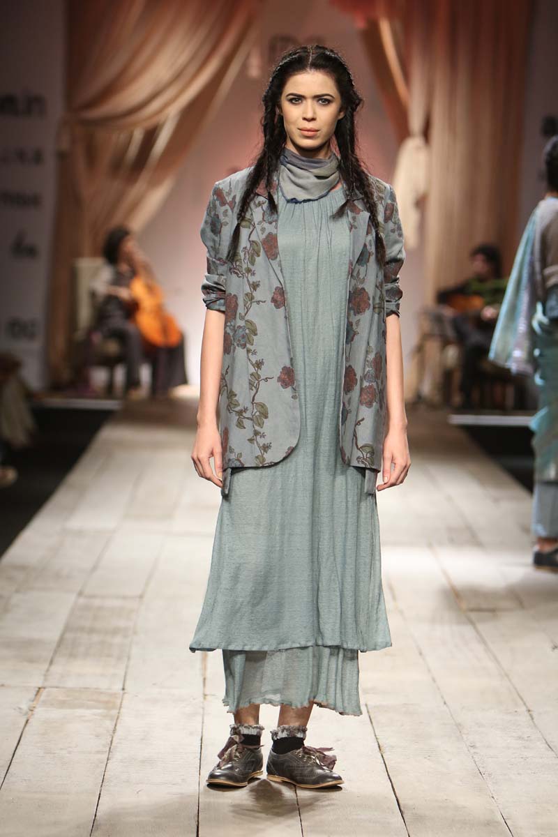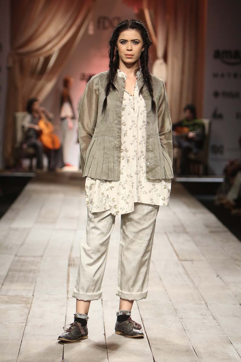 Layering and detailing are core to the collection. For the first time we are working on a collection using different blends with linen. Linen wool and linen silk have been used with pure merino wool and silk. Traditional tapestry inspired weaves, ikat and controlled folk embroideries add charm to the collection.