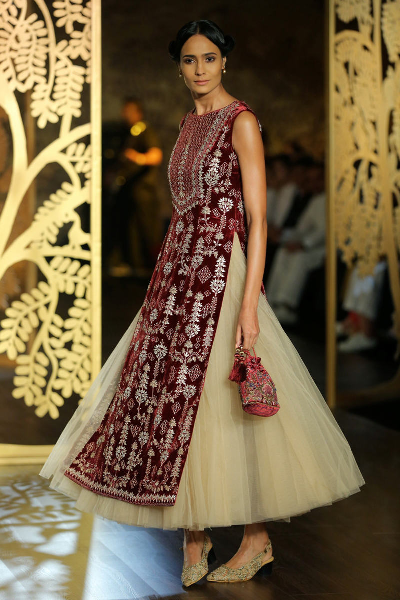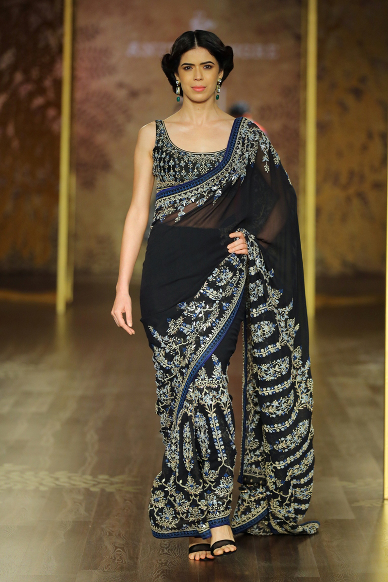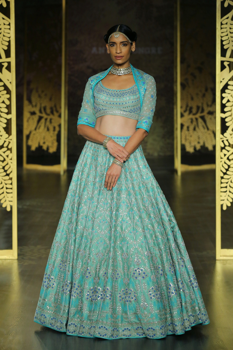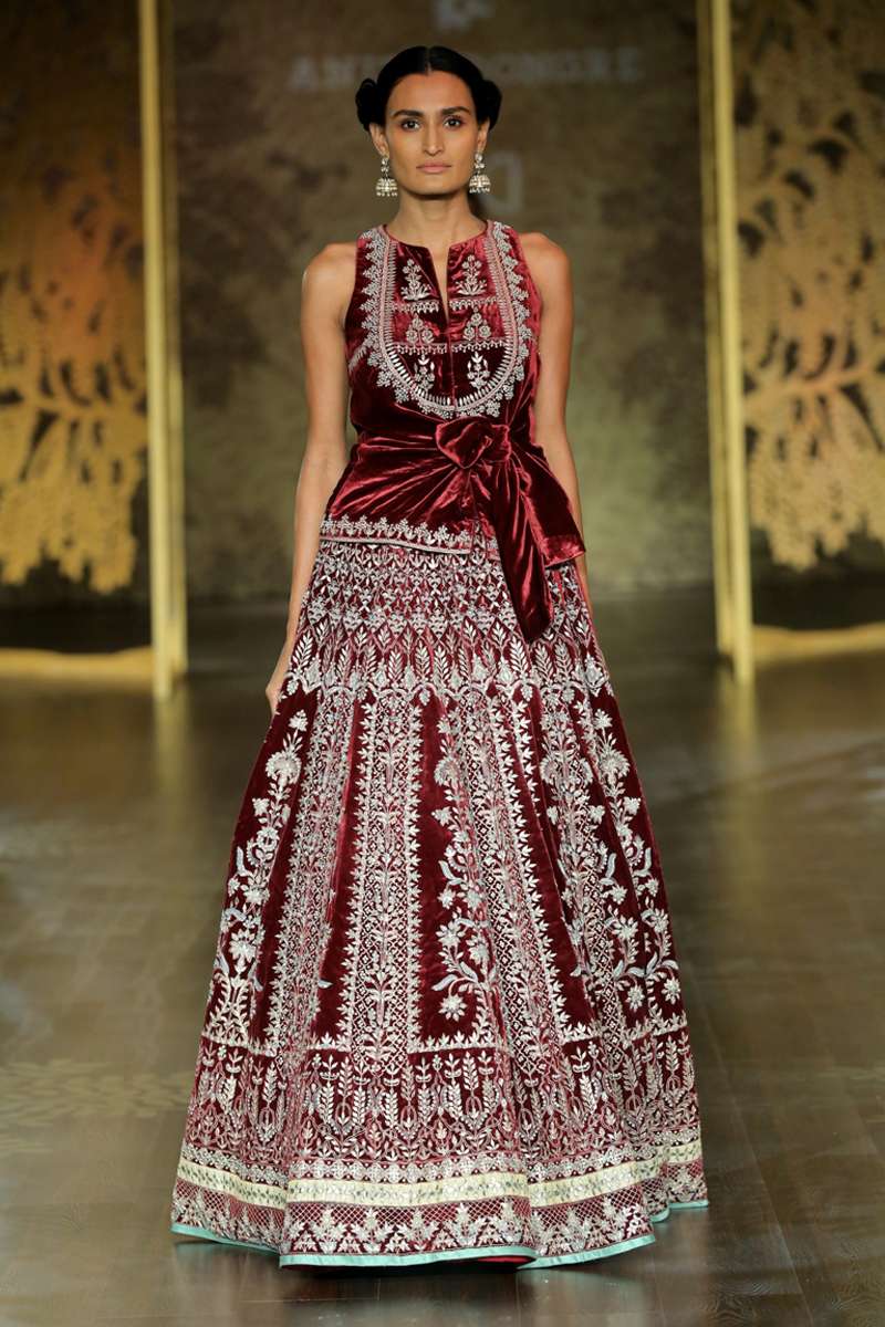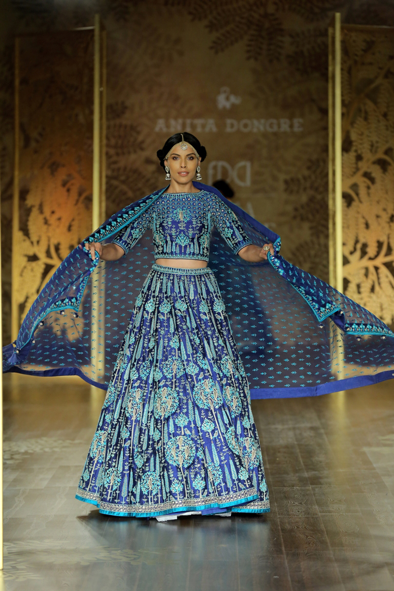 The key motif of the collection finds its inspirational roots in the ‘khejri’ – a super species of trees that flourishes to remain evergreen. Continuing the sentiment of ‘giving back’, Anita pledges to plant a new tree each time that a piece from this collection is sold. The feminine collection on rich silks with tulle and organza as under layers, in deep hues of maroon, ink blue and emerald green are balanced out with crème gold, create the most stunning couture for the modern day bride.