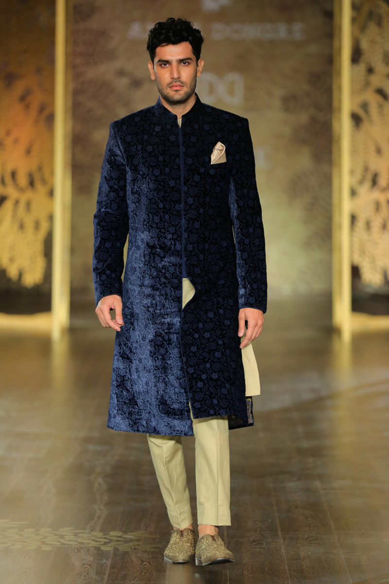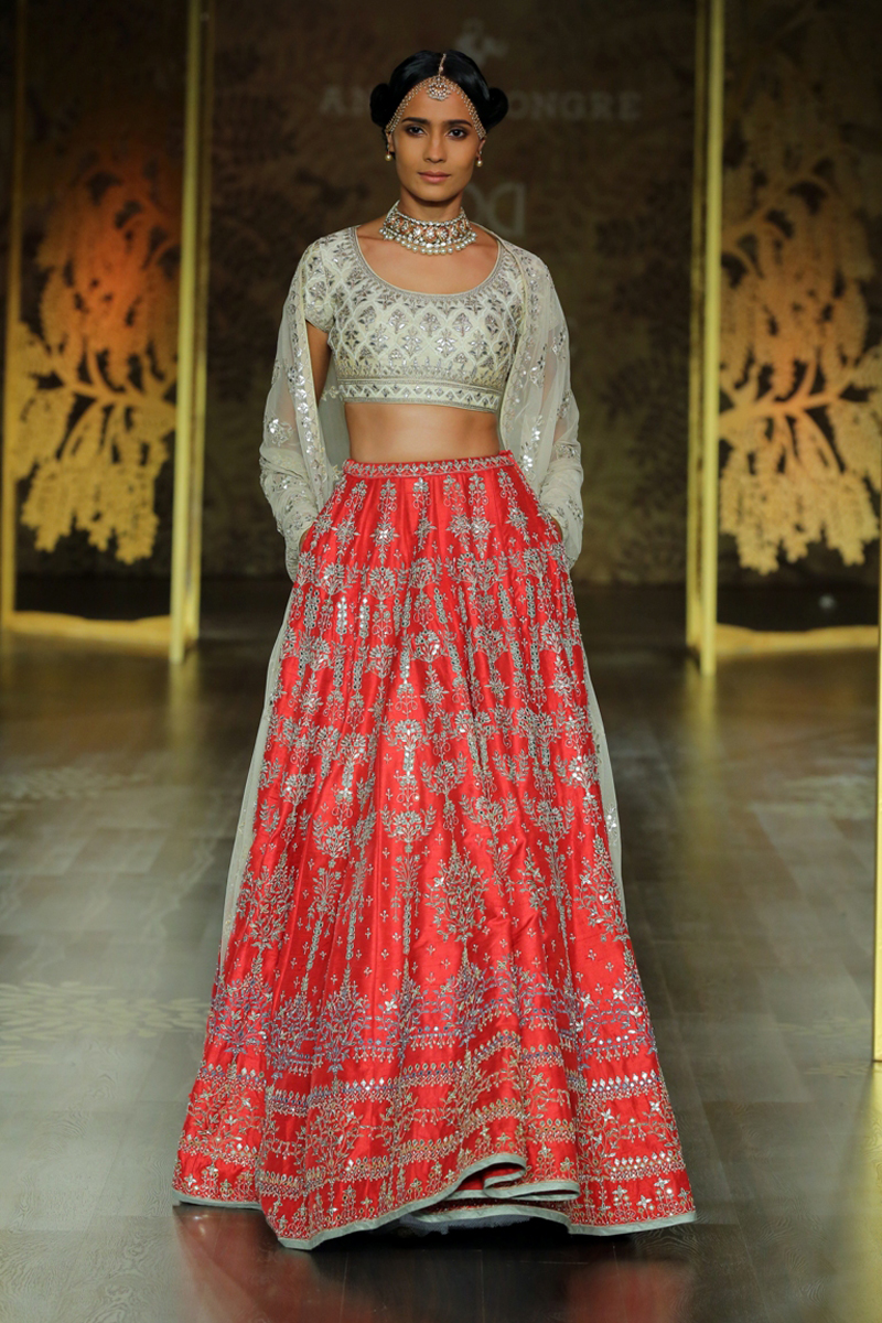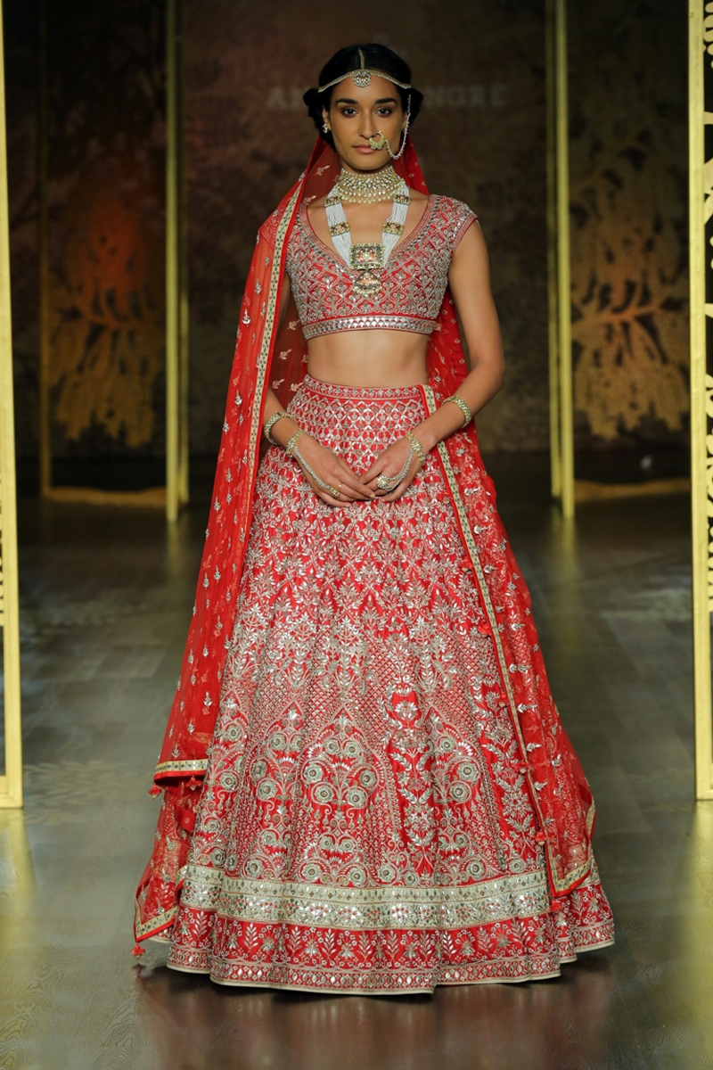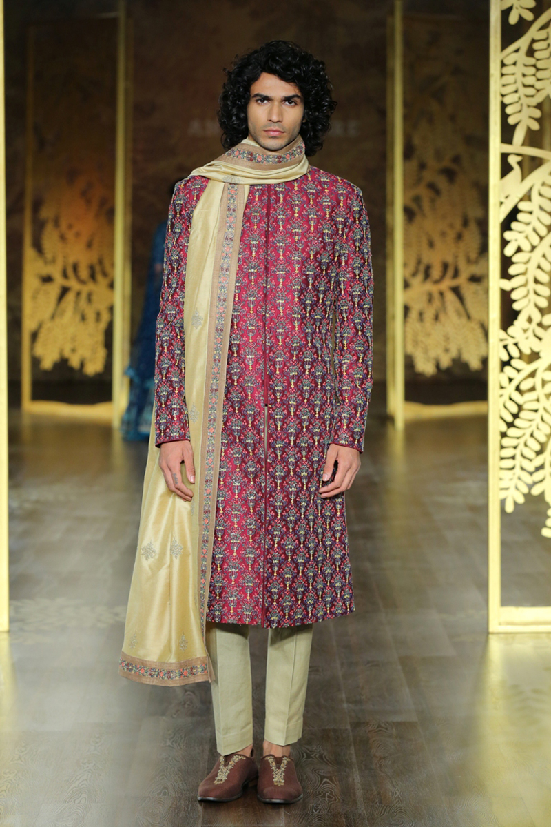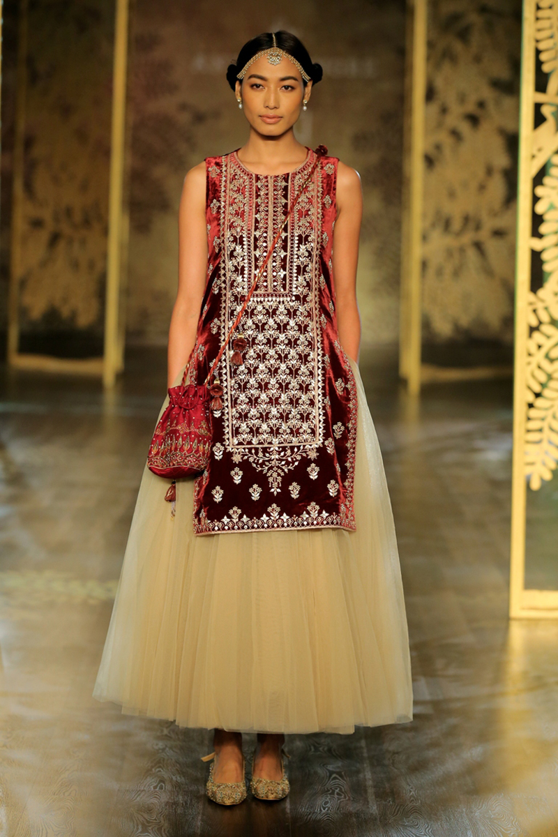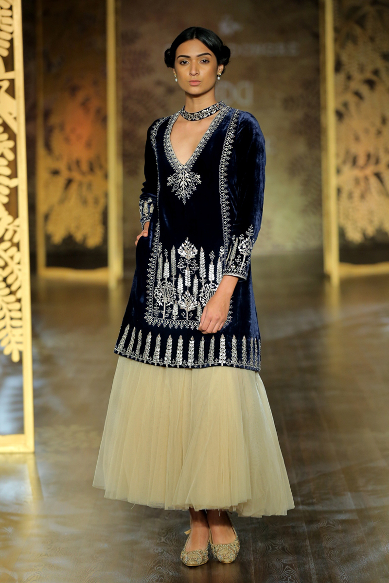 The key motif of the collection finds its inspirational roots in the ‘khejri’ – a super species of trees that flourishes to remain evergreen. Continuing the sentiment of ‘giving back’, Anita pledges to plant a new tree each time that a piece from this collection is sold. The feminine collection on rich silks with tulle and organza as under layers, in deep hues of maroon, ink blue and emerald green are balanced out with crème gold, create the most stunning couture for the modern day bride.