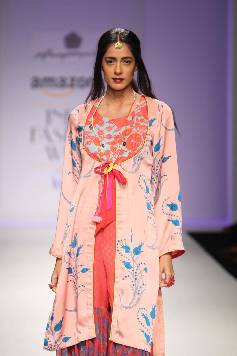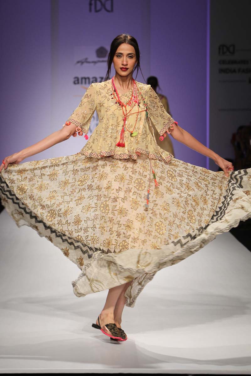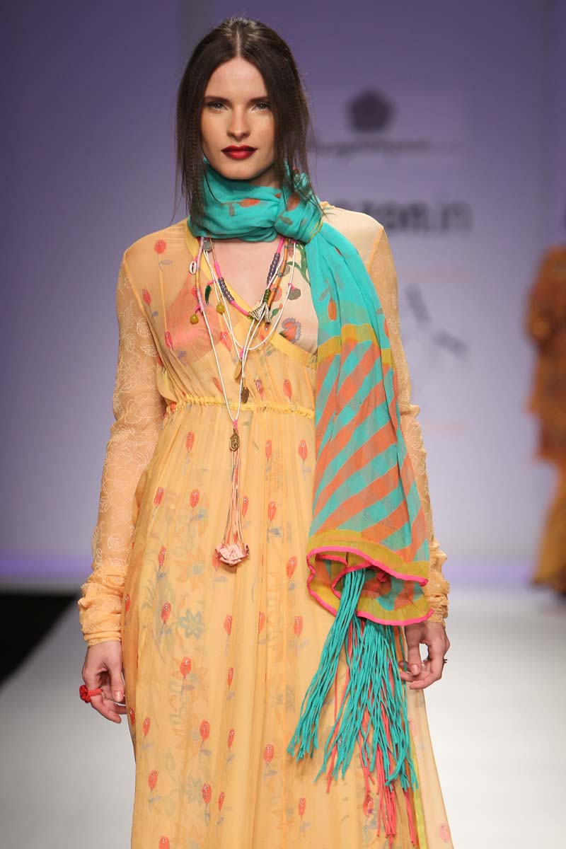 “The melting pot of Anupamaas eclectic inspirations creates an inspiring and cultural collection of fetichistic fashion, attaching us to the roots of India and at the same time making us international urban nomads. Clothes for our own century.” Lidewij Edelkoort (worlds leading trend forecaster)n nAnupamaa has been experimenting and setting new milestones in her unique printing and needle work techniques. The print stories are unique and the philosophy is organic. The Anupamaa brand is regularly seen in the 150 stores of the iconic Anthropologie. The buyers claim to be in love with the eclectic, artistic look and the unusual use of colour..The legendary Australian fashion retailer, Belinda Seper has been quoted as saying “with Anupamaa, you get the soul of India.”n nThe brand is available in New Delhi, Mumbai, London, New York, Paris, Milan Tokyo, Kuwait, Dubai, Singapore, Ibiza, The Bahamas, Puerto Rico and many other countries.n nThe Autumn-Winter15 collection name is called Jamali Kamali. “An ode to the city I live in and an attempt to embrace all its living history.” The collection will be 2 pronged. Jamali will be Mughal inspired, purist, wedding ensembles. Kamali will use similar dresses say just the divided skirt or a Persian trouser and wear it in a modern, casual, ‘ anywhere in the world’ manner.n n