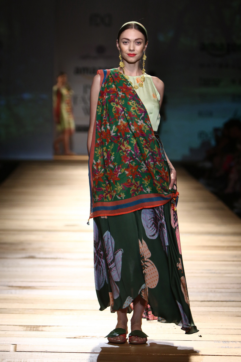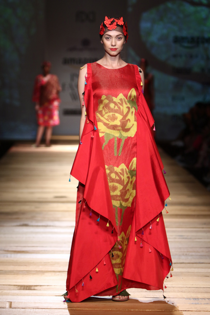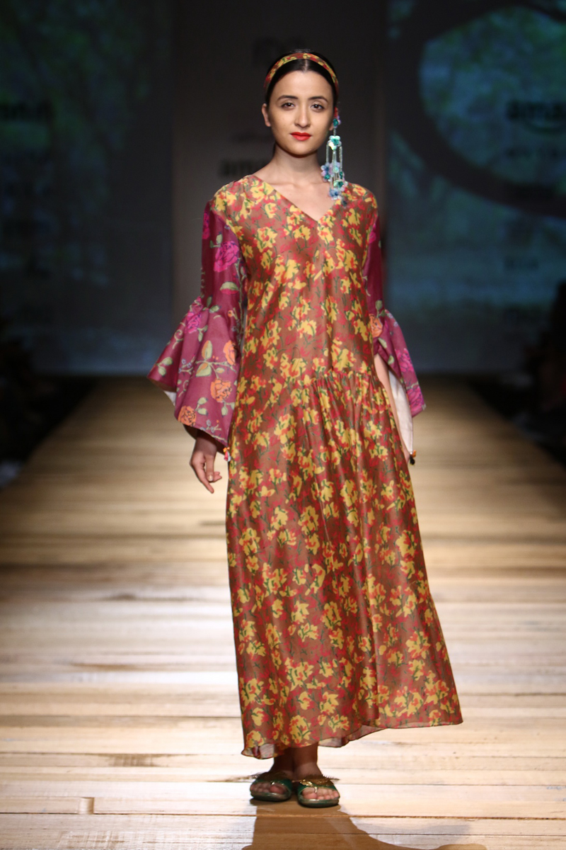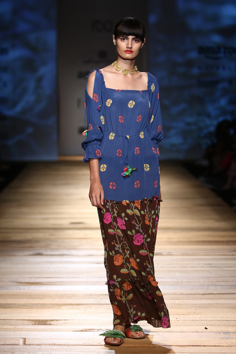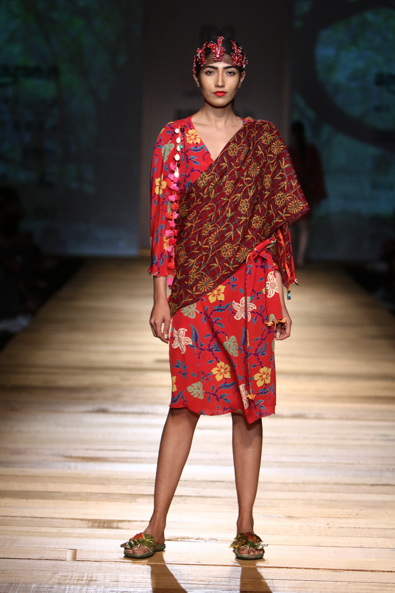 This collection is set against a forest. The sacred forest of Mangar village. We have romanced intense florals. We have also tried to incorporate learning from the life of a forest dweller often the wandering nomad. Light , wearable in multiple ways , several uses , easy to travel with feminine enough to win hearts , strong enough to pass on to the next generation