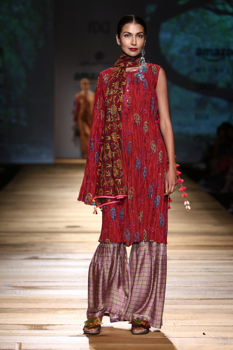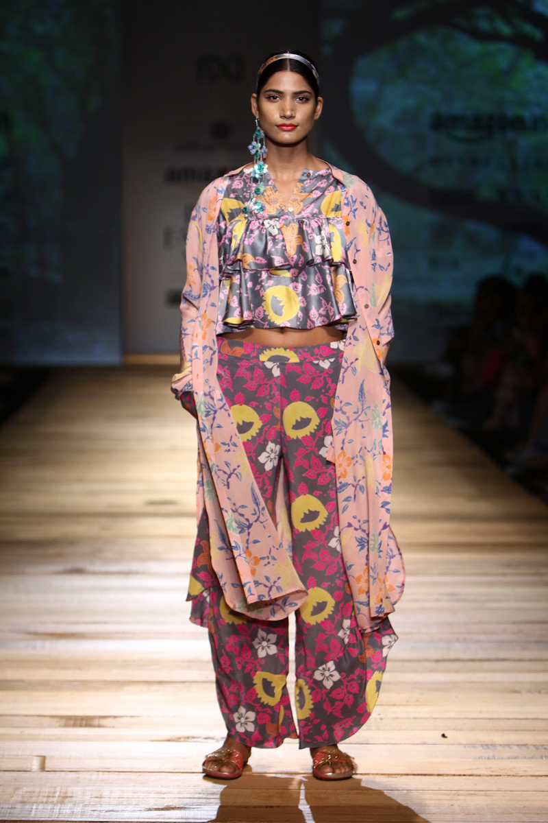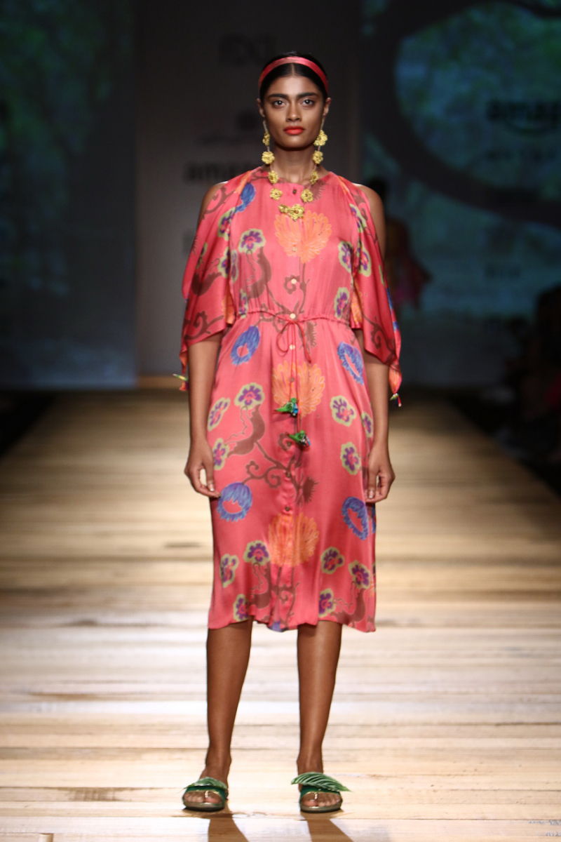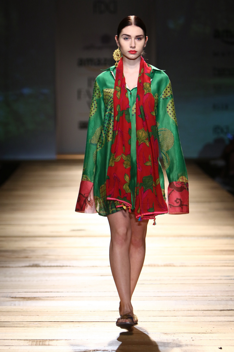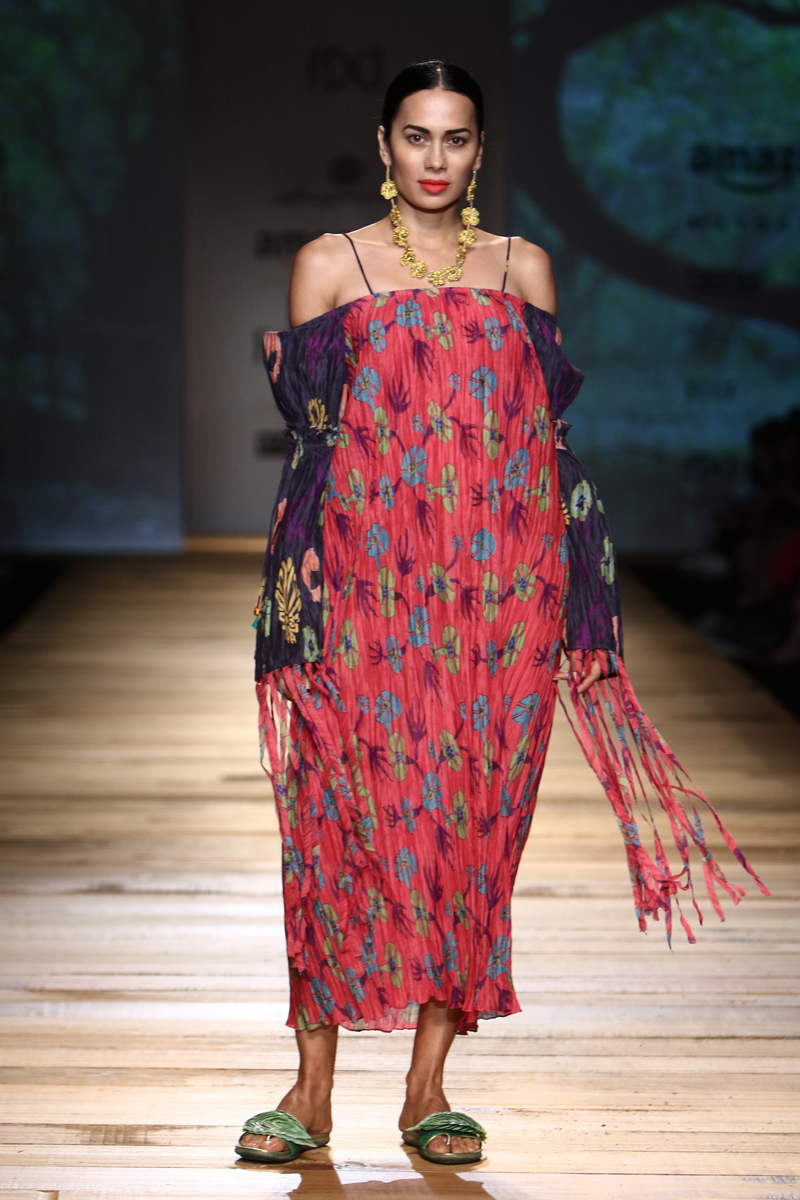 This collection is set against a forest. The sacred forest of Mangar village. We have romanced intense florals. We have also tried to incorporate learning from the life of a forest dweller often the wandering nomad. Light , wearable in multiple ways , several uses , easy to travel with feminine enough to win hearts , strong enough to pass on to the next generation