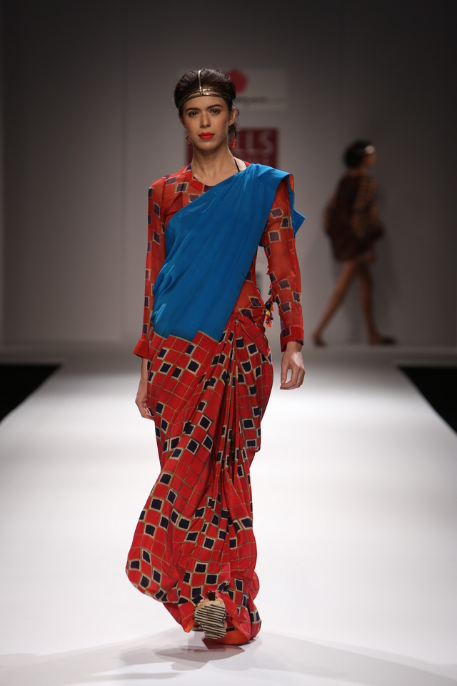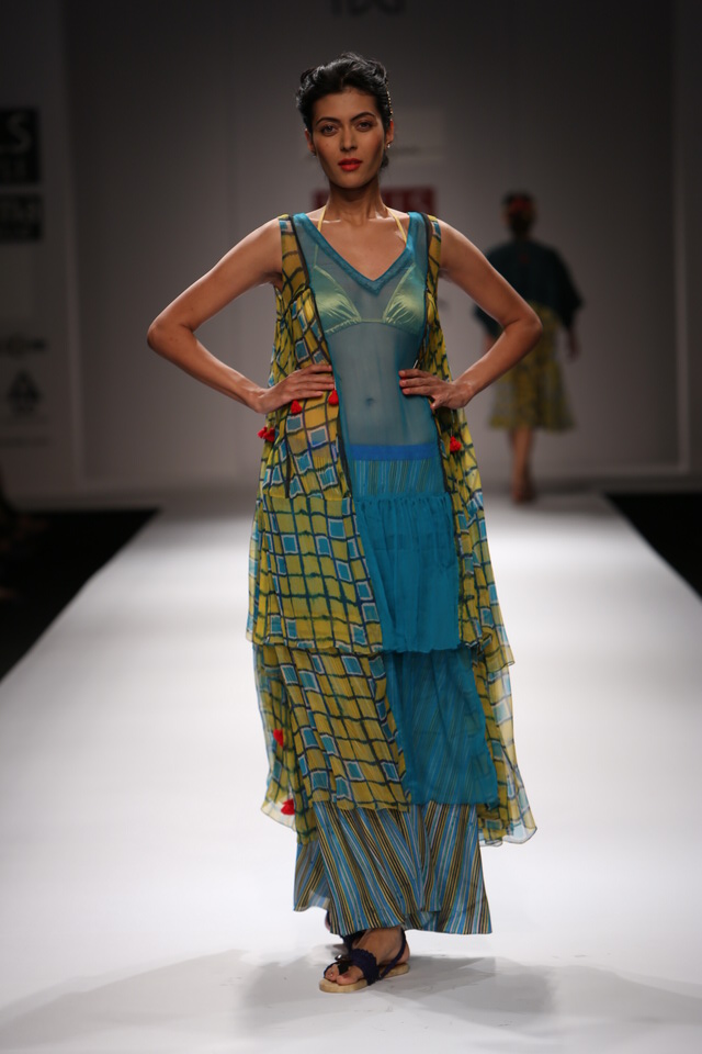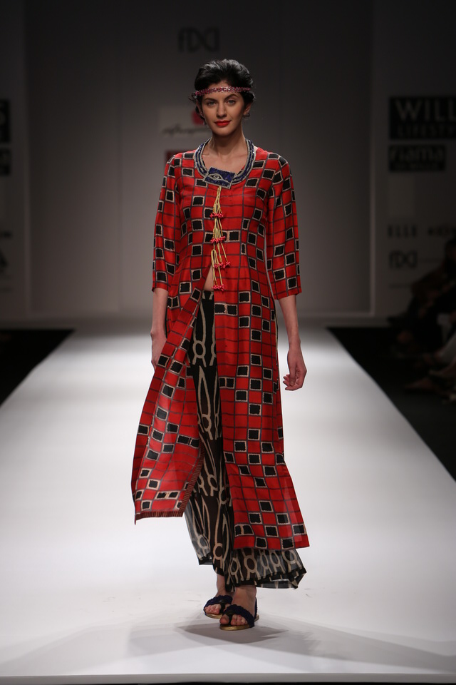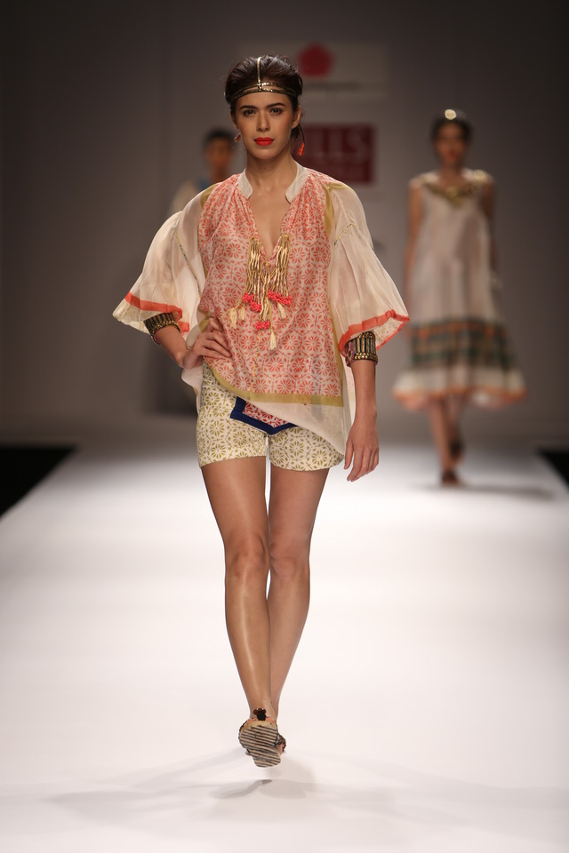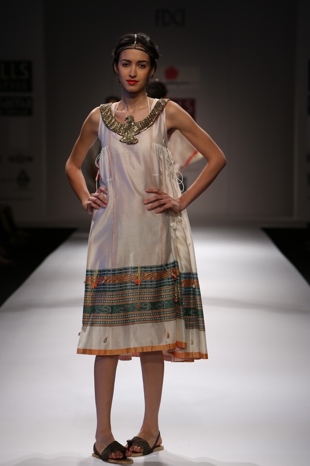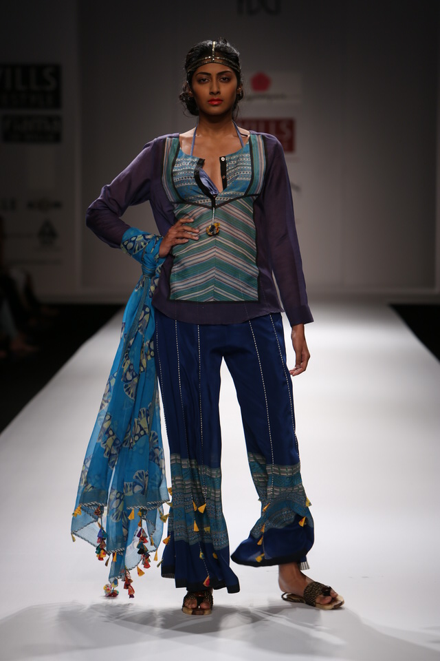 Her SS 13 collection is titled The Nile and the Kalinga. The collection consists of fluid tunics and dresses of various lengths worn with divided skirts, many types of Asian trousers and shorts.