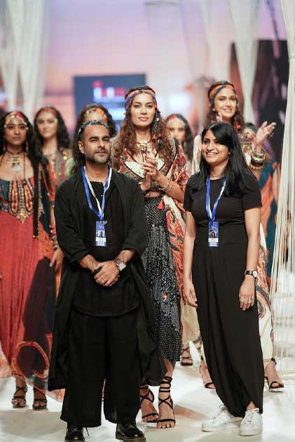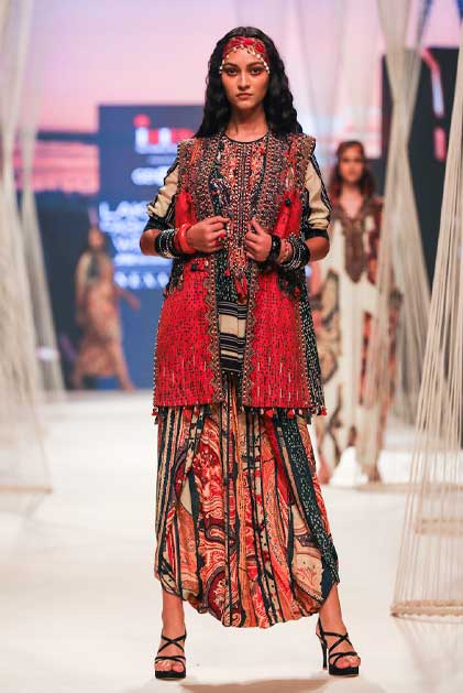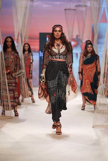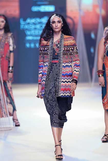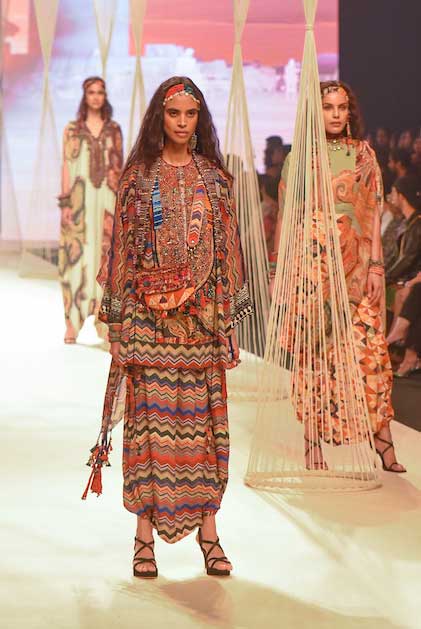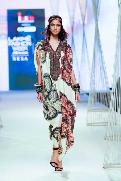 TECHNIQUES : The artworks are hand painted and then digitised to be printed on natural crepes and mushroom twills enhanced with print appliqués and splicing of print collage with vintage zardozi marori work in fine antique zari and coloured gemstones bead work.