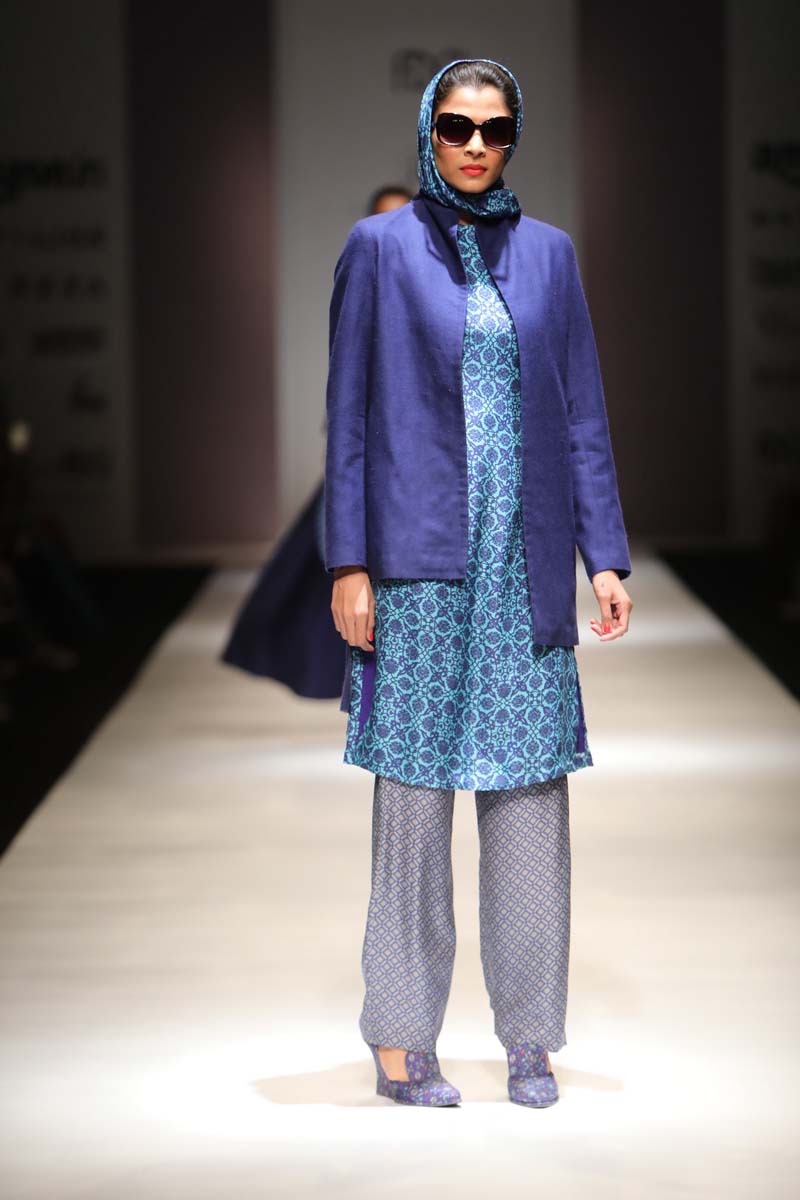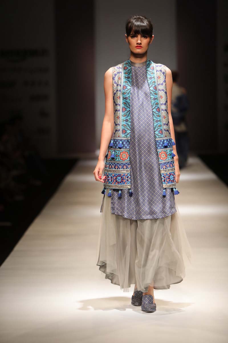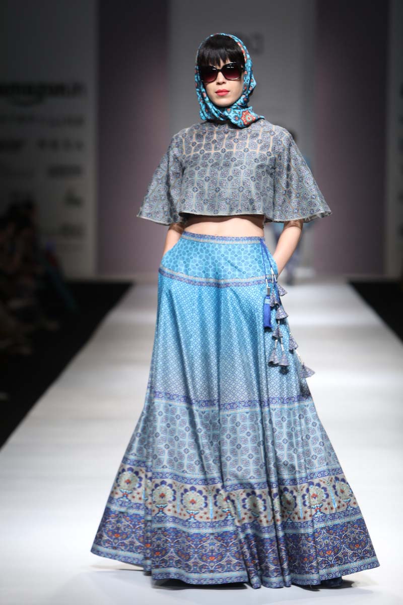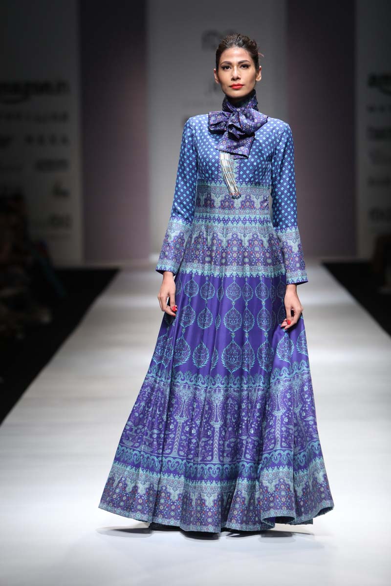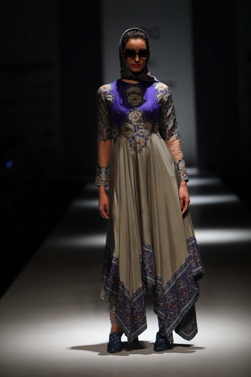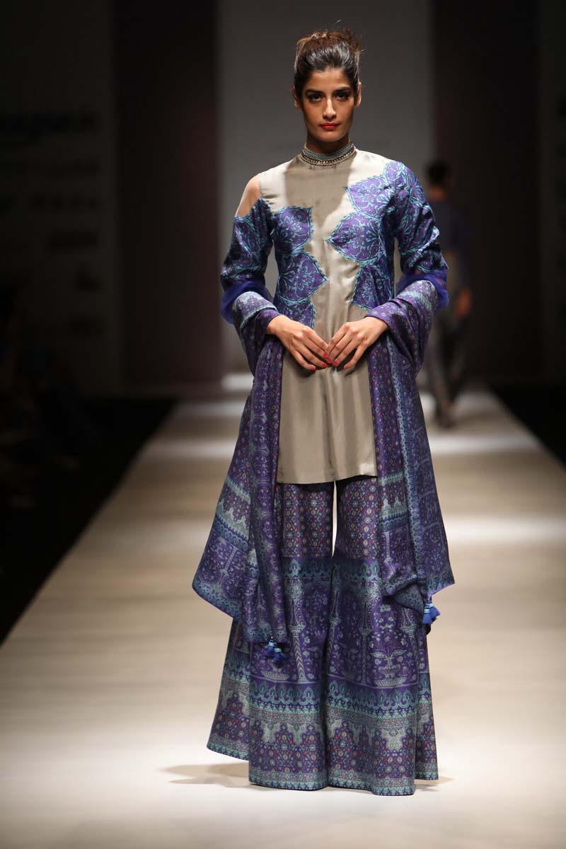 An opulent twist is conjured by interweaving motifs that adorn the architectural realms of Khiva in our Autumn – Winter 2017 collection, exhausting the influence of blue pottery and the vivid radiance of Shiva in his jatadhari edifice that comes to the fore in our visual ode to it – Charukesha. The palette descends rapidly through the iridescence of indigo and into an impermanence of blue, as pansy purples and turquoise are greeted by a contradiction of anthracite and eggshell, and hints of vermillion; like motifs that have withdrawn themselves into the Iznik tiled minarets of an ever traveling caravan of print exaggeration giving birth to a dimension of modernism that is captured through delicately sculptured skirts, quaint pashmina blouses, tribal gilets, asymmetric kurtas and deftly composed sarees that are juxtaposed with scaled metal details, luxe stone embellishments and appliqués painstakingly crafted to mark an excursion of patterns overlaid with yards of French tulle. The grandiose is muted into a quiet elegance of gravity, rooted in the quintessential AL woman, lending once again, an air of sophistication that embraces the classic with a touch of trend.