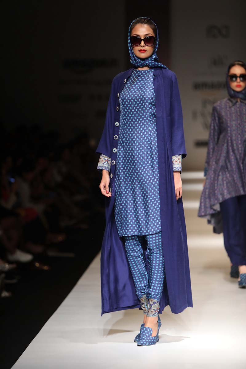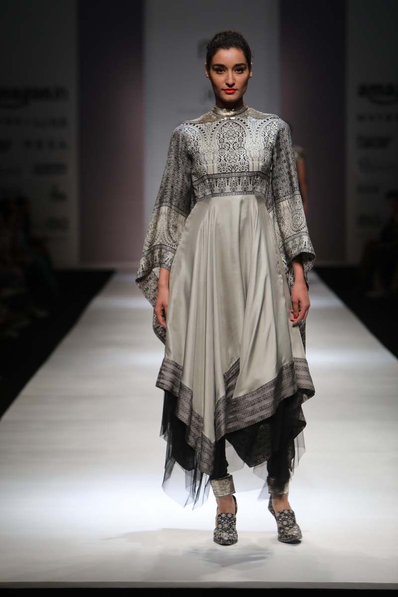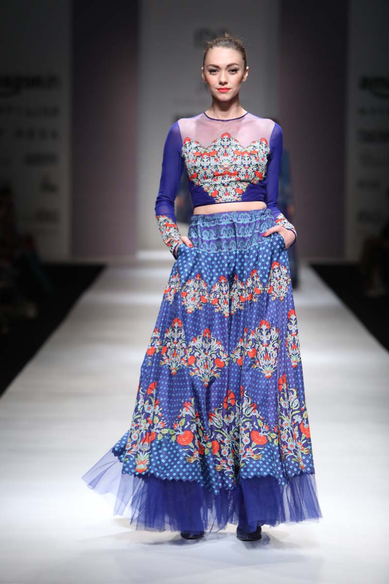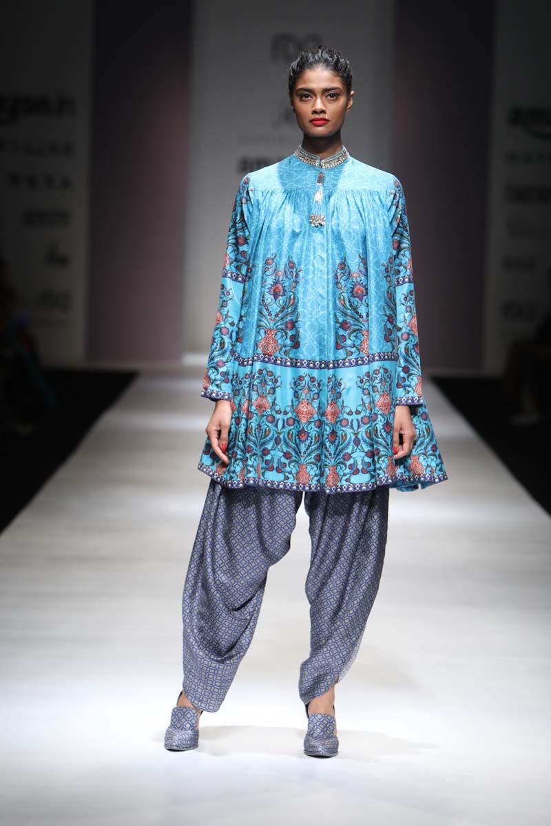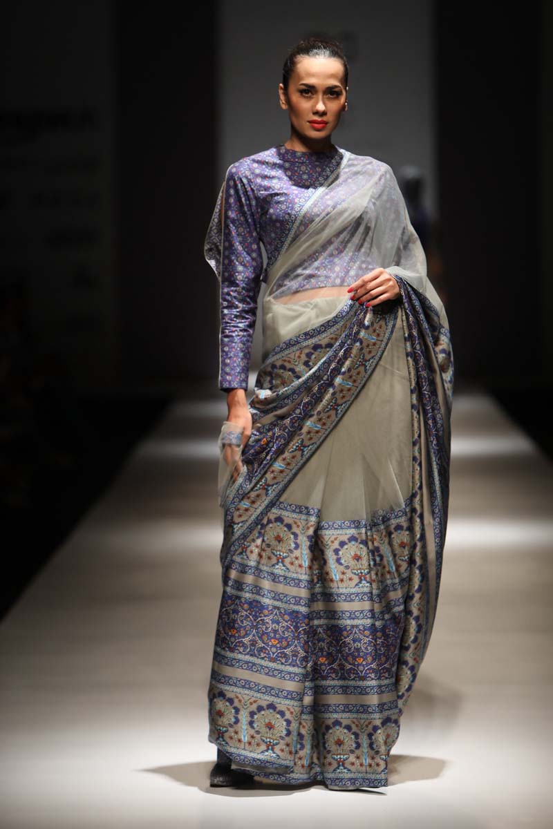 An opulent twist is conjured by interweaving motifs that adorn the architectural realms of Khiva in our Autumn – Winter 2017 collection, exhausting the influence of blue pottery and the vivid radiance of Shiva in his jatadhari edifice that comes to the fore in our visual ode to it – Charukesha. The palette descends rapidly through the iridescence of indigo and into an impermanence of blue, as pansy purples and turquoise are greeted by a contradiction of anthracite and eggshell, and hints of vermillion; like motifs that have withdrawn themselves into the Iznik tiled minarets of an ever traveling caravan of print exaggeration giving birth to a dimension of modernism that is captured through delicately sculptured skirts, quaint pashmina blouses, tribal gilets, asymmetric kurtas and deftly composed sarees that are juxtaposed with scaled metal details, luxe stone embellishments and appliqués painstakingly crafted to mark an excursion of patterns overlaid with yards of French tulle. The grandiose is muted into a quiet elegance of gravity, rooted in the quintessential AL woman, lending once again, an air of sophistication that embraces the classic with a touch of trend.