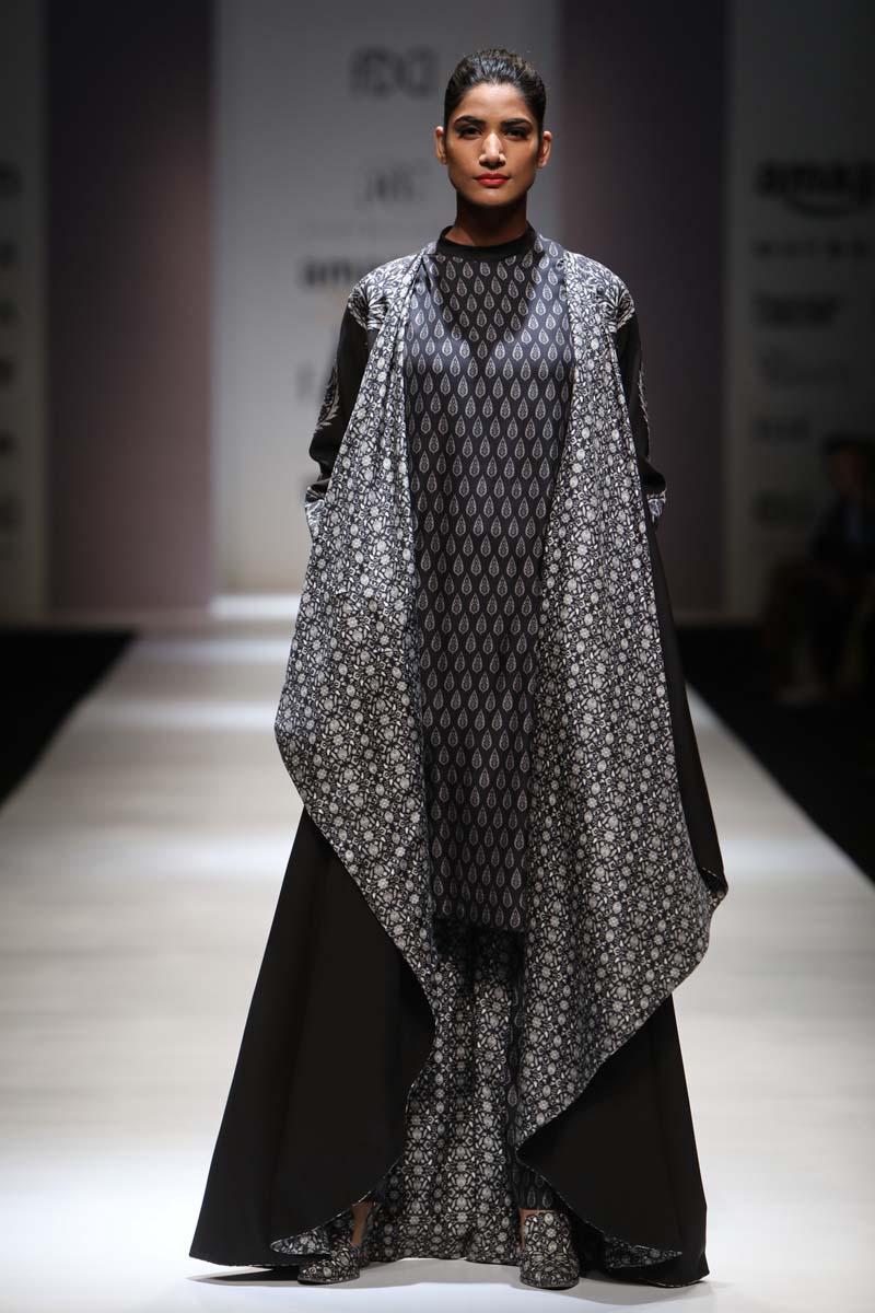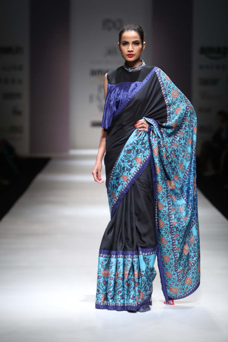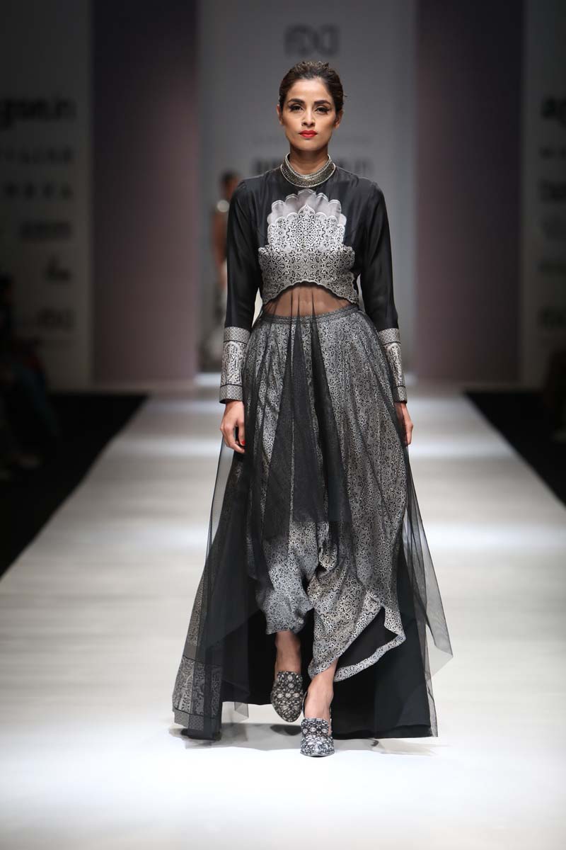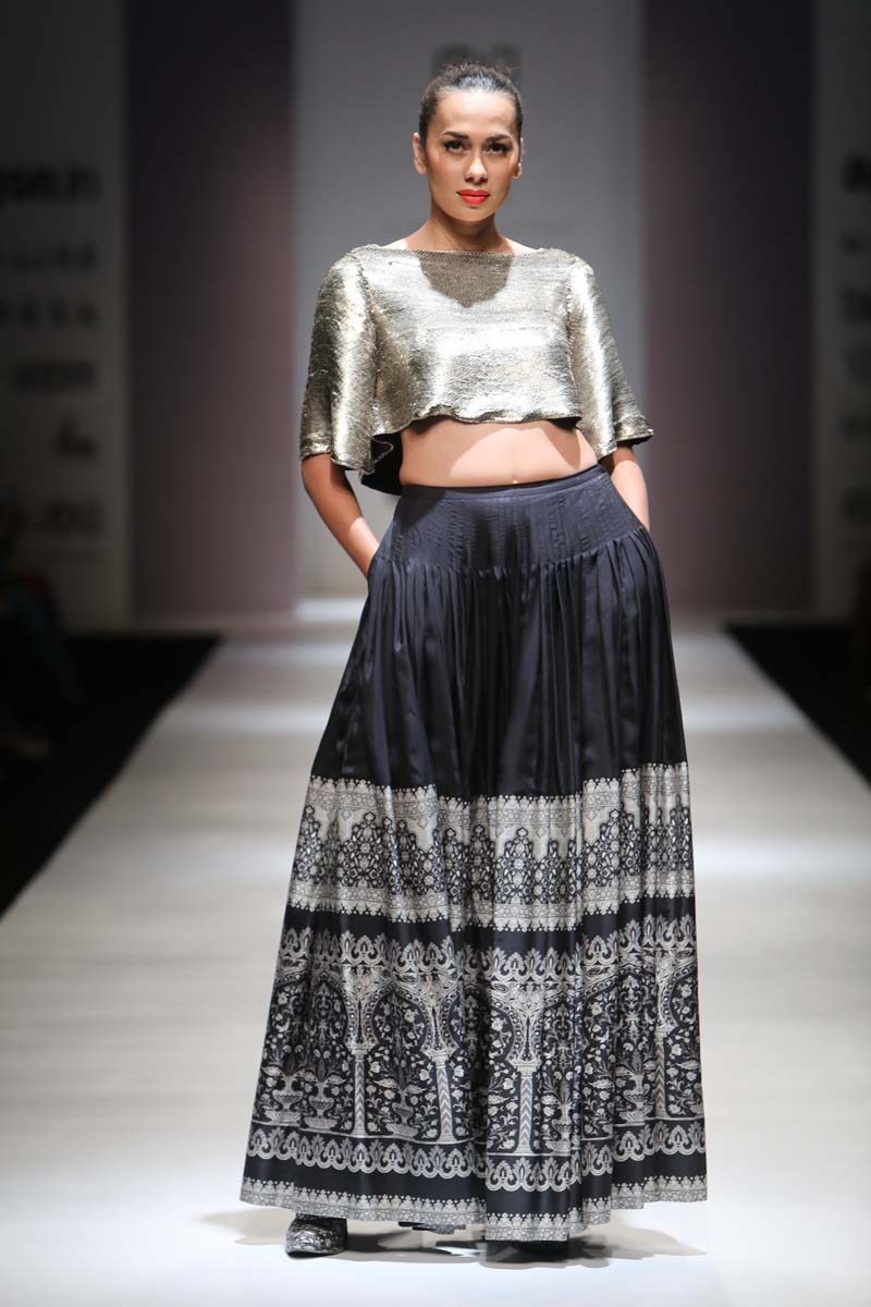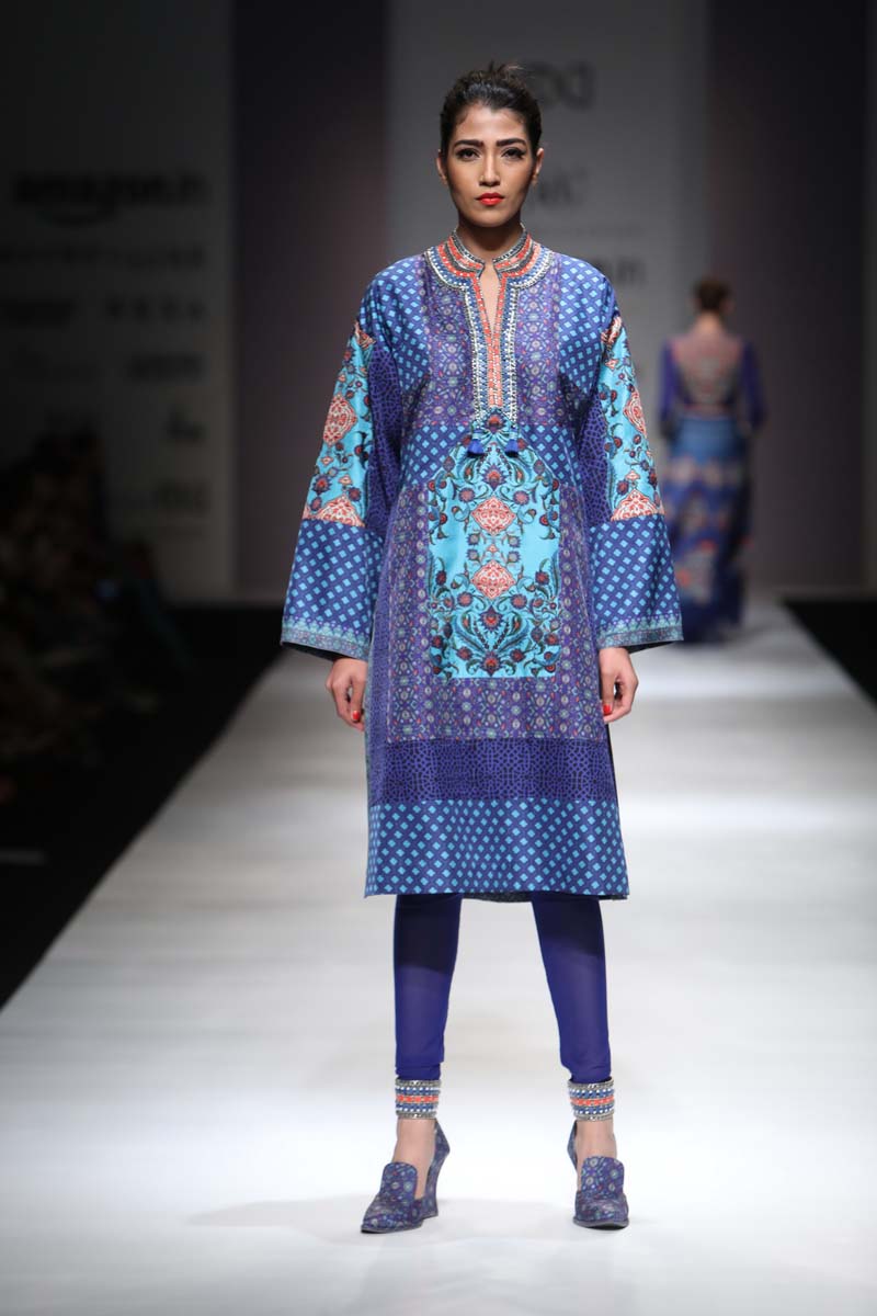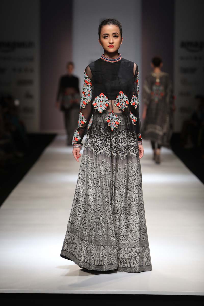 An opulent twist is conjured by interweaving motifs that adorn the architectural realms of Khiva in our Autumn – Winter 2017 collection, exhausting the influence of blue pottery and the vivid radiance of Shiva in his jatadhari edifice that comes to the fore in our visual ode to it – Charukesha. The palette descends rapidly through the iridescence of indigo and into an impermanence of blue, as pansy purples and turquoise are greeted by a contradiction of anthracite and eggshell, and hints of vermillion; like motifs that have withdrawn themselves into the Iznik tiled minarets of an ever traveling caravan of print exaggeration giving birth to a dimension of modernism that is captured through delicately sculptured skirts, quaint pashmina blouses, tribal gilets, asymmetric kurtas and deftly composed sarees that are juxtaposed with scaled metal details, luxe stone embellishments and appliqués painstakingly crafted to mark an excursion of patterns overlaid with yards of French tulle. The grandiose is muted into a quiet elegance of gravity, rooted in the quintessential AL woman, lending once again, an air of sophistication that embraces the classic with a touch of trend.