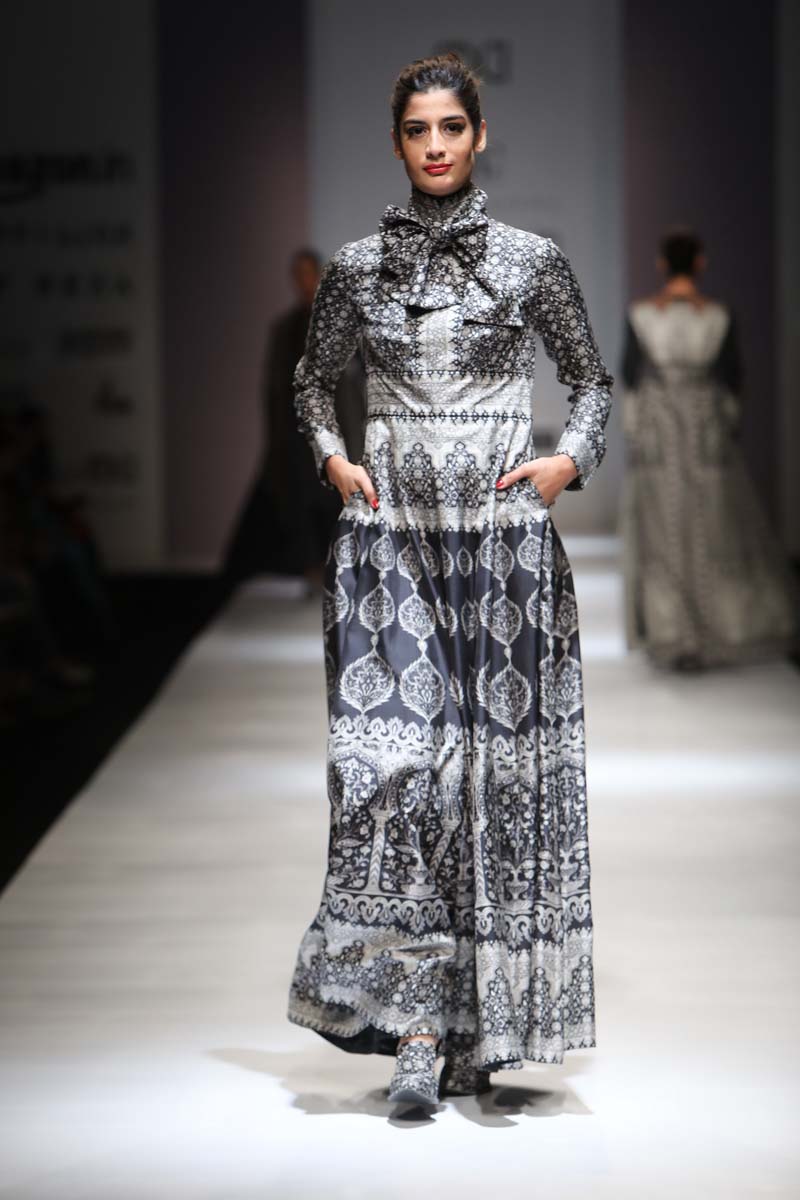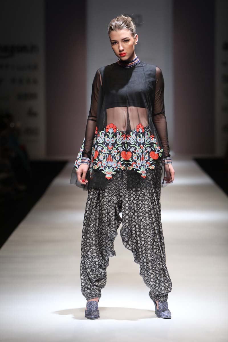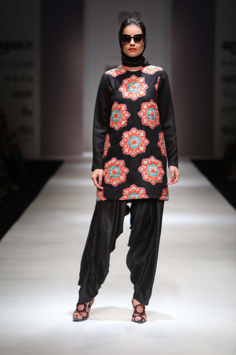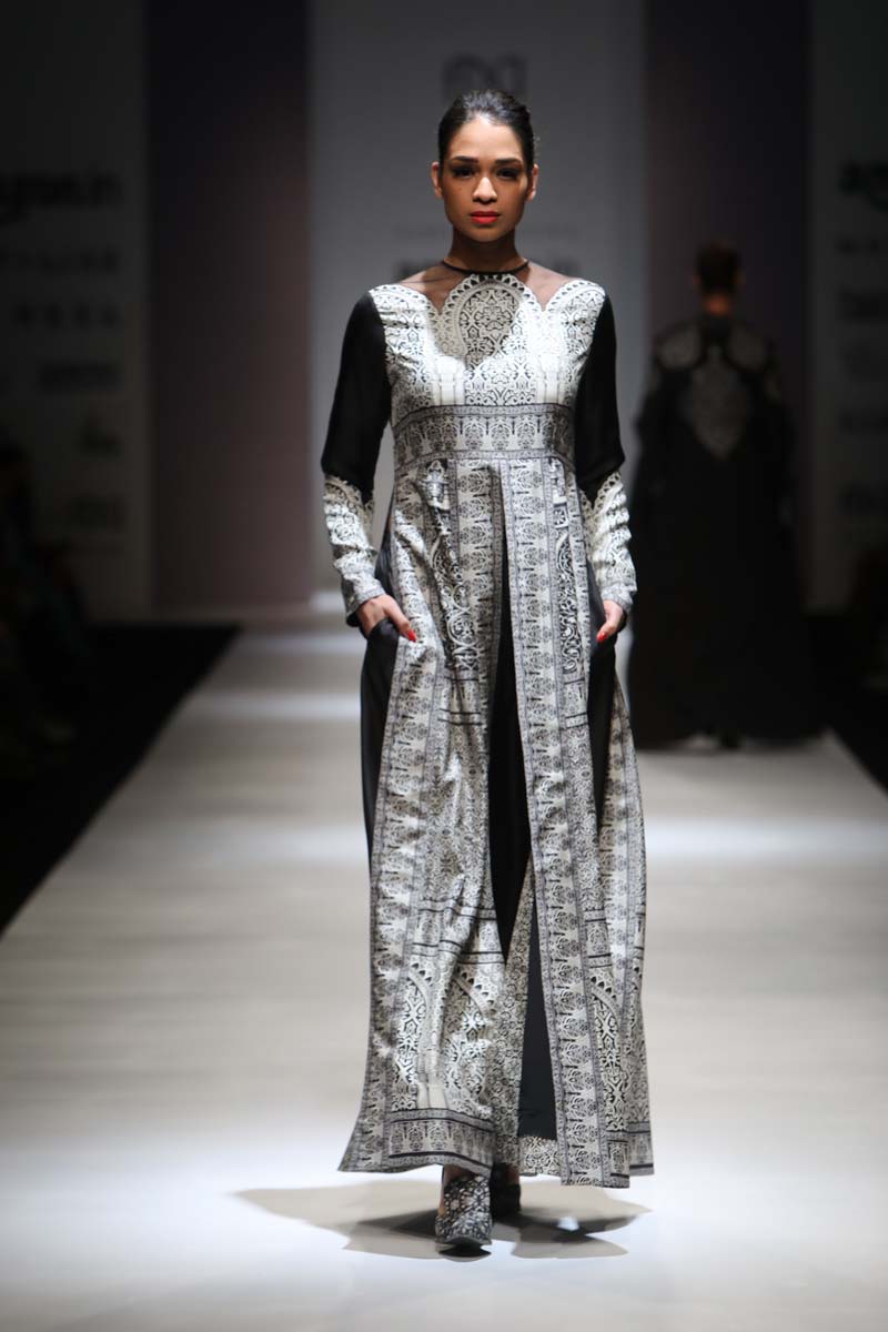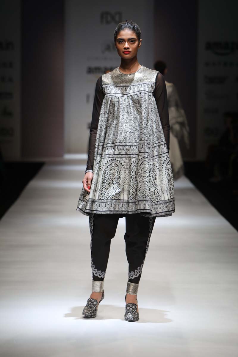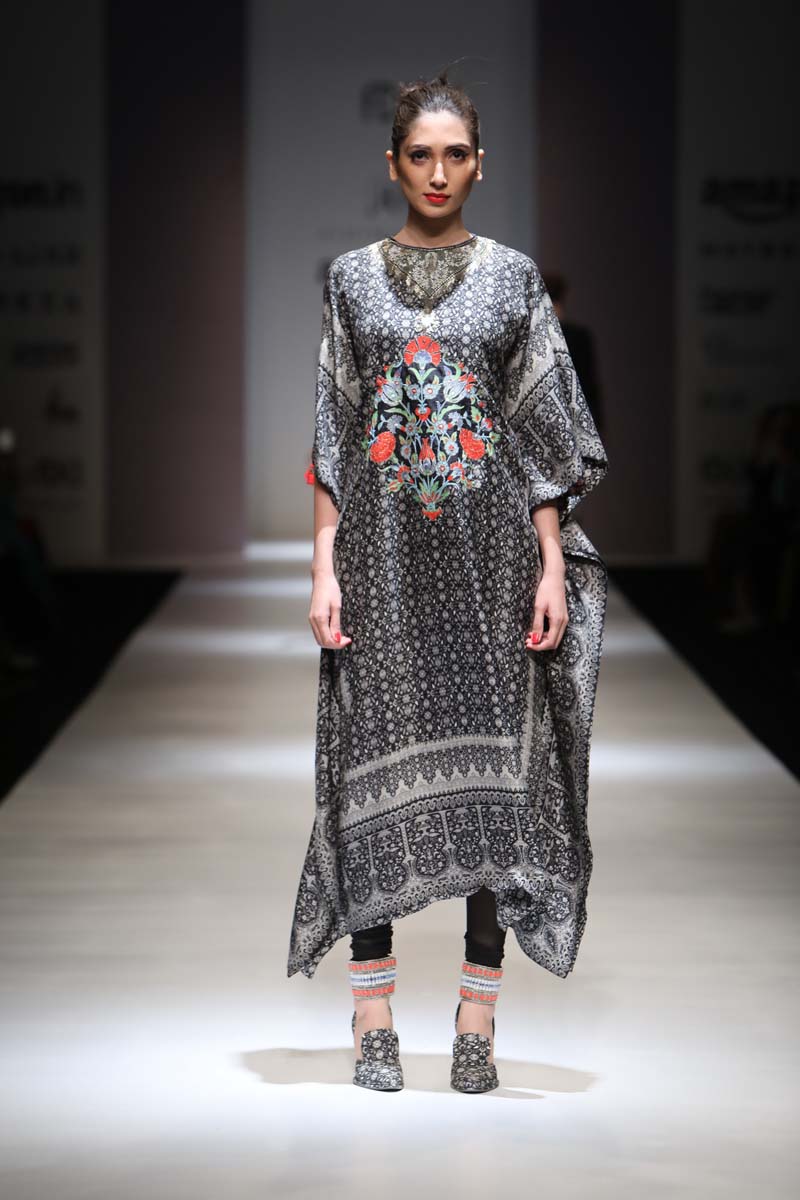 An opulent twist is conjured by interweaving motifs that adorn the architectural realms of Khiva in our Autumn – Winter 2017 collection, exhausting the influence of blue pottery and the vivid radiance of Shiva in his jatadhari edifice that comes to the fore in our visual ode to it – Charukesha. The palette descends rapidly through the iridescence of indigo and into an impermanence of blue, as pansy purples and turquoise are greeted by a contradiction of anthracite and eggshell, and hints of vermillion; like motifs that have withdrawn themselves into the Iznik tiled minarets of an ever traveling caravan of print exaggeration giving birth to a dimension of modernism that is captured through delicately sculptured skirts, quaint pashmina blouses, tribal gilets, asymmetric kurtas and deftly composed sarees that are juxtaposed with scaled metal details, luxe stone embellishments and appliqués painstakingly crafted to mark an excursion of patterns overlaid with yards of French tulle. The grandiose is muted into a quiet elegance of gravity, rooted in the quintessential AL woman, lending once again, an air of sophistication that embraces the classic with a touch of trend.