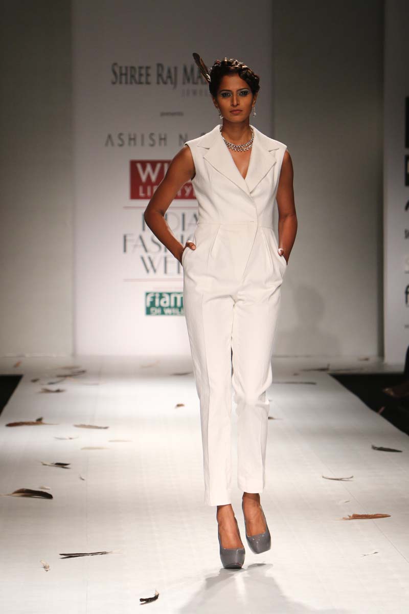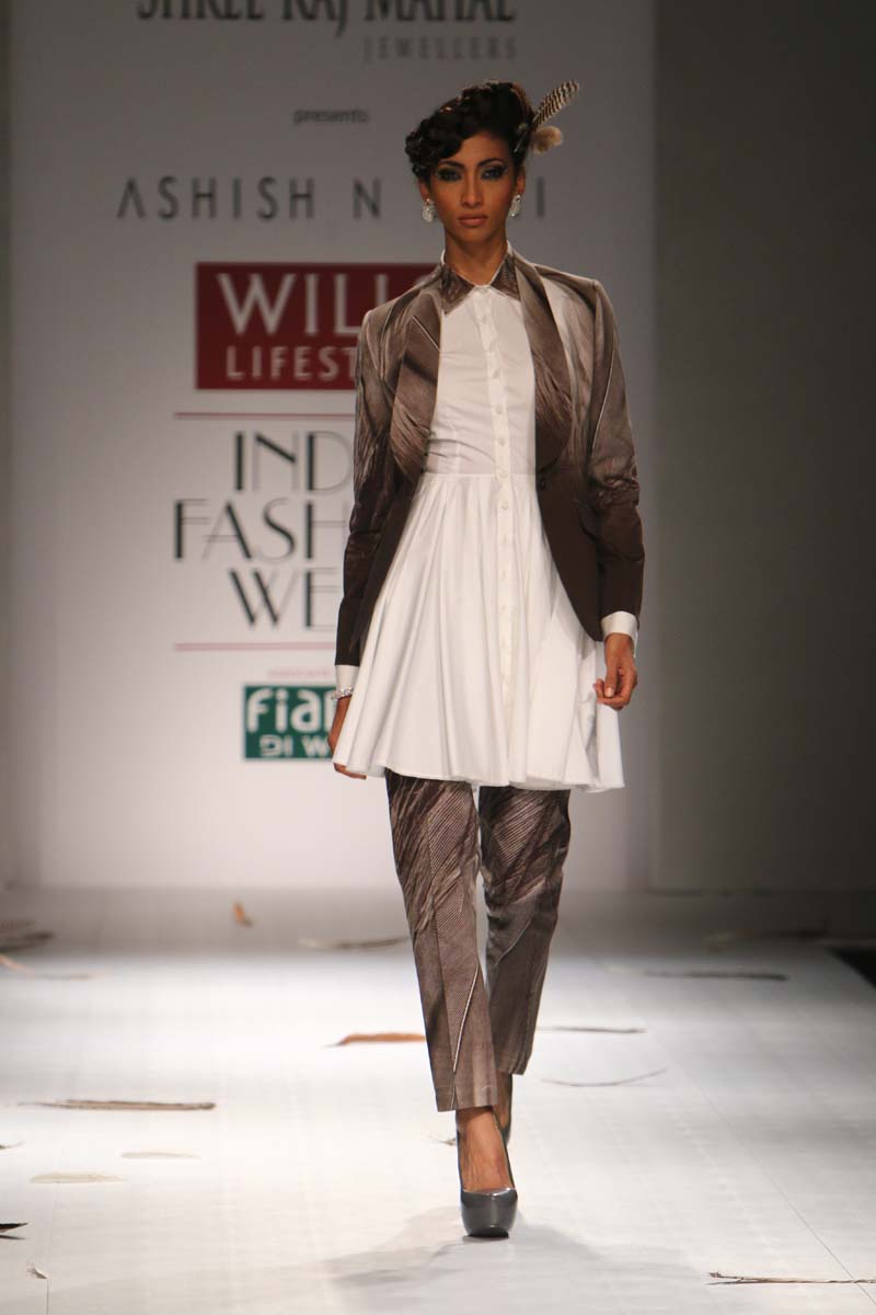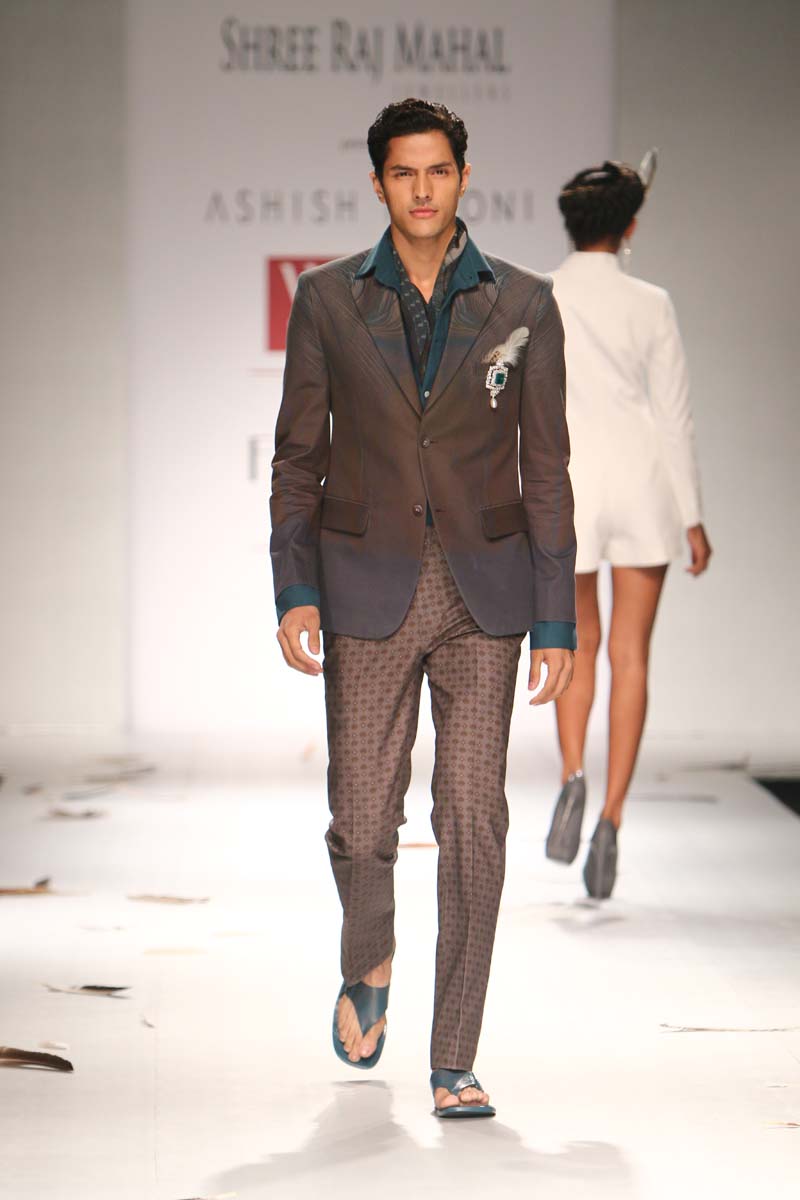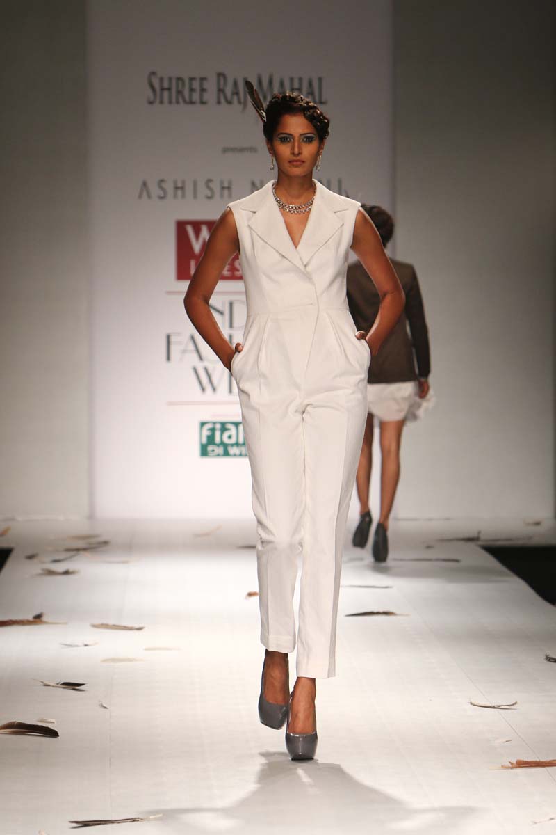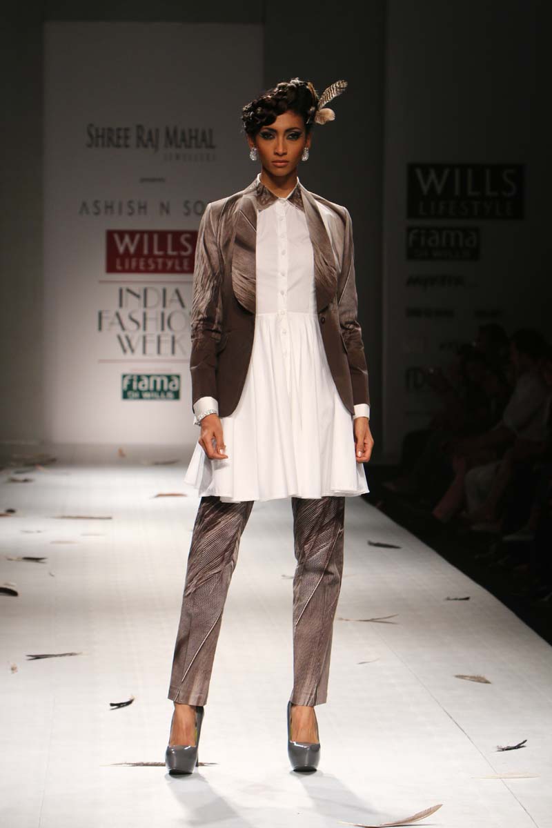 Ashish Soni launched his label in 1991 and ever since he is known for his sharply refined and deceptively simple sense of aesthetics.Immaculate tailoring & attention to detail derived from a menswear background remains the brands forte.n nHis signature lines are characterised by extreme simplicity, flawless lines, immaculate cuts and a perfect finish. His intuitive and original sense of style, combined with impeccable garment construction help create his signature style n nConceptual design as primary focus,experimentation with fabrics, infusing them with unusual textures and treatments are the hallmark of the brand. Embellishments are subsidiary and used with great restraint to highlight form.n nHe was the first Indian designer to be invited to hold a runway show at Olympus fashion week, New York and he showed at this platform consistently till 2009.At his debut in Olympus fashion week, New York, September 2005, he was hailed as “one of New Yorks new discoveries” by International Herald Tribunes Suzy Menkes.n nAshish N Sonis collection titled Plumage for Spring Summer 2015 is an amalgamation of prints which have been developed by digitising a variety of Feathers. Images of Long feathers, downy feathers, wing feathers have been superimposed one on the other to create placement printed garments.n nFeathers then of ostriches, flamingos, the Amazonian Macau and off course, the Indian peacock have been juxtaposed in perfect design, texture and balance to engineer the printed looks.n nFeathers of course are powerfully associated with sexuality, with display, with showing off as it were, as the male bird signals the female, with his colour and plumage. But it is Flight, soaring beautiful flight so often envied by human kind that above all is evoked by feathers. Qualities of gentleness and softness in some prints are counterposed by strong often-rigid feathers that stabilise flight.n nMinute handkerchief prints support the collection by creating a complete contrast between two completely different print schools.n nA group of white, teal and washed chambray blue pieces add solid relief to the ensembles. The collection is quite tailored and incorporates a lot of everyday separates, which have been put together keeping in mind pieces that are now synonymous with the label.n n