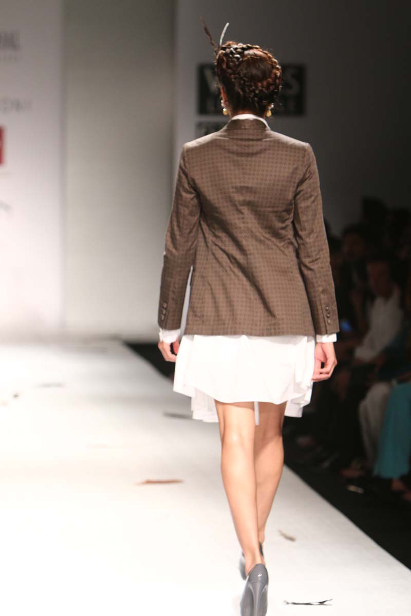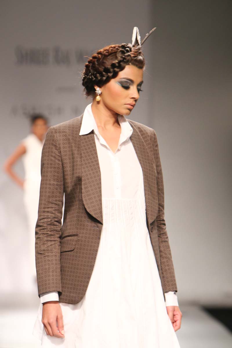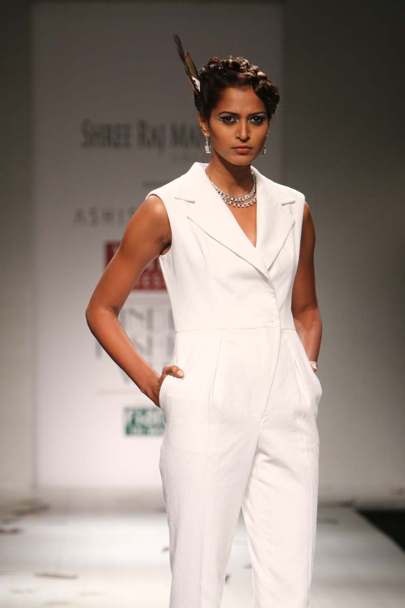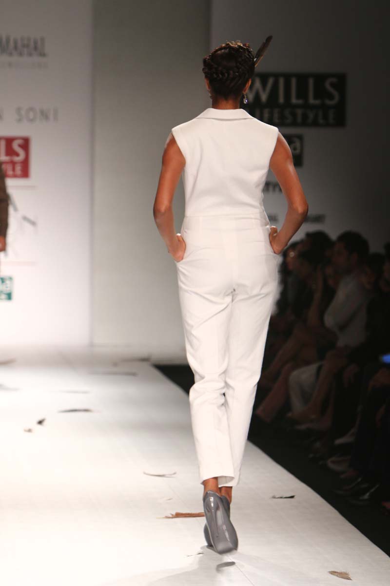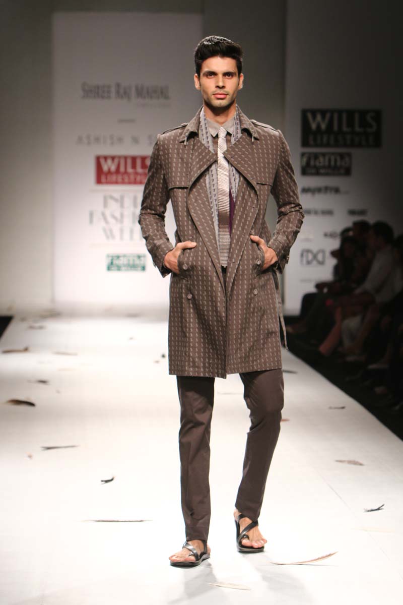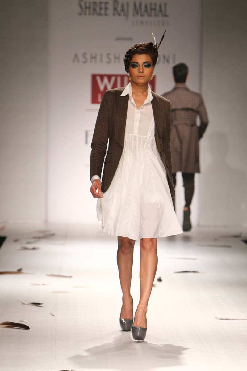 Ashish Soni launched his label in 1991 and ever since he is known for his sharply refined and deceptively simple sense of aesthetics.Immaculate tailoring & attention to detail derived from a menswear background remains the brands forte.n nHis signature lines are characterised by extreme simplicity, flawless lines, immaculate cuts and a perfect finish. His intuitive and original sense of style, combined with impeccable garment construction help create his signature style n nConceptual design as primary focus,experimentation with fabrics, infusing them with unusual textures and treatments are the hallmark of the brand. Embellishments are subsidiary and used with great restraint to highlight form.n nHe was the first Indian designer to be invited to hold a runway show at Olympus fashion week, New York and he showed at this platform consistently till 2009.At his debut in Olympus fashion week, New York, September 2005, he was hailed as “one of New Yorks new discoveries” by International Herald Tribunes Suzy Menkes.n nAshish N Sonis collection titled Plumage for Spring Summer 2015 is an amalgamation of prints which have been developed by digitising a variety of Feathers. Images of Long feathers, downy feathers, wing feathers have been superimposed one on the other to create placement printed garments.n nFeathers then of ostriches, flamingos, the Amazonian Macau and off course, the Indian peacock have been juxtaposed in perfect design, texture and balance to engineer the printed looks.n nFeathers of course are powerfully associated with sexuality, with display, with showing off as it were, as the male bird signals the female, with his colour and plumage. But it is Flight, soaring beautiful flight so often envied by human kind that above all is evoked by feathers. Qualities of gentleness and softness in some prints are counterposed by strong often-rigid feathers that stabilise flight.n nMinute handkerchief prints support the collection by creating a complete contrast between two completely different print schools.n nA group of white, teal and washed chambray blue pieces add solid relief to the ensembles. The collection is quite tailored and incorporates a lot of everyday separates, which have been put together keeping in mind pieces that are now synonymous with the label.n n
