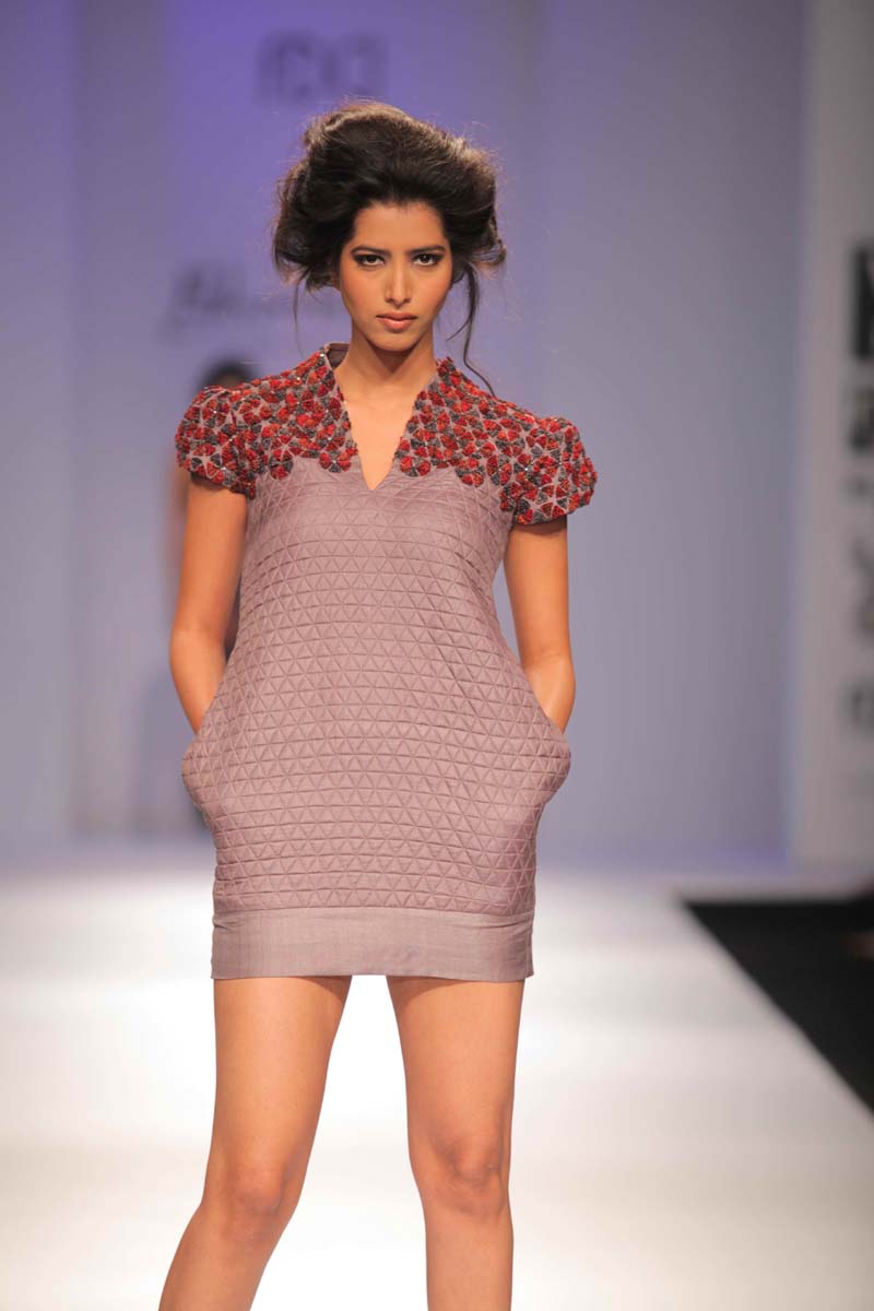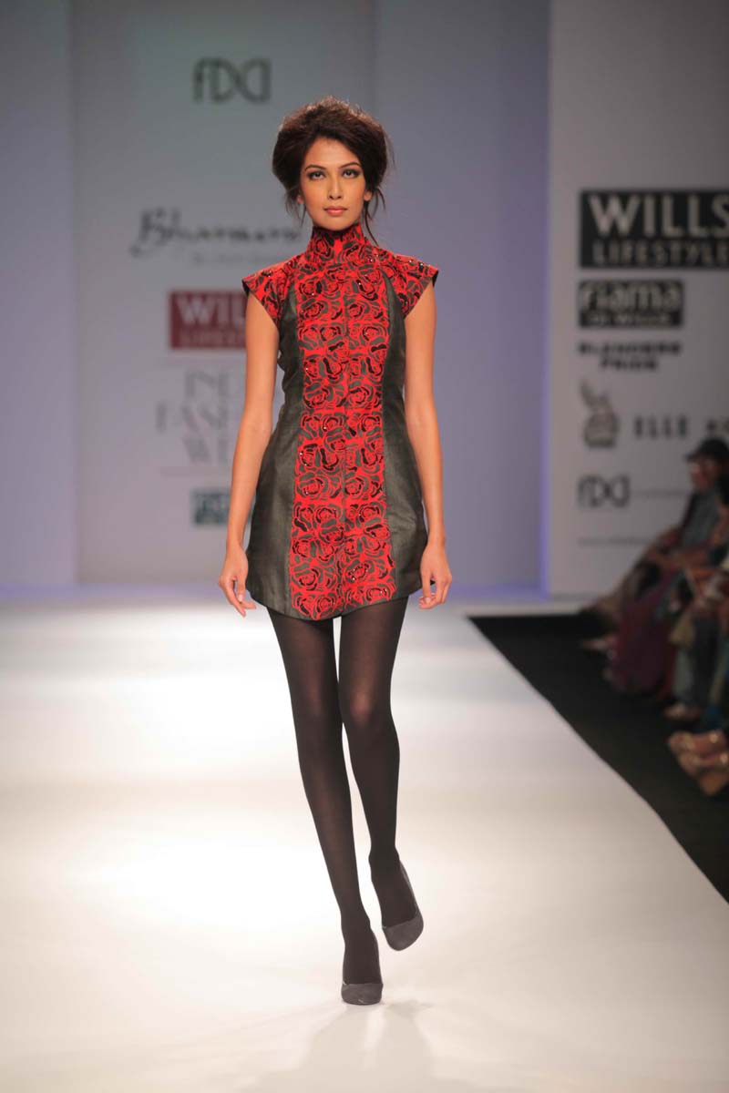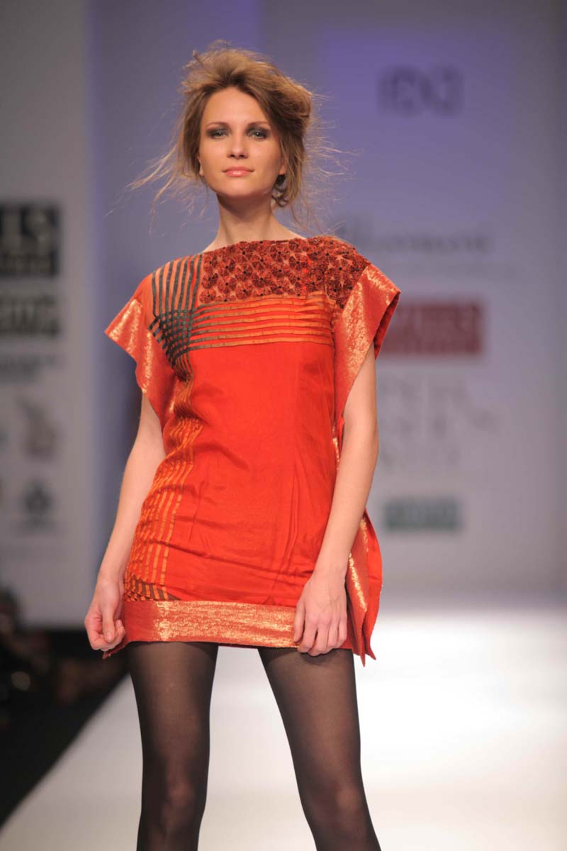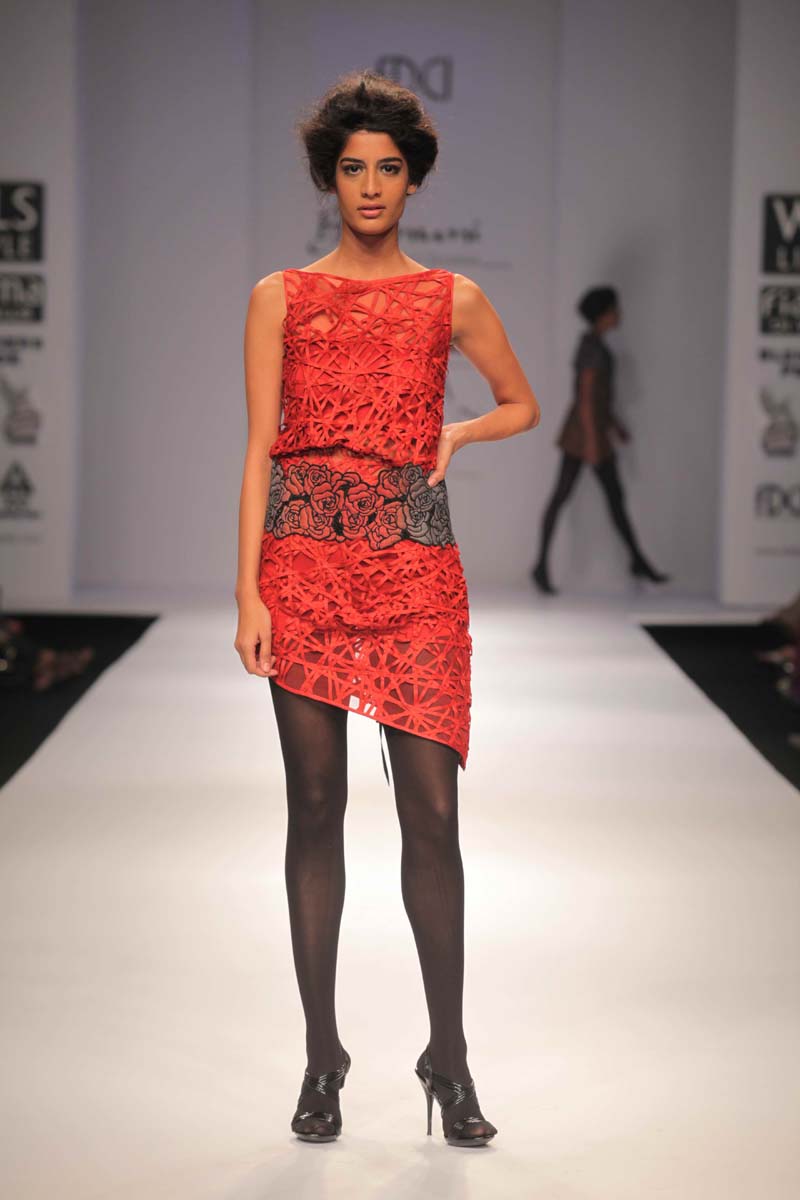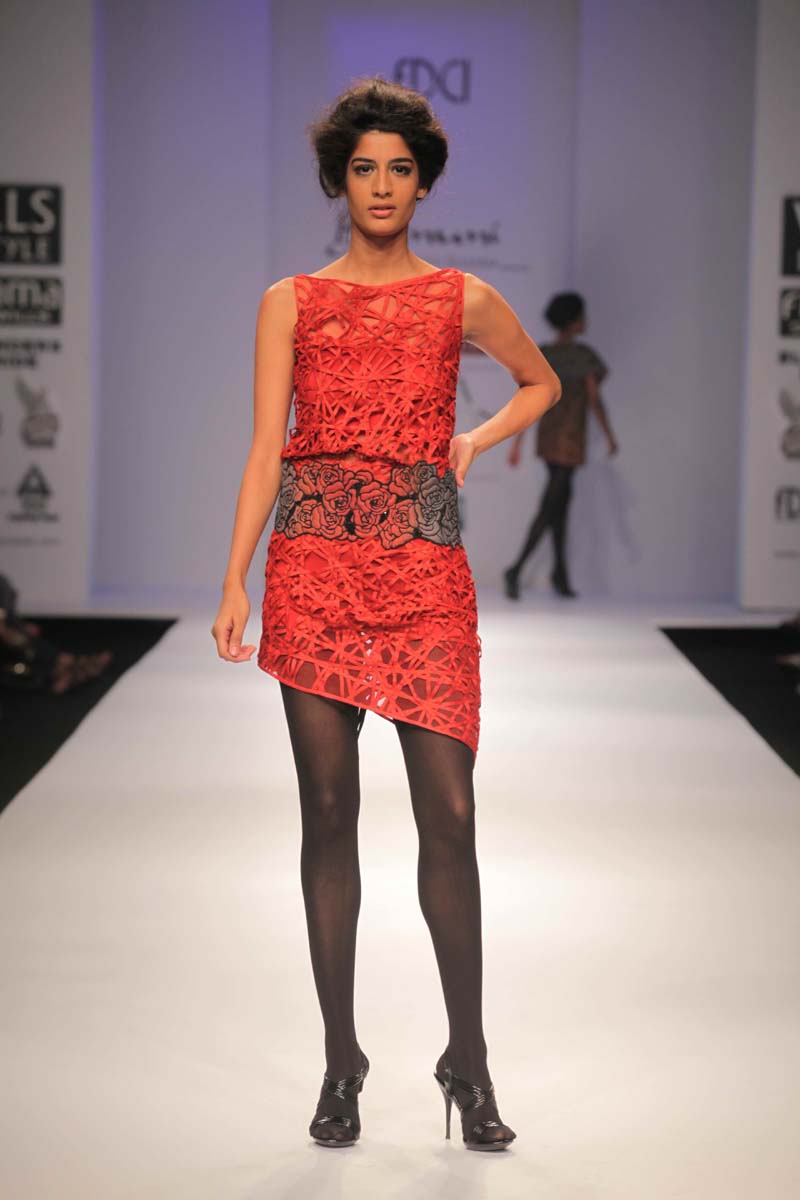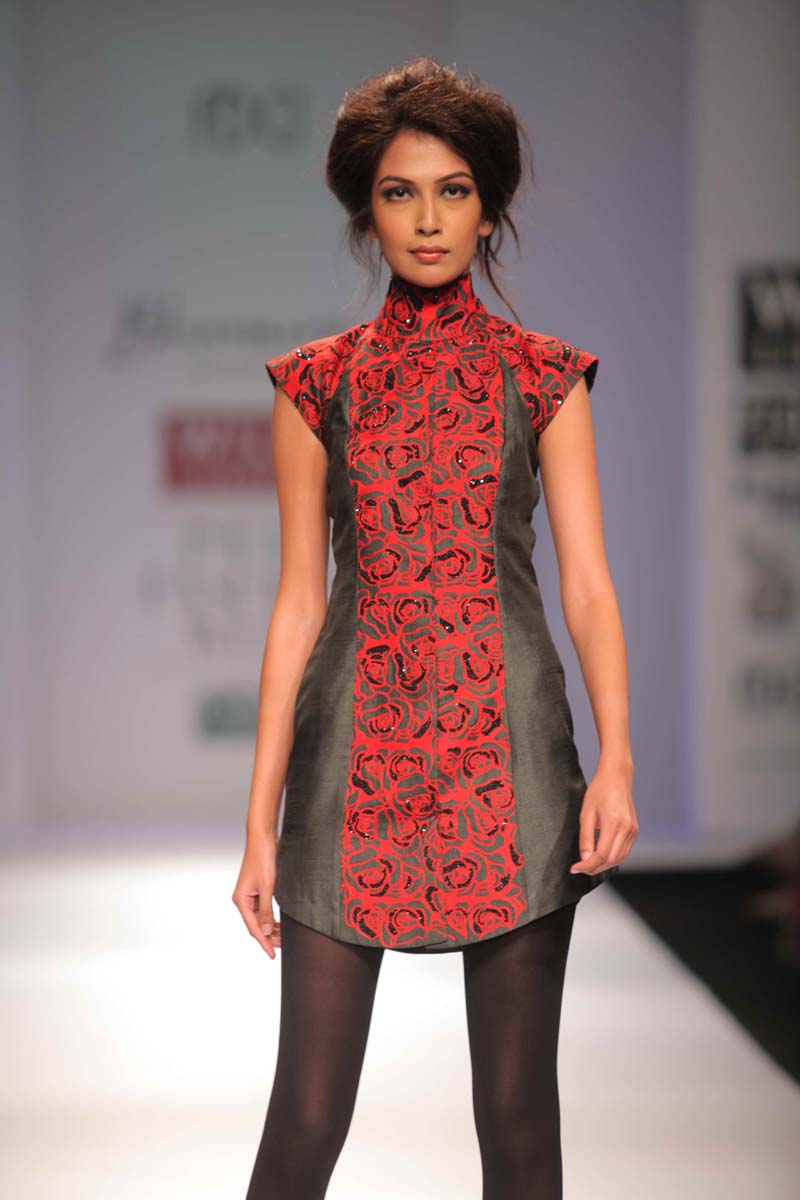 Designer Jyoti Sharma presents her new A/W 12 collectionnentitled Raakh that displays the serious moods and momentsnto define her inspiration.nThis season her entire collection has been emphasized on thengeometric floral art work which is based on black and greys withnthe splash of colors like blood red, orange and rust. The Collectionnis perfect blend of stylish silhouettes, modern dresses alongnwith the drapes forms with lot of fabric texturisation and surfacenornamentation.nHer custom made collections in Indian wear & western prêt arenavailable at her own flagship store in New Delhi & Kimaya, Heritage,nCollage, Evoluzione, Fuel, Amara, Mogra & Designer Studio, Aura,nArchain Dexin, Mumbai Se, Shenaai, Onitaa, Fashion Corner.