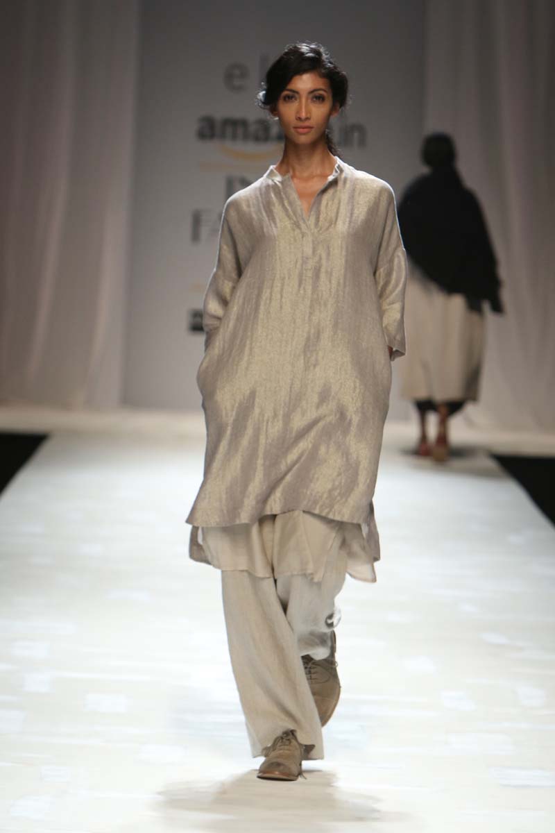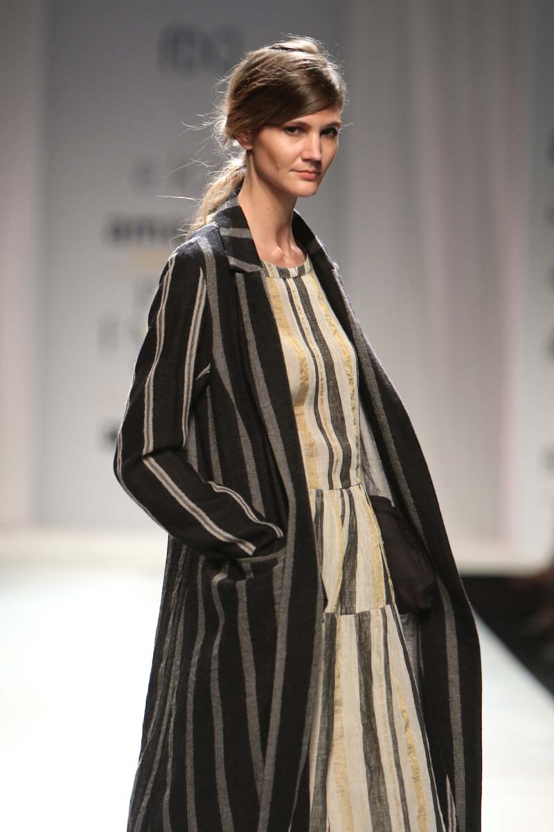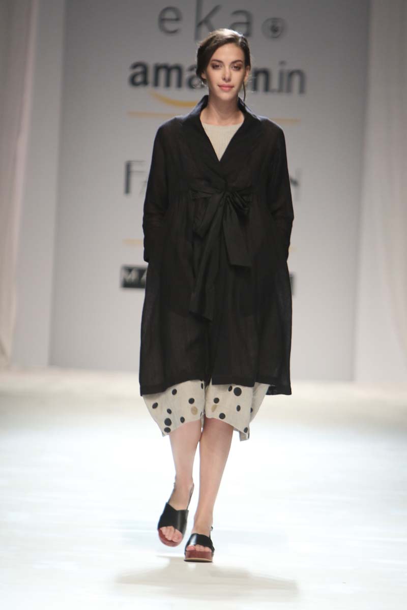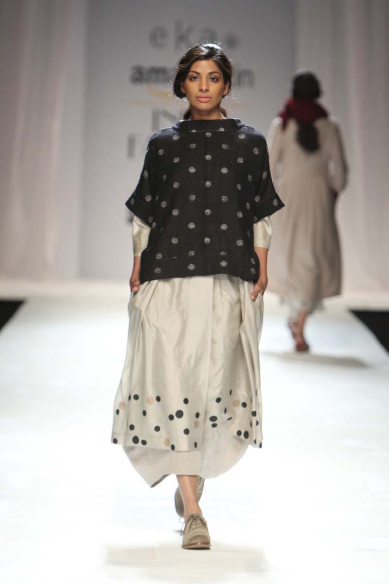 100% boiled merino wool, blends of linen wool & silk, handwoven linen & cotton khadi block printed & woven with yarns of zari to add the luxe effect to laid back, voluminous feminine looks. Mix of big & small polka in monochrome and gold accents. Soft layering adds a dramatic touch, while feminine shapes are mixed with masculine separates.