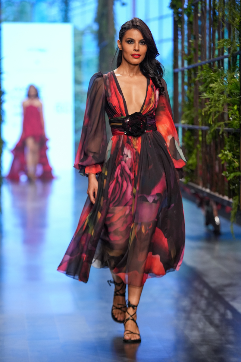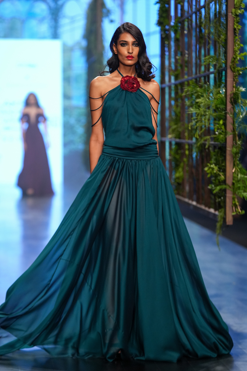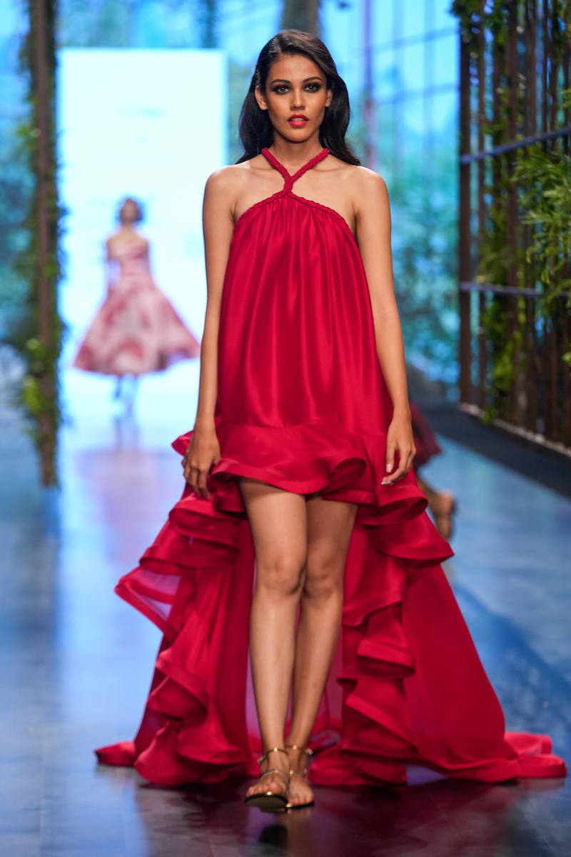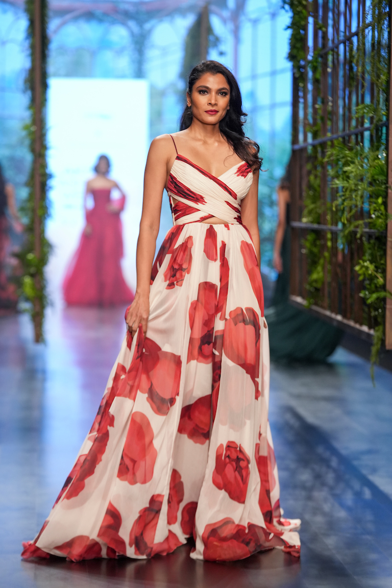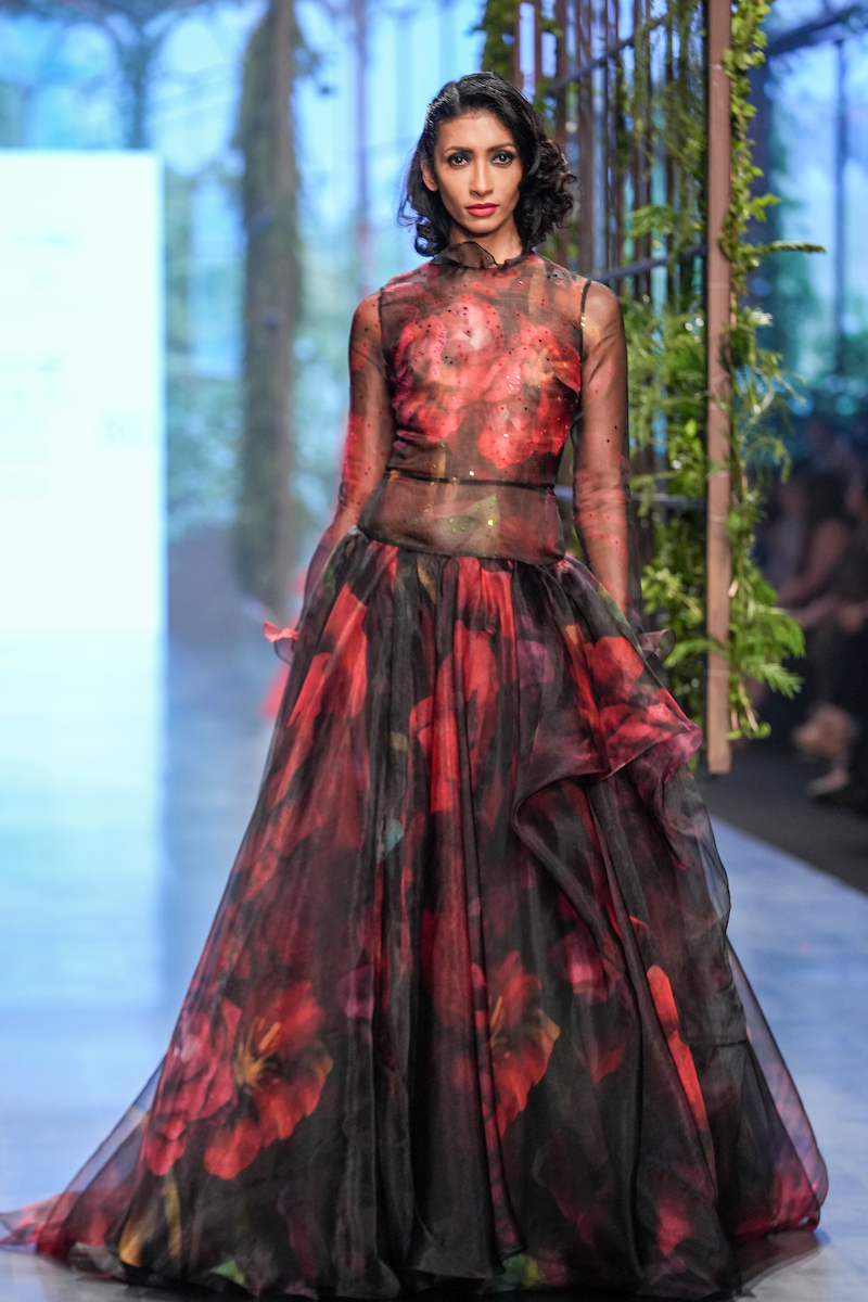 This year’s spring-summer line has a richly dark and dreamy tone to it, inspired by the starkly contrasting colours of night time botanical illustrations. The styles are fluid and breezy, depicting glamour at its peak, although with a certain laid back elegance. Light airy dresses and flowing gowns have been fashioned in a rich colour palette using featherweight fabrics such as chiffons, crepes and organzas. Easy to wear dresses and jumpsuits in signature floral prints along with red carpet worthy Grecian silhouettes have been designed in vintage ivory and standout lipstick-red amongst other deep jewel tones.